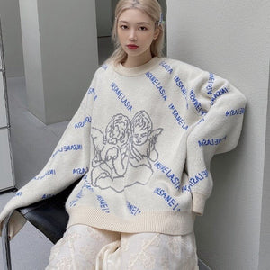 Angel Pattern Women Sweater Oversized Streetwear Retro Lazy Pullover Trendy Brand O Neck Fashion Harajuku Sweaters 2021 Winter