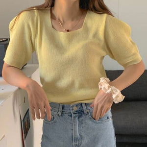 Summer Elegant Solid Women Square Collar Sueter Mujer Korean Knitted Puff Short Sleeve Female Sweaters Vintage Thin Pullovers