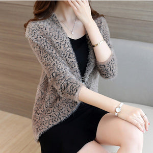Women's Fashion Leopard Cashmere Sweaters Long Sleeve V Neck Casual Loose Cardigans knitting Thicken Tops