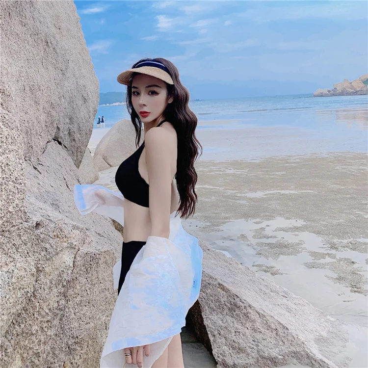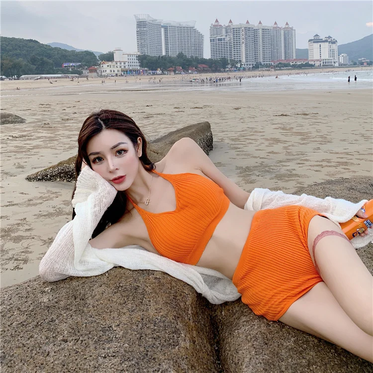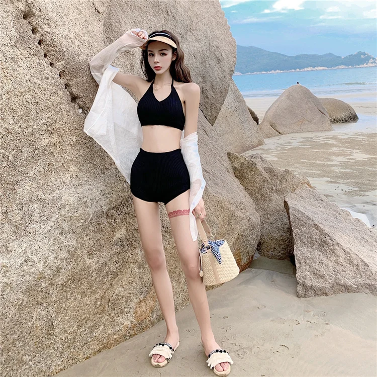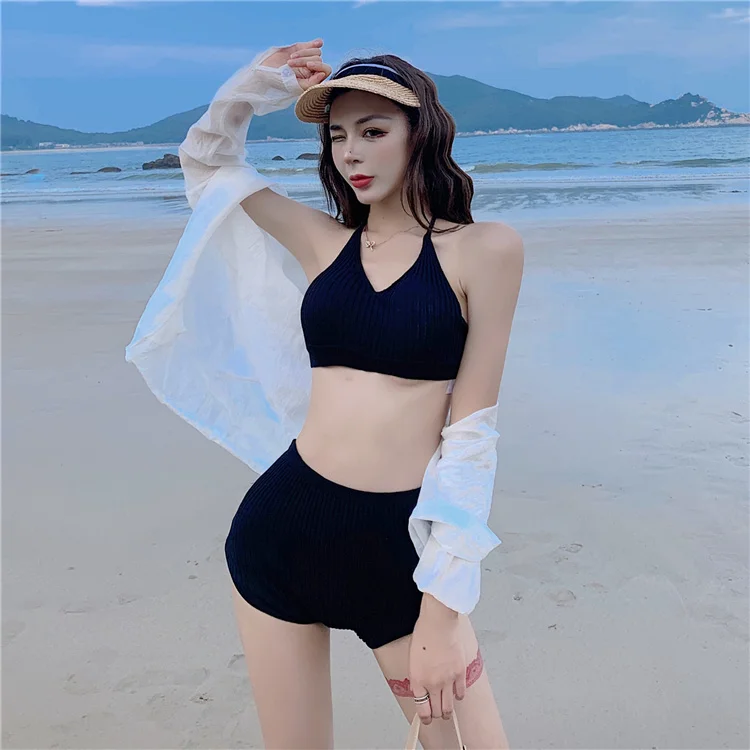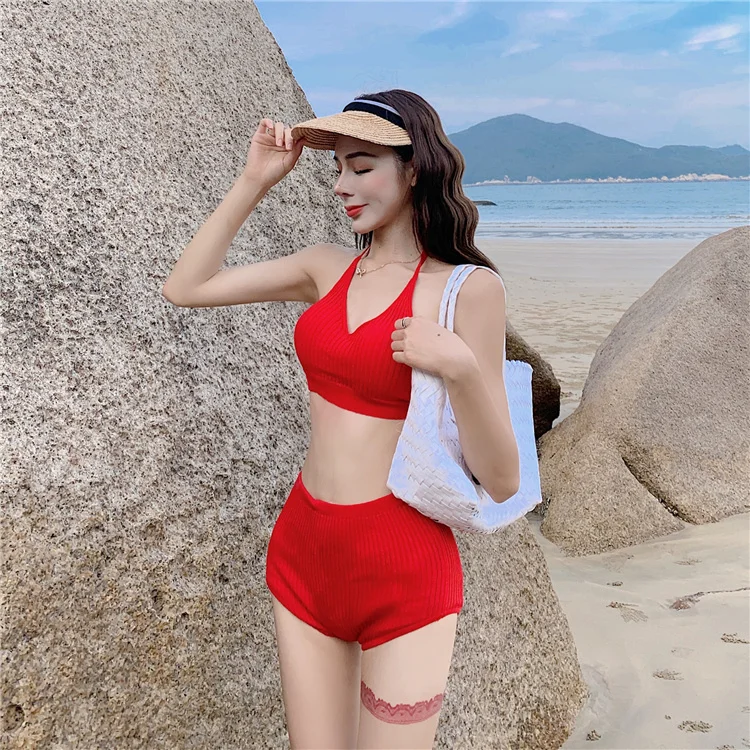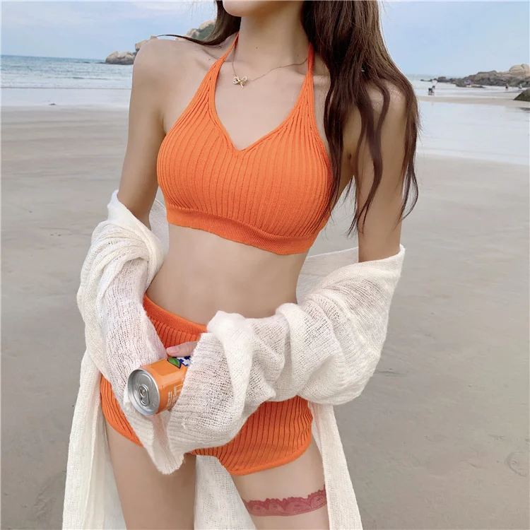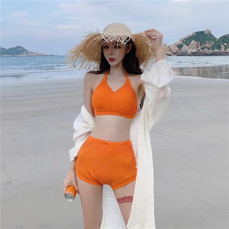 Knitted Halter High Waist Slimming Swimsuit Korean Ins Style 2021 New Bikini Sexy Hot Spring Swimsuit For Swimwear Women Beach
