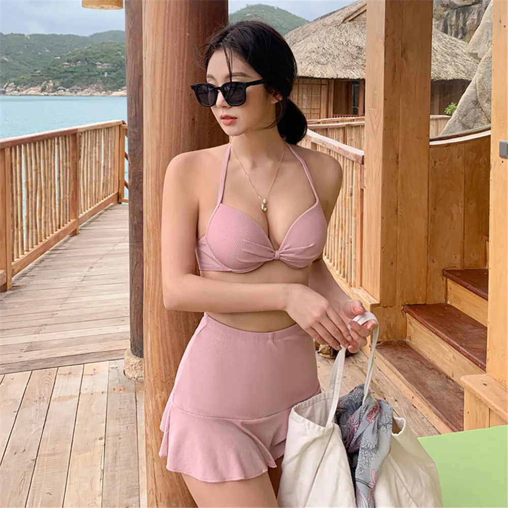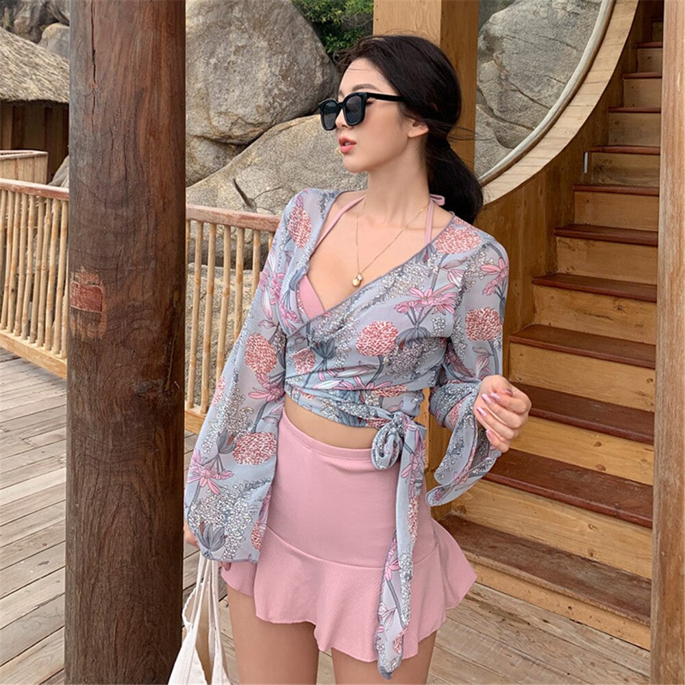 Korea Bikini Women Solid Swimwear Skirted Swimsuit Long Sleeve Push Up Biquini High Waist Bikinis Cover Up Bathing Suit Ruffle