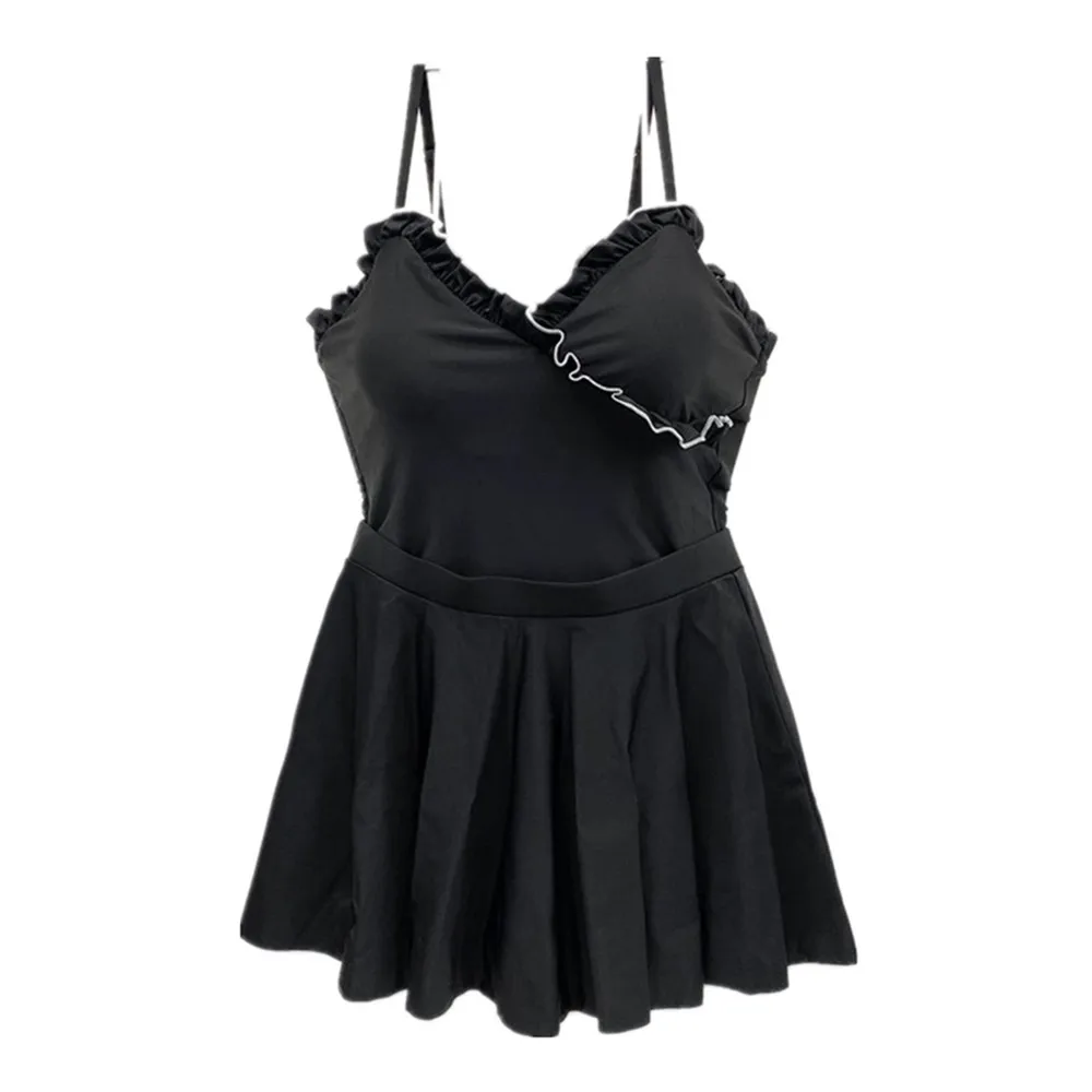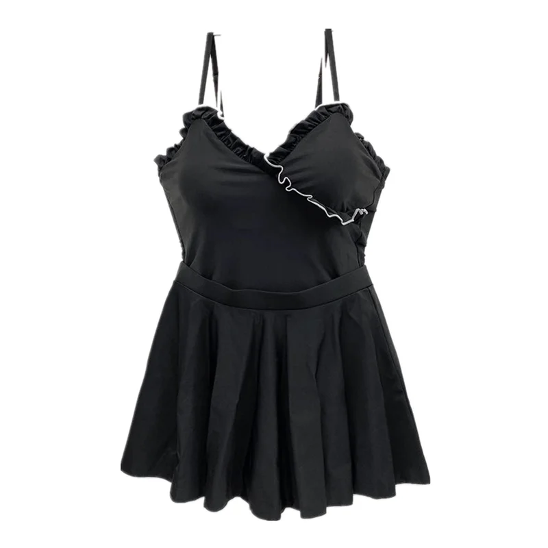| Korea Style One Piece Swimsuit Women Solid Swimwear Ruffle Monokini With Skirt Skirt Black Open Back Trikini Pad Bathing Suit |