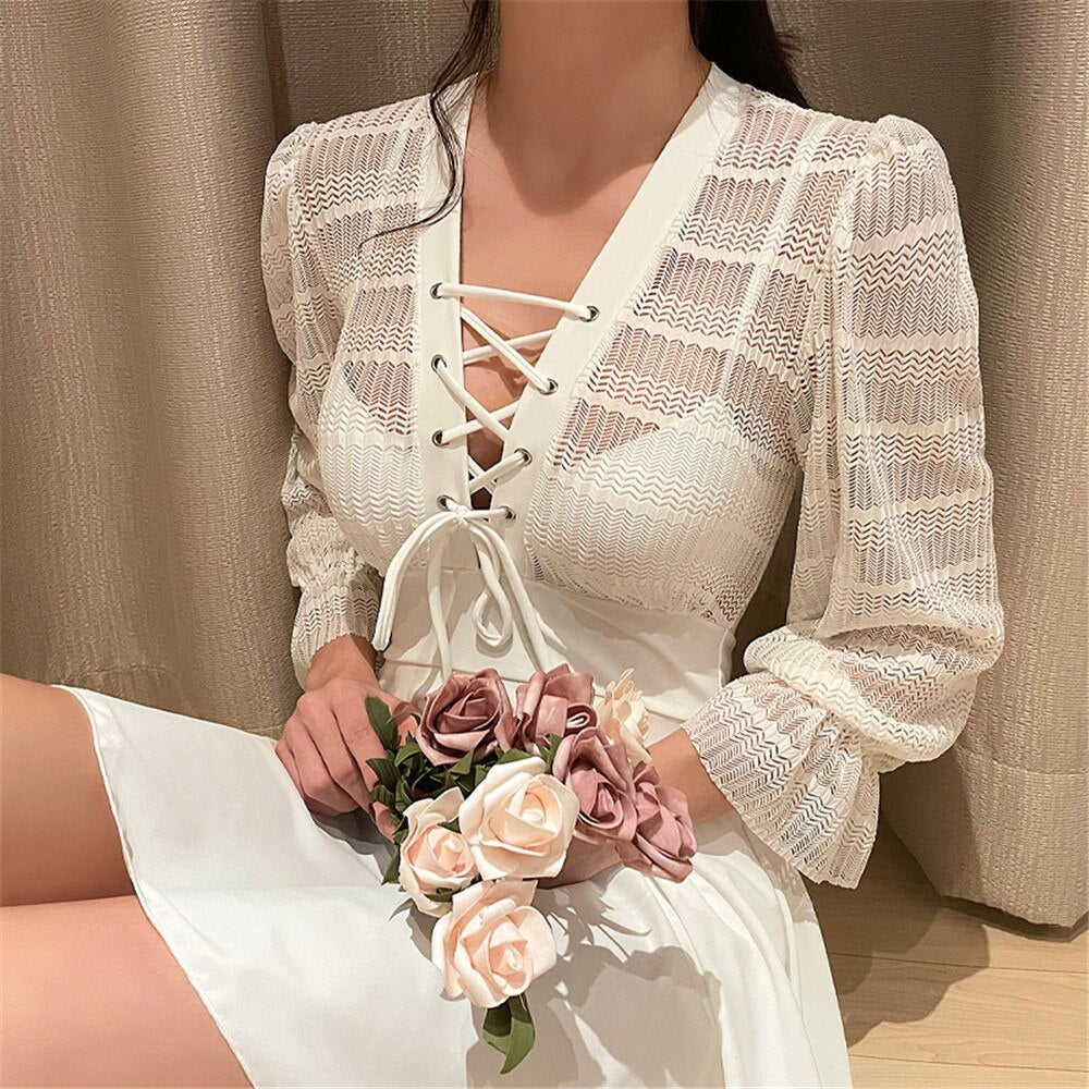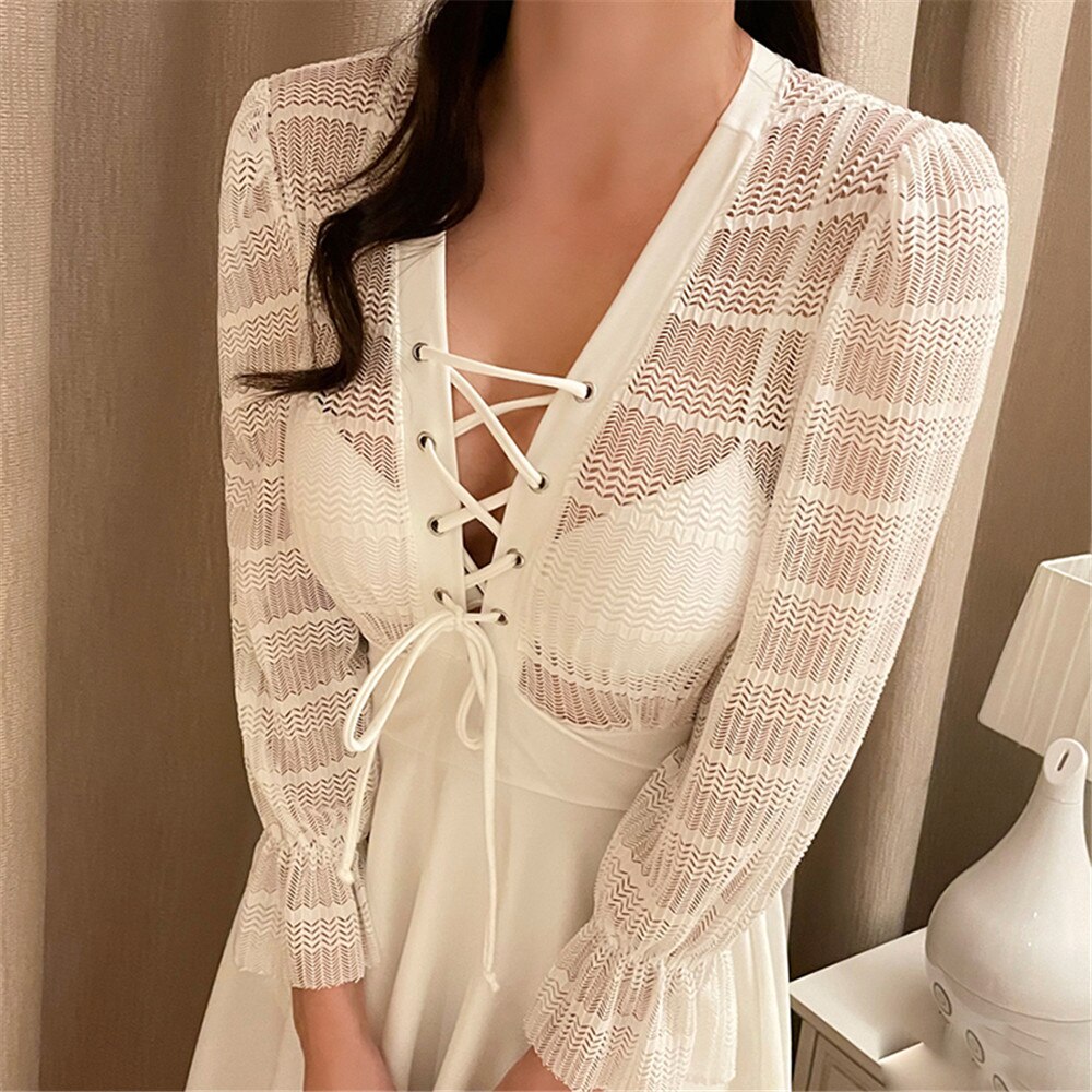 | Lace One Piece Swimsuit Women Solid Swimwear Long Sleeve Monokini Mesh Swim Suit Korea Skirted Trikini Lace Up Bathing Suit Pad |
