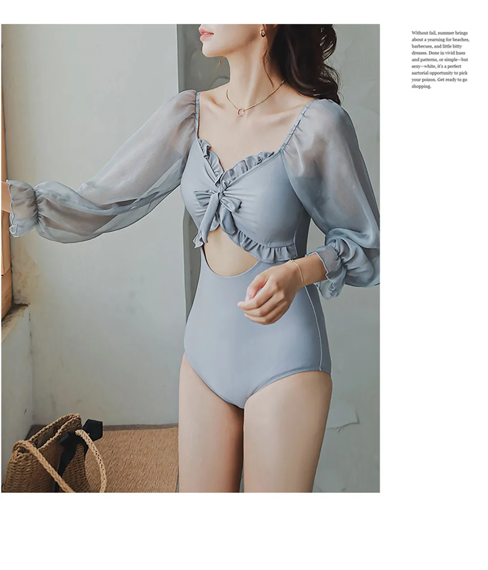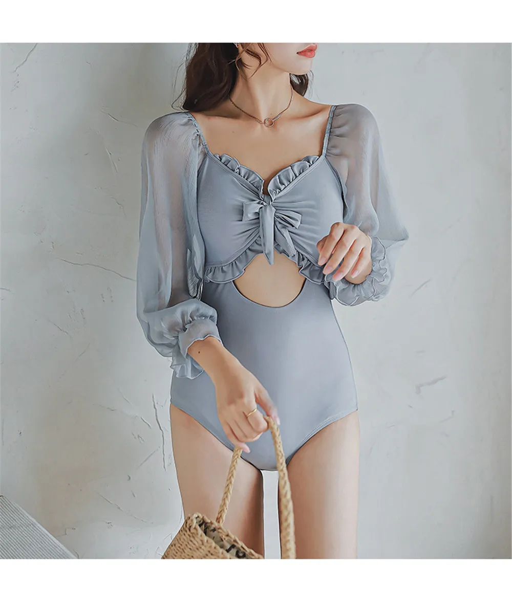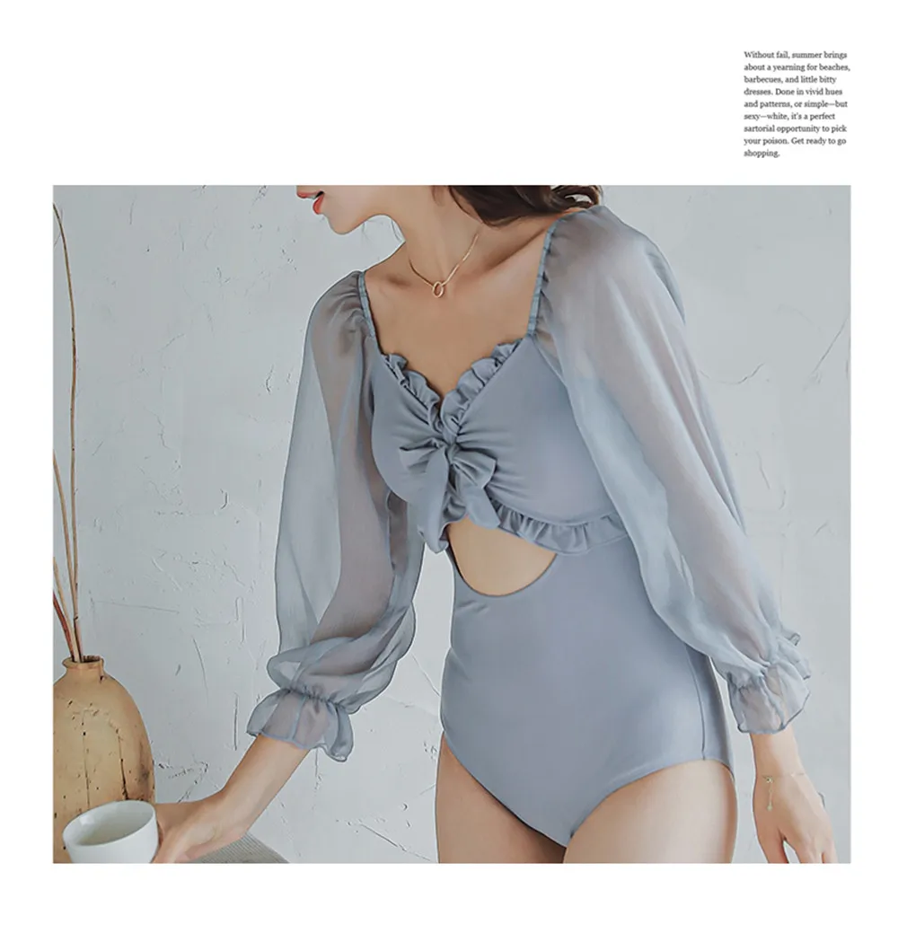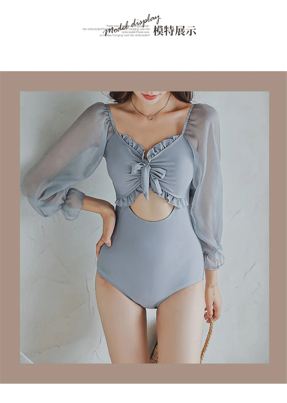| Long Sleeve One Piece Swimsuit Women Solid Swimwear Ruffle Monokini Lace Swim Suit Ruffle Bathing Suit Pad Push Up Korea Style |
