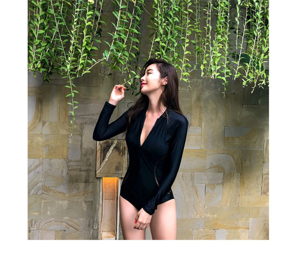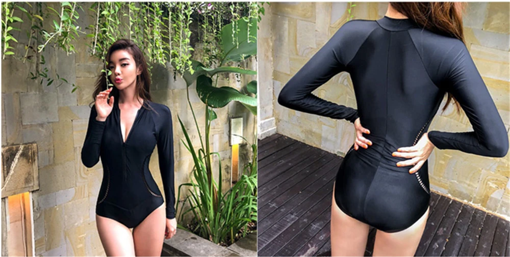 | Long Sleeve One Piece Swimsuit Women Solid Swimwear Zipper Monokini High Neck Swim Suit Korea Bathing Suit Push Up Black Pads |