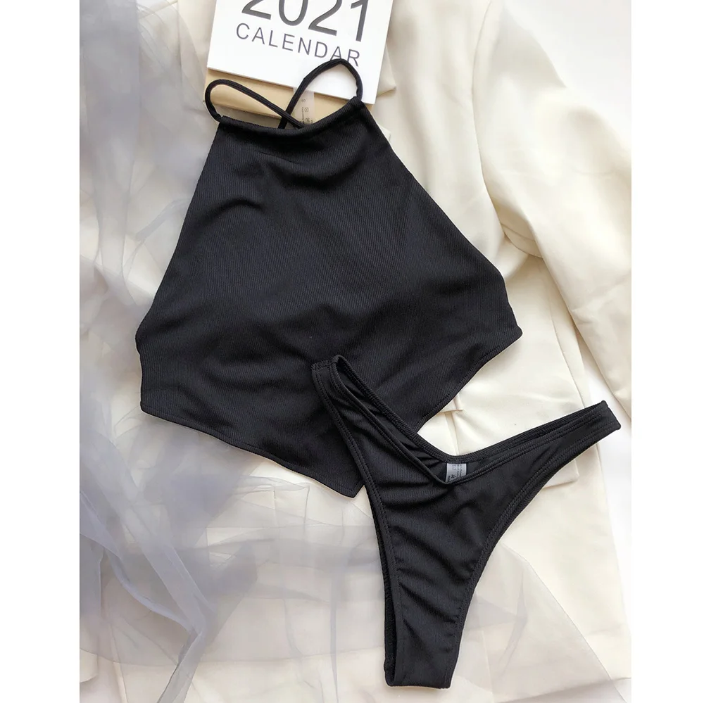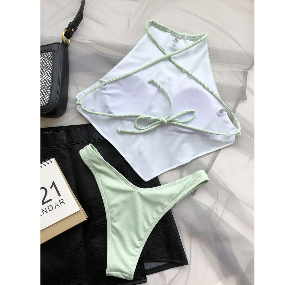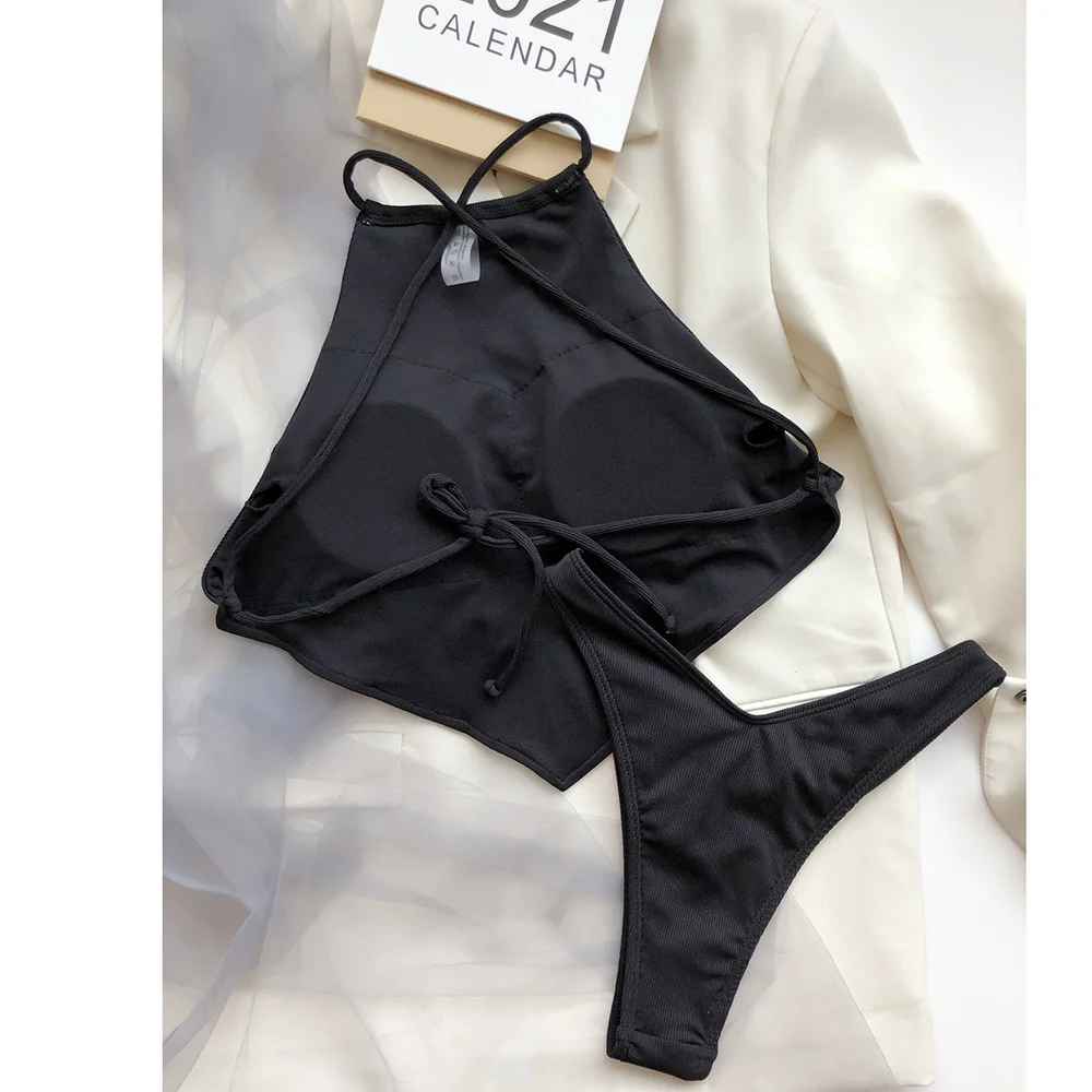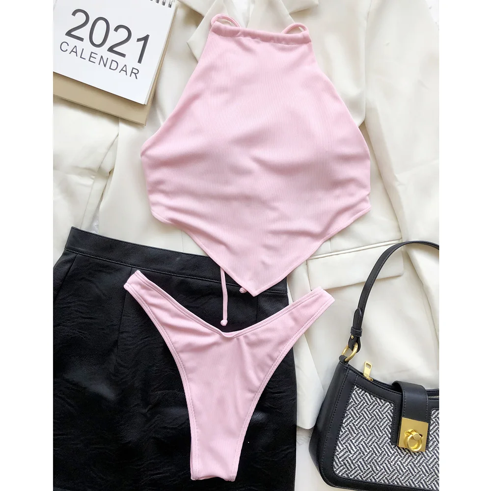 New Bellyband Swimsuit Sexy Thong Swimwear Women BathingSuit Halter Top Push Up Set Biquini Solid Female Two-piece Bather Bikini