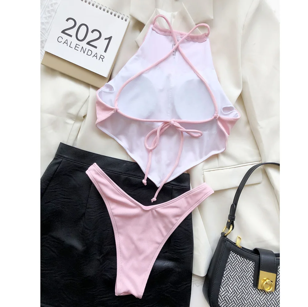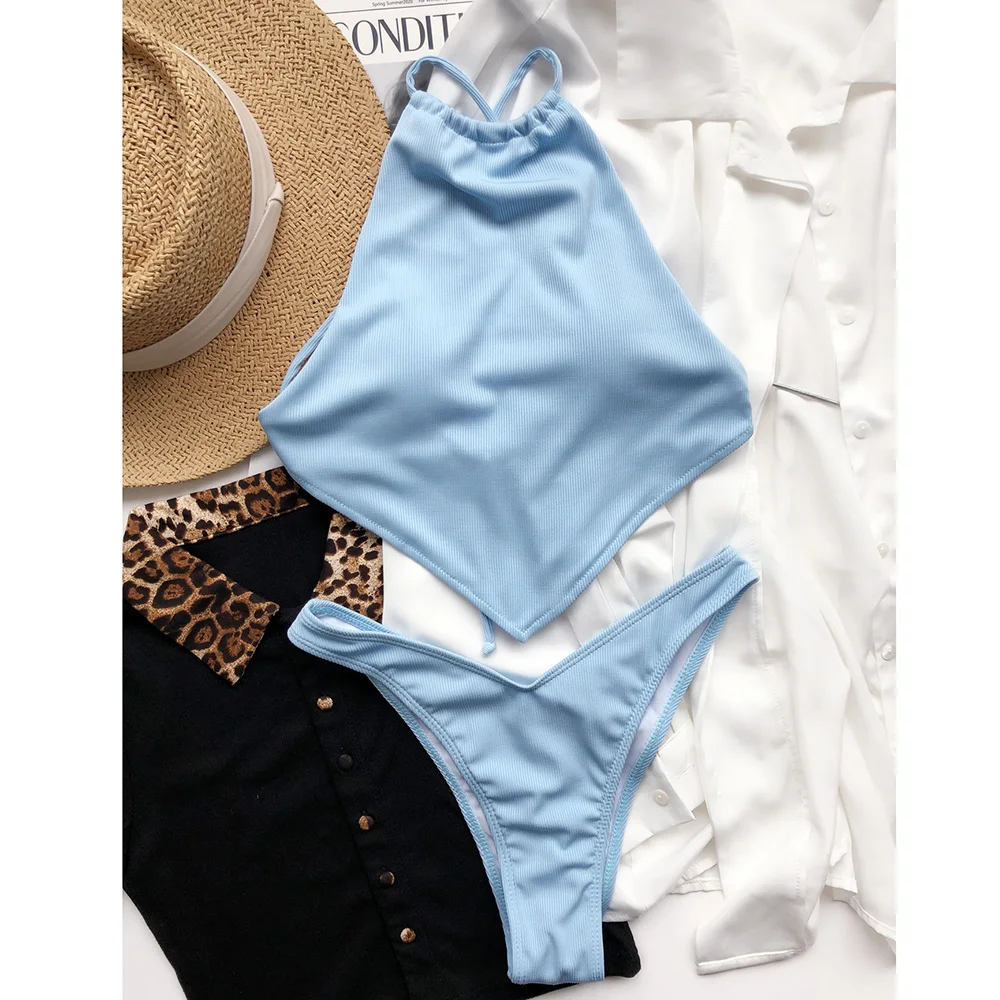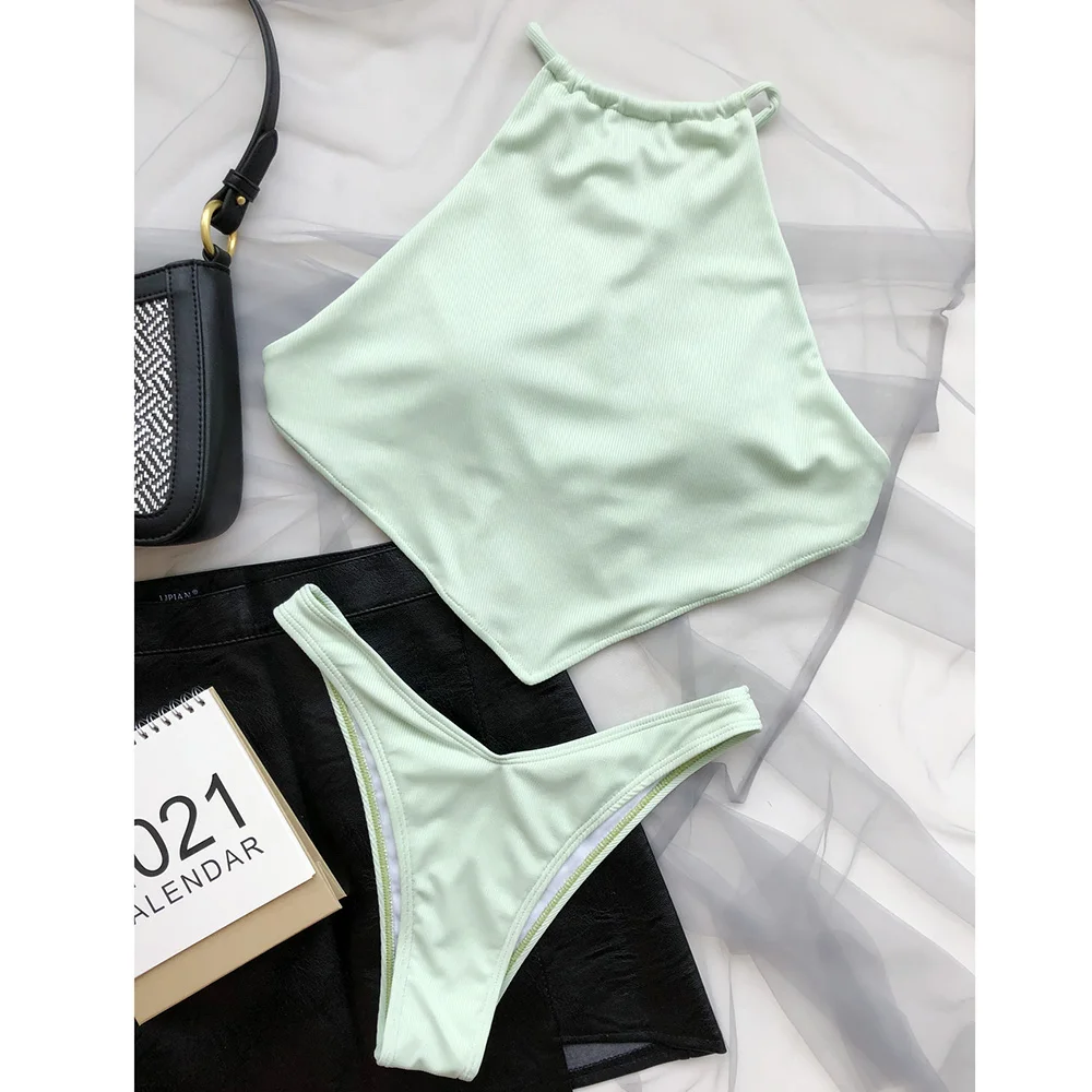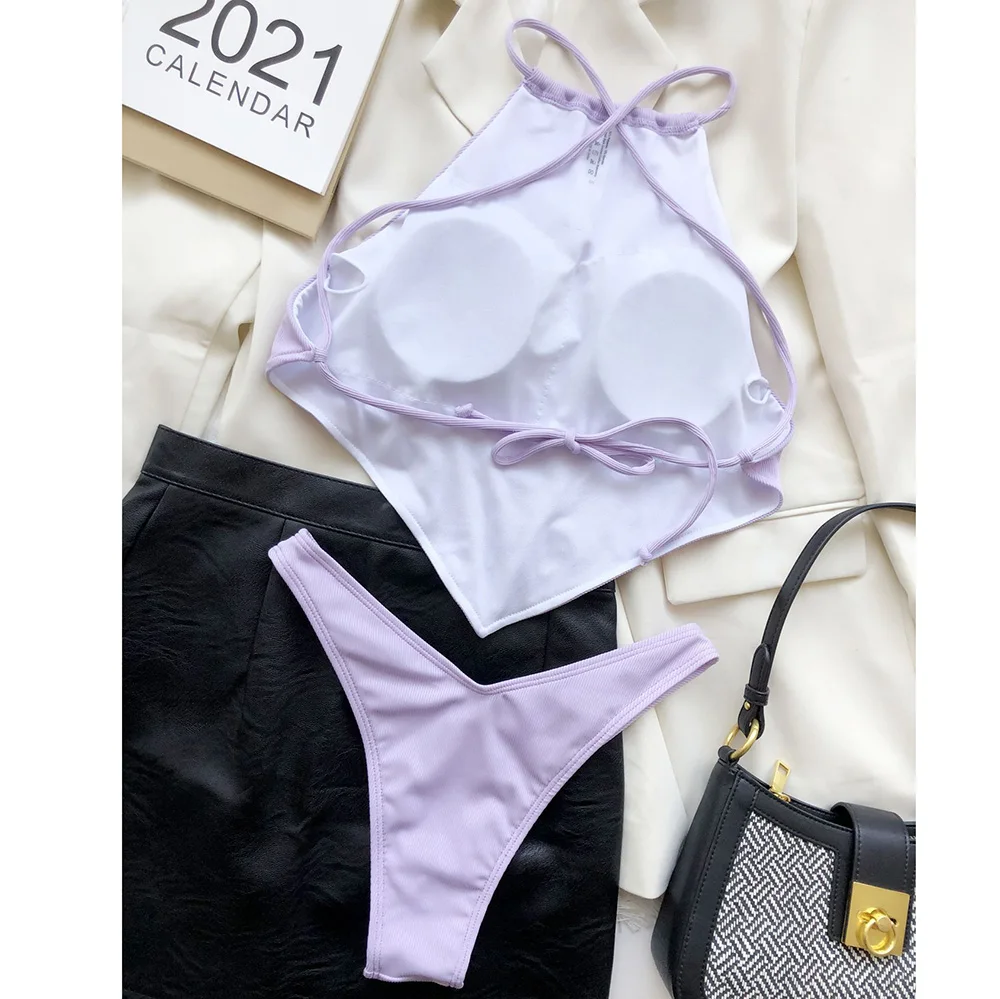 New Bellyband Swimsuit Sexy Thong Swimwear Women BathingSuit Halter Top Push Up Set Biquini Solid Female Two-piece Bather Bikini