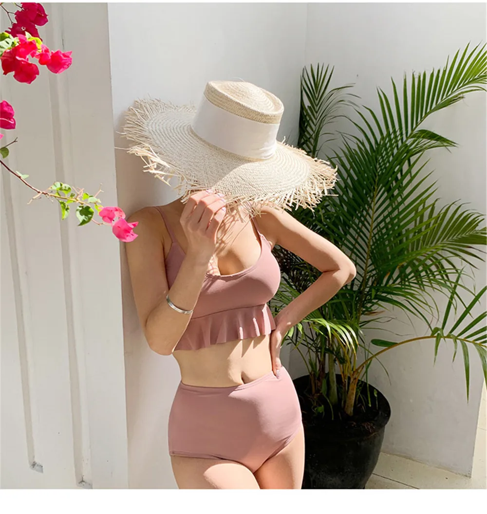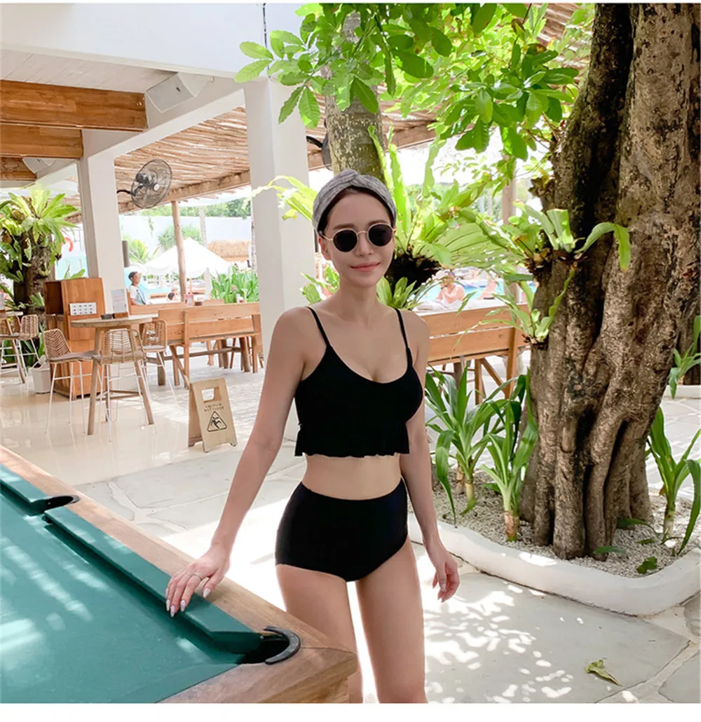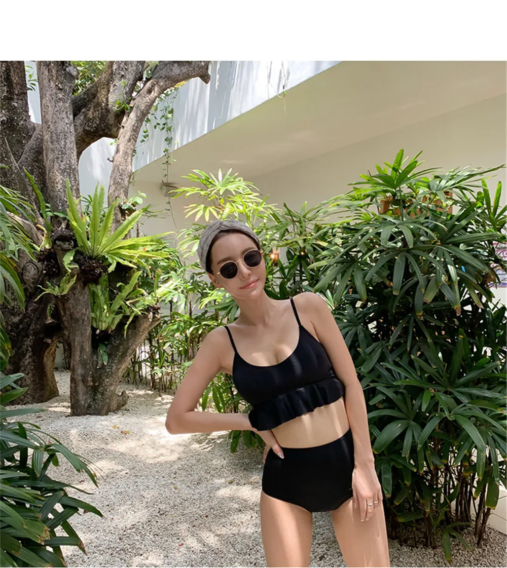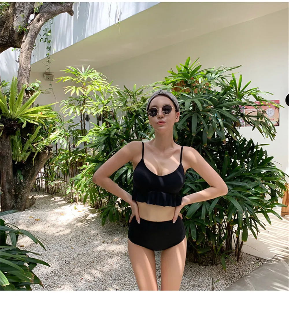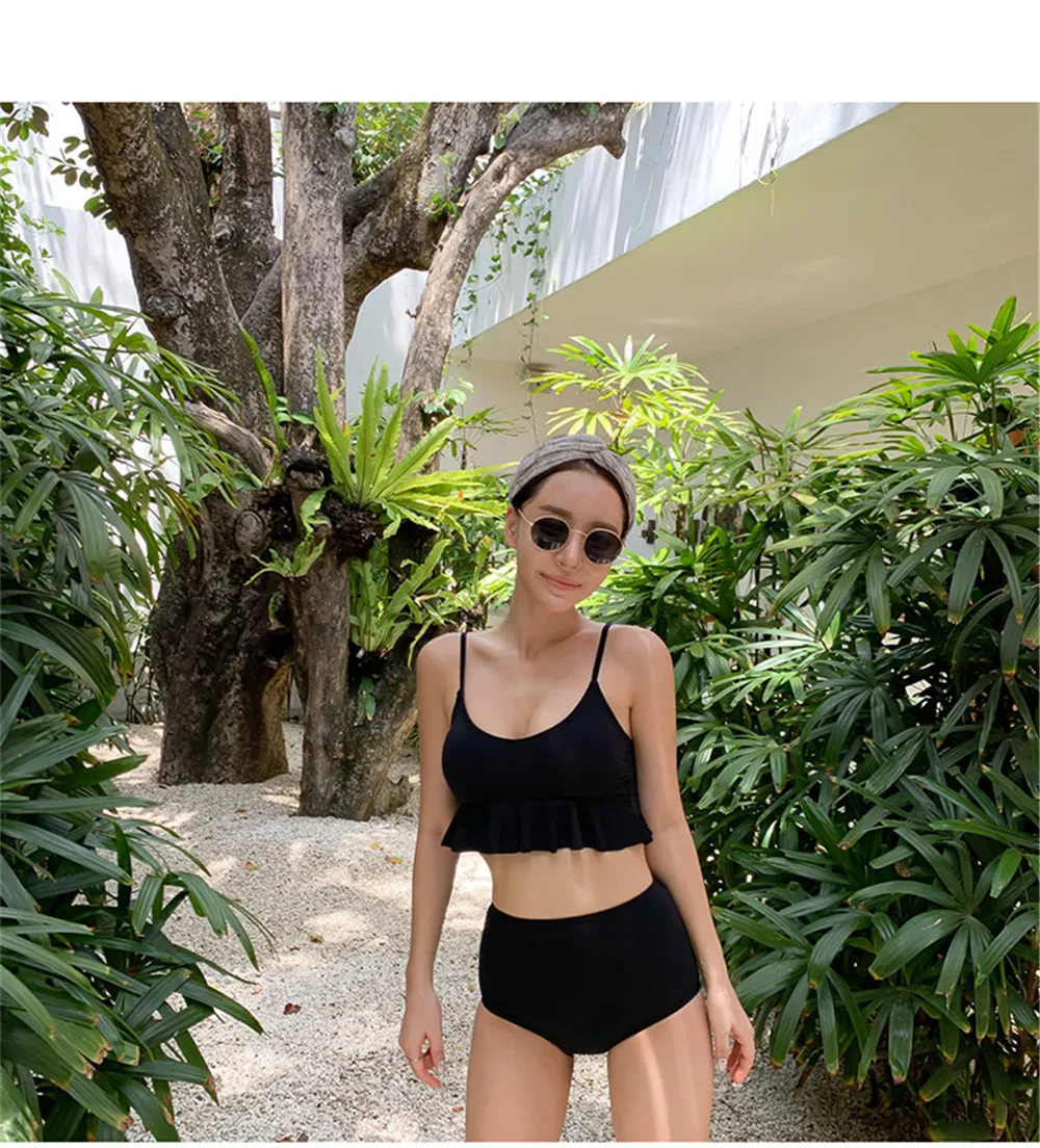 Item type: Bikinis set Gender: Women Support type: Wire free Waist: High waist With pad: Yes Material: Nylon 82% + Spandex 18% Fit: fits true to size, take your normal size Pattern type: Solid Brand name: Sundfotday Model number: Bikini Style: Korea style feature: Ruffle Size: M L XL Color: Pink Black Is-customized: Yes Packing: Polybag