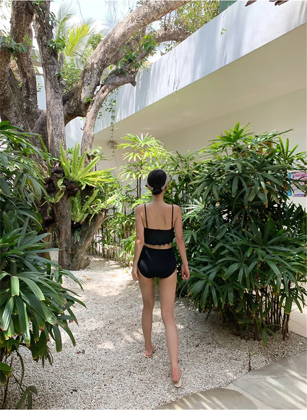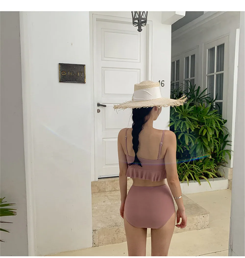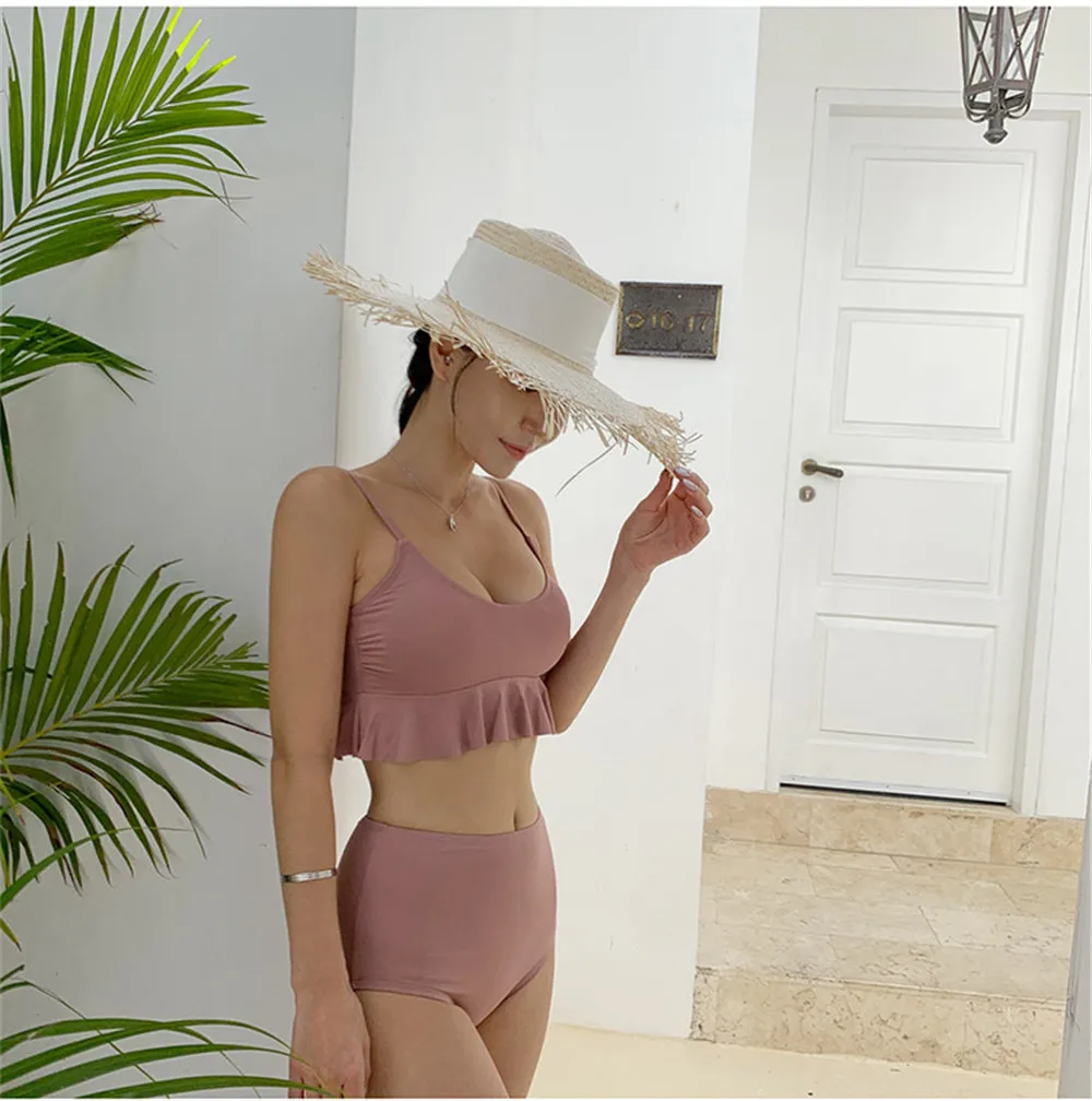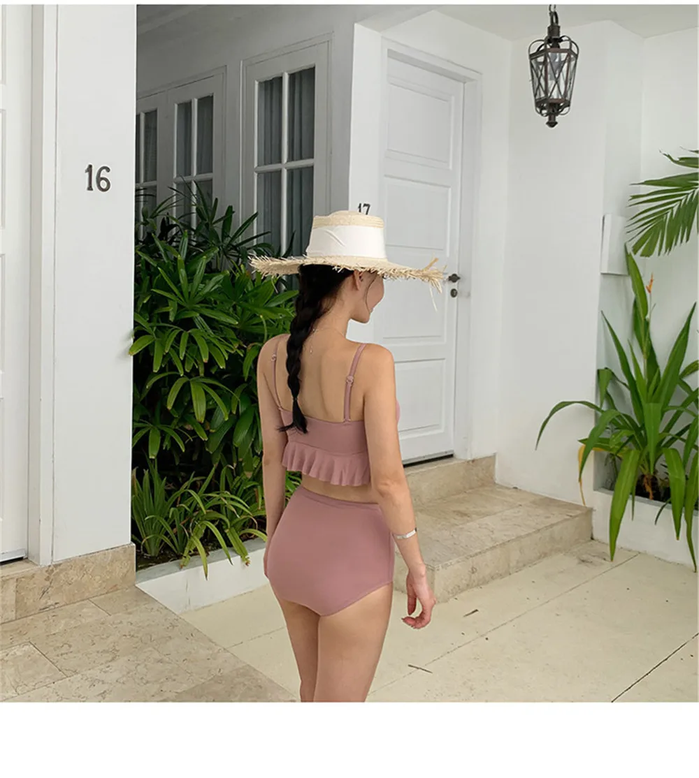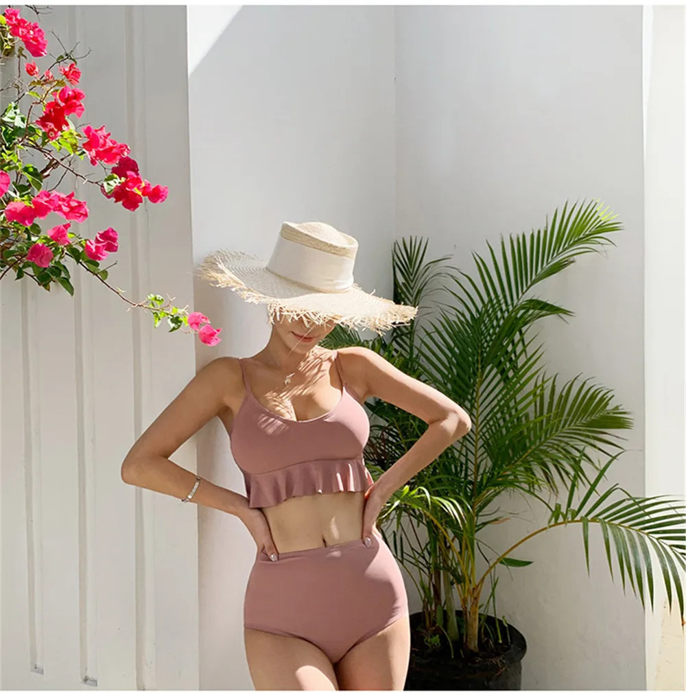 Item type: Bikinis set Gender: Women Support type: Wire free Waist: High waist With pad: Yes Material: Nylon 82% + Spandex 18% Fit: fits true to size, take your normal size Pattern type: Solid Brand name: Sundfotday Model number: Bikini Style: Korea style feature: Ruffle Size: M L XL Color: Pink Black Is-customized: Yes Packing: Polybag