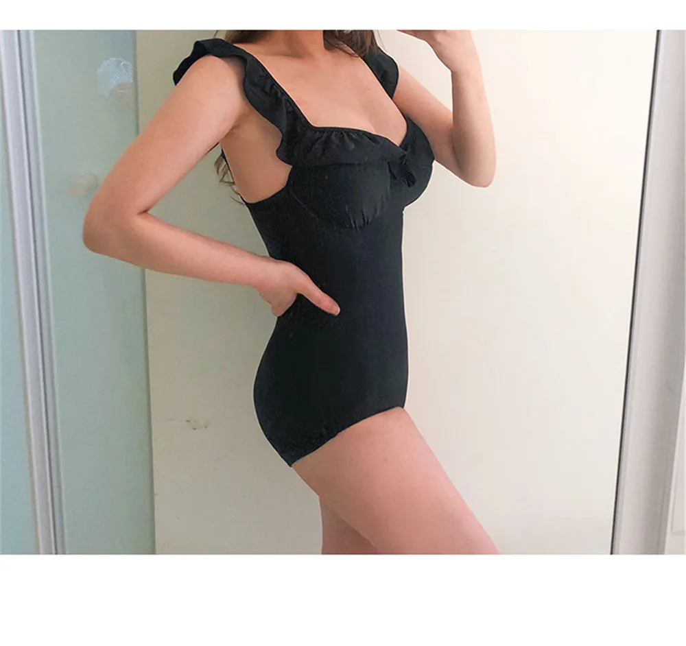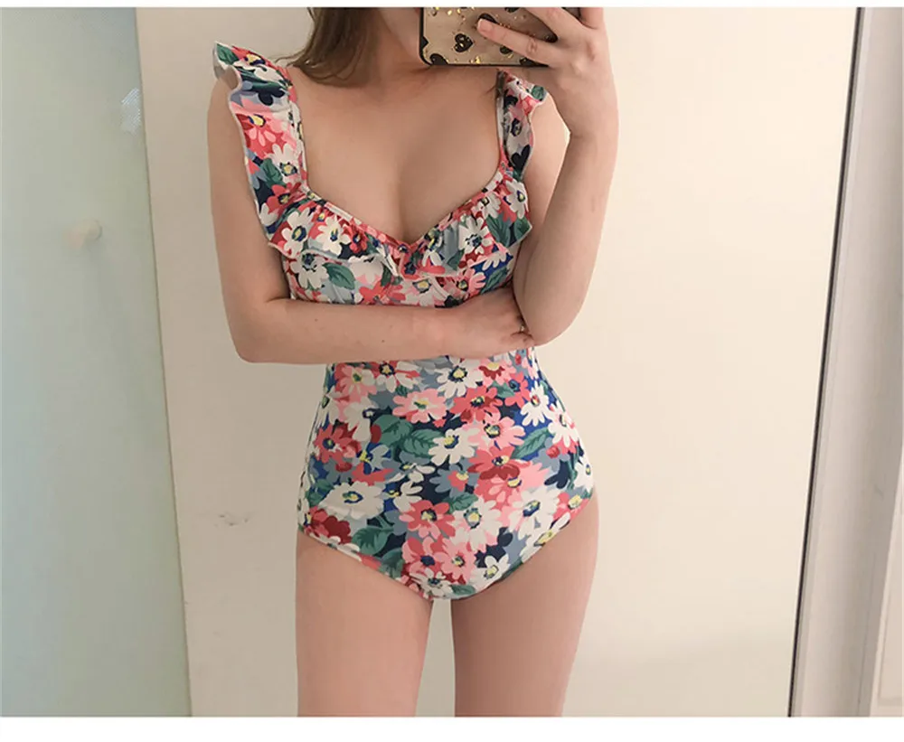 Ruffle One Piece Swimsuit Women Floral Print Swimwear Mori Style Monokini Push Up Swim Suit Backless Trikini Pad Bathing Suit