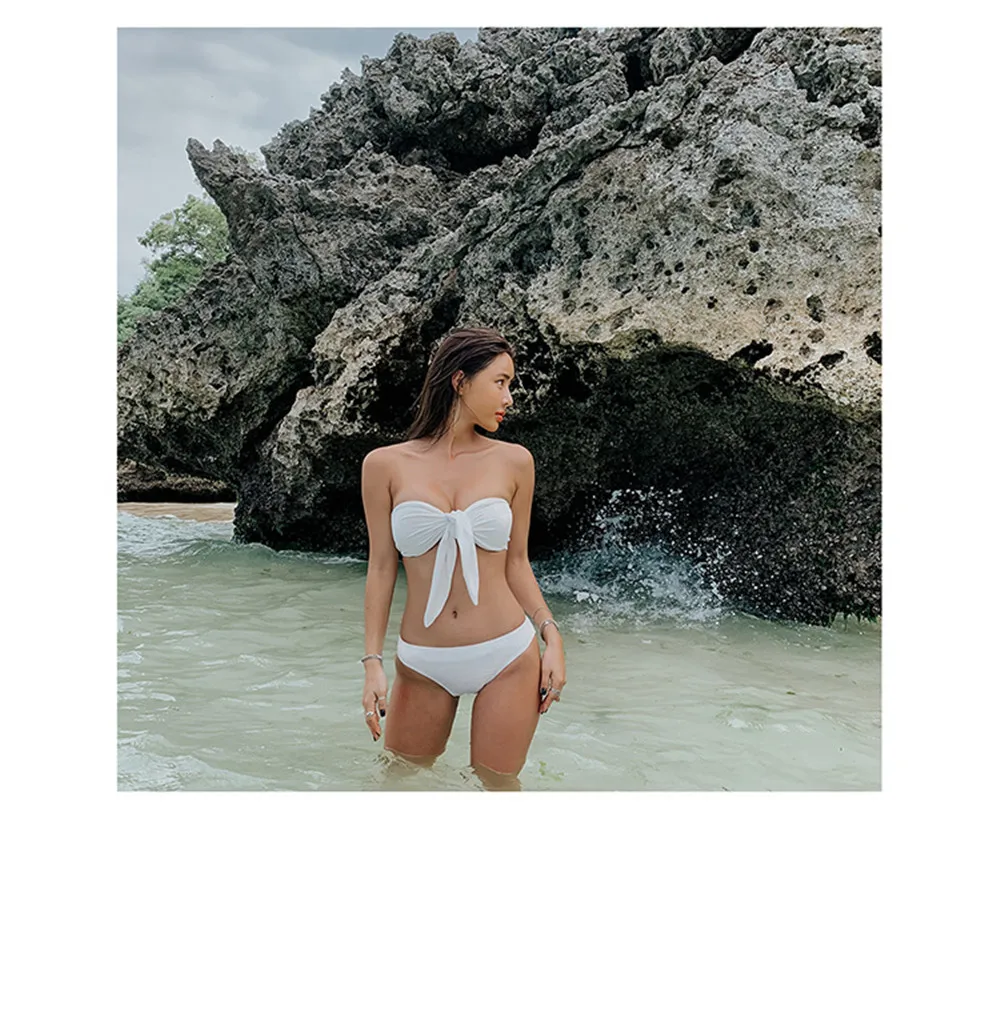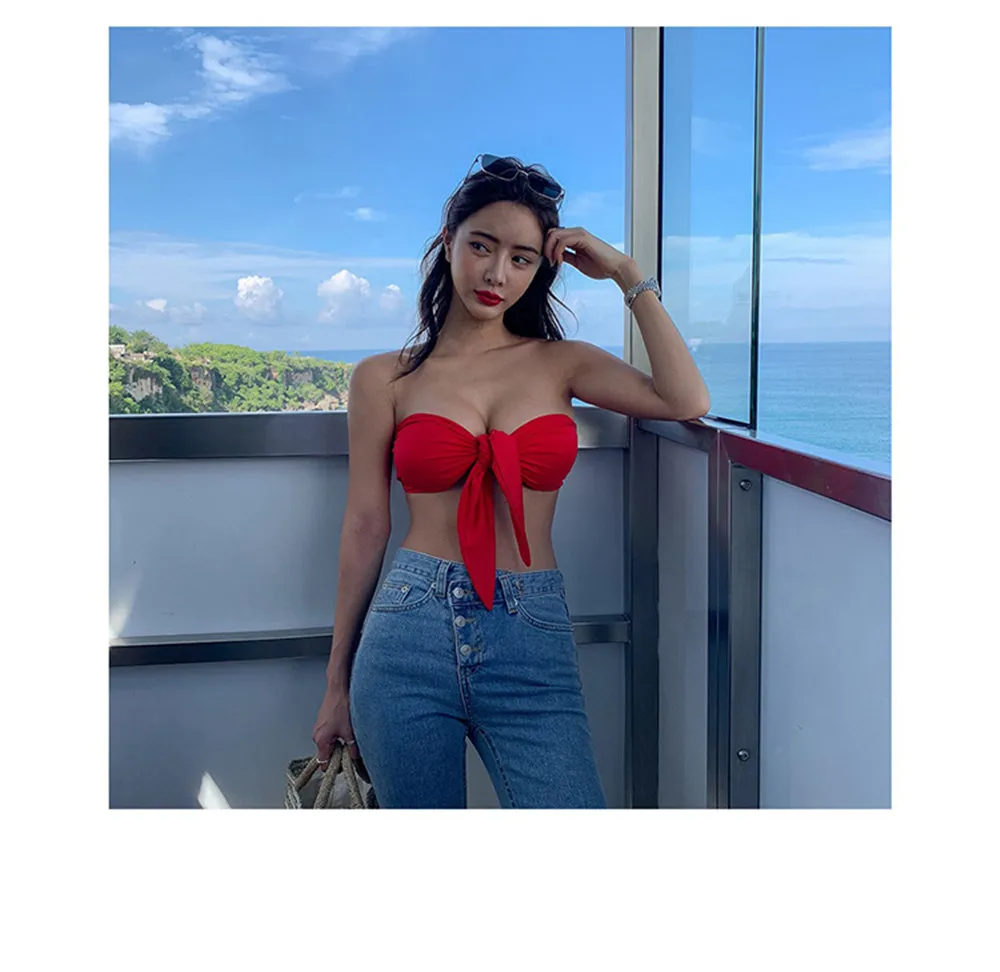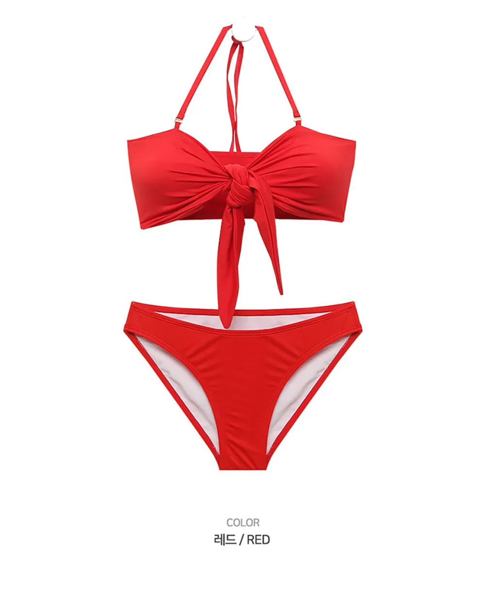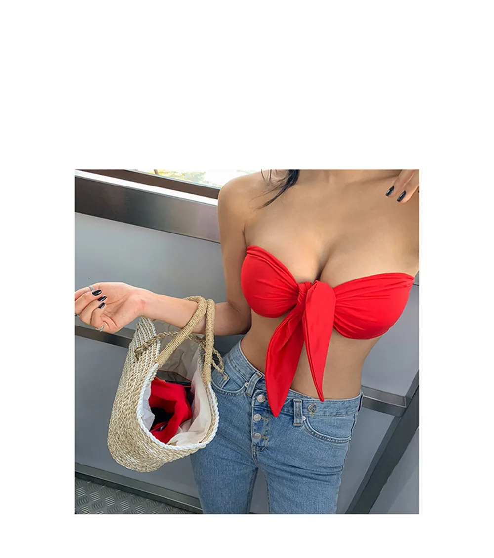 Sexy Bandeau Bikini Women Solid Swimwear Bow Biquini Push Up Swimsuit Halter Bikinis Red Bathing Suit Korea Style Beachwear Pad