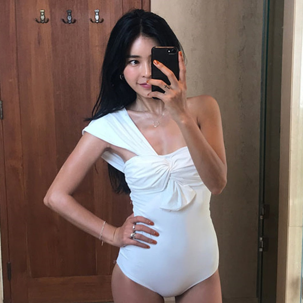 Sexy Bandeau One Piece Swimsuit Women Solid Swimwear One Shoulder Monokini Pad Swim Suit Pleated Trikini Bow Bathing Suit Pad