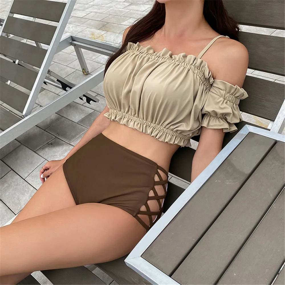 Item type: Bikinis set Gender: Women Support type: Wire free Waist: High waist With pad: Yes Material: Nylon 82% + Spandex 18% Fit: fits true to size, take your normal size Pattern type: Solid Model number: Bikini Style: Korea style feature: Crop top Size: M L XL Color: brown beige white black blue Is-customized: Yes Packing: Polybag
