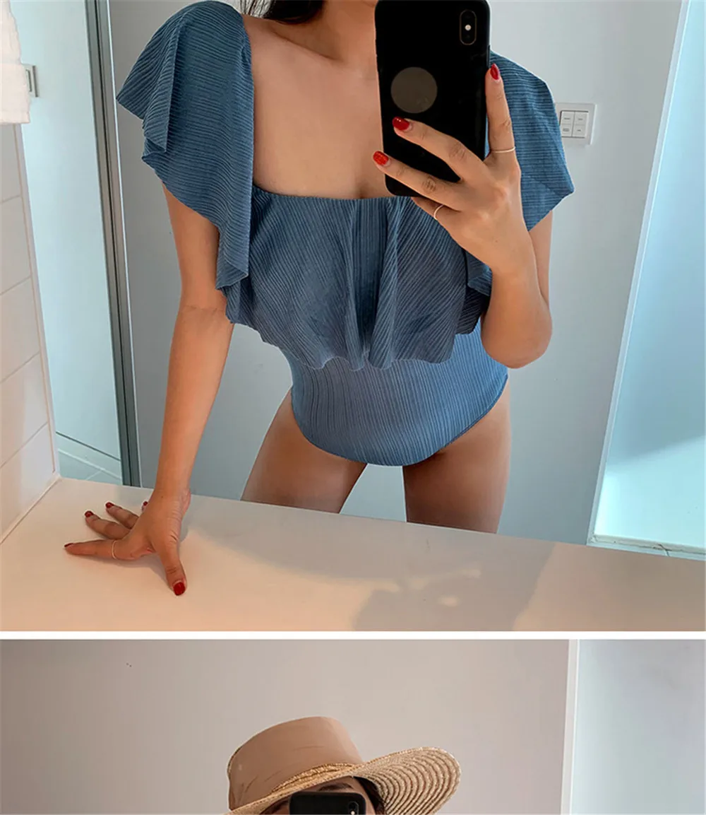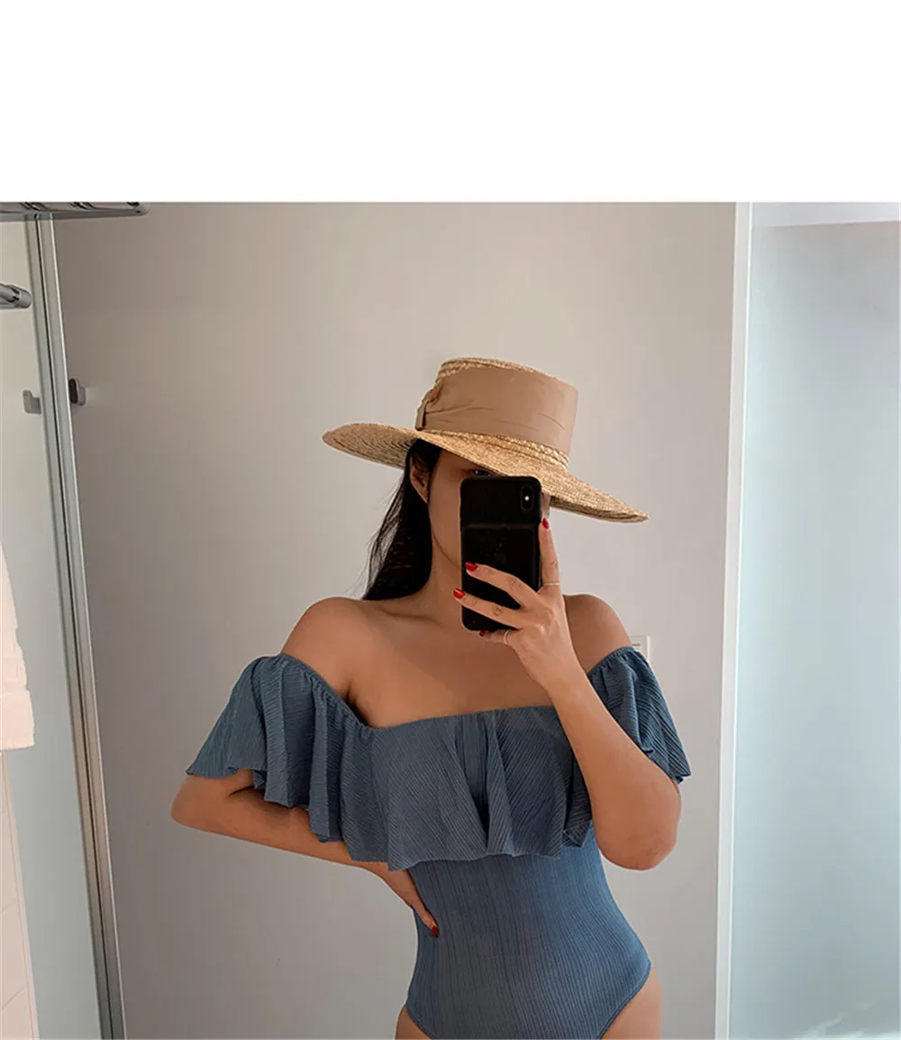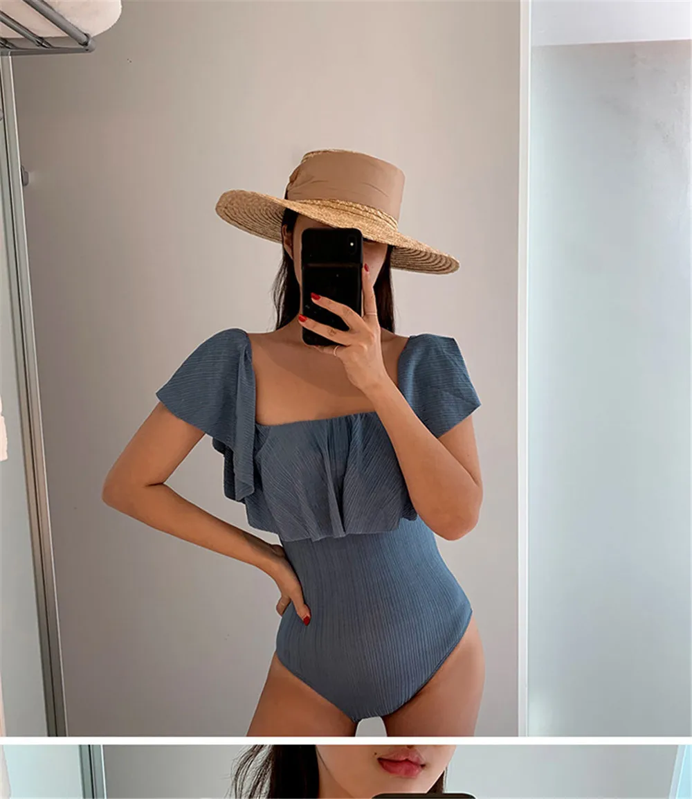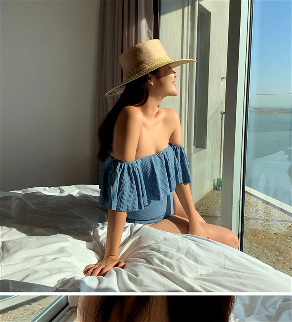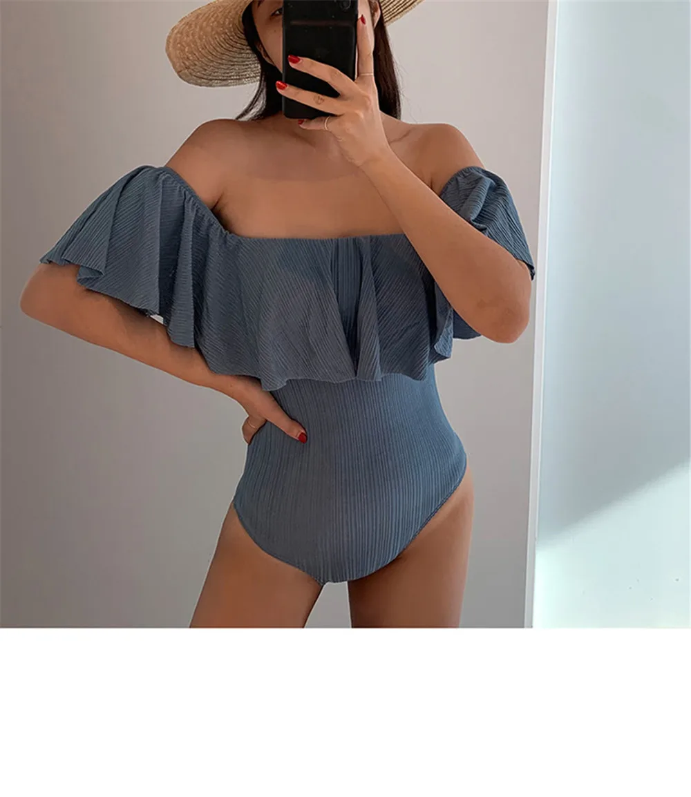 Sexy Off Shoulder One Piece Swimsuit Women Solid Swimwear Black Ruffle Monokini Flounce Swim Suit Pleated Pad Bathing Suit Blue