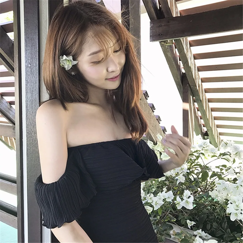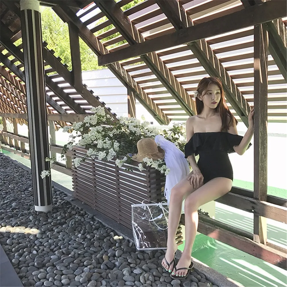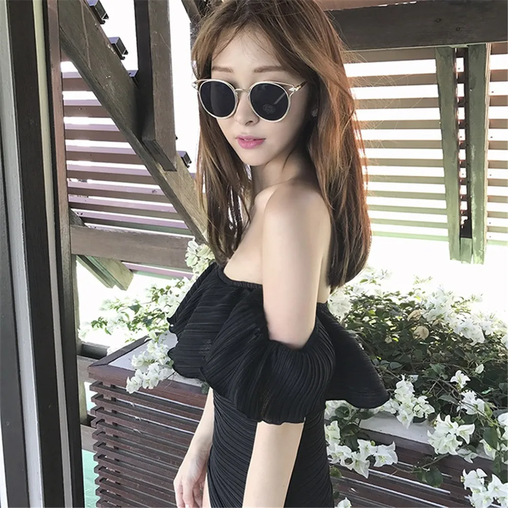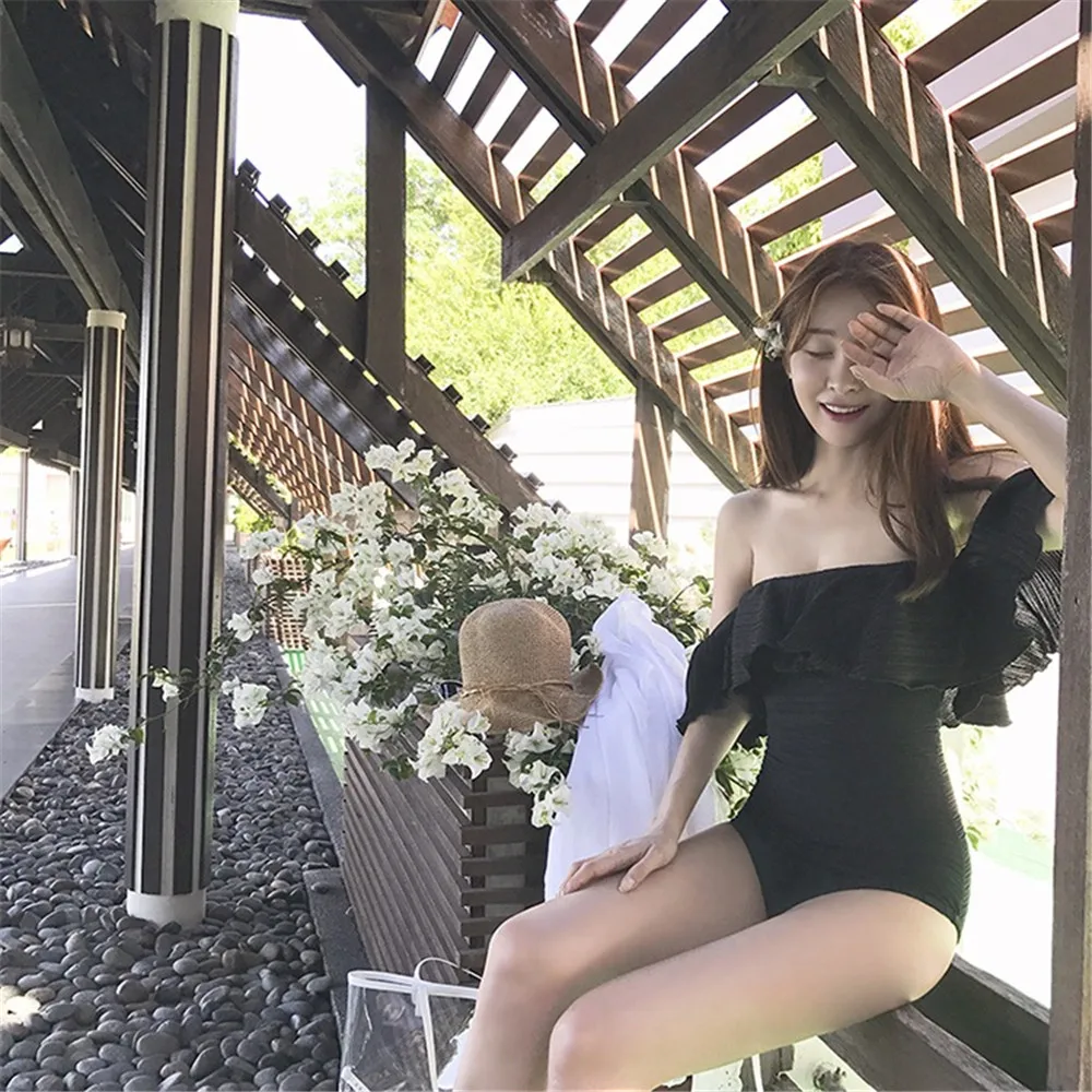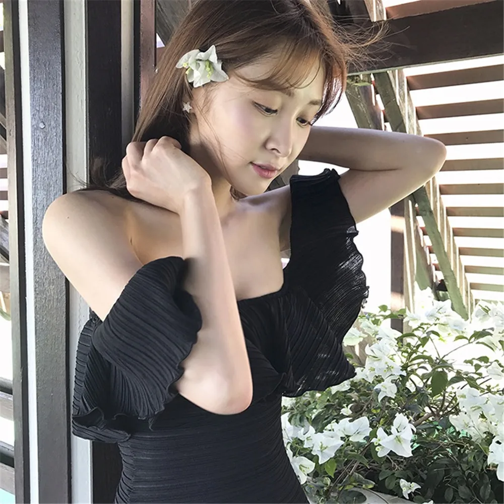 Sexy Off Shoulder One Piece Swimsuit Women Solid Swimwear Black Ruffle Monokini Flounce Swim Suit Pleated Pad Bathing Suit Blue