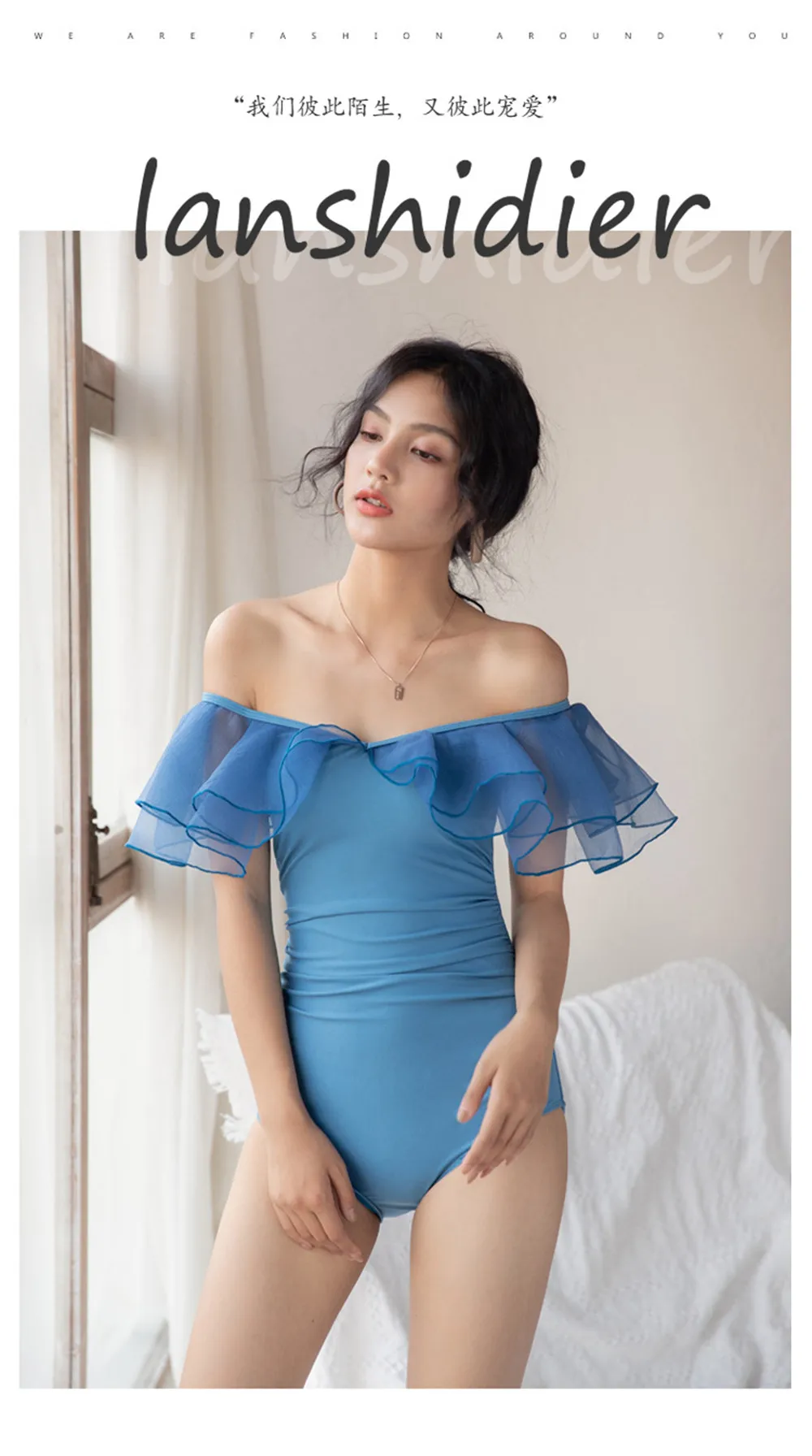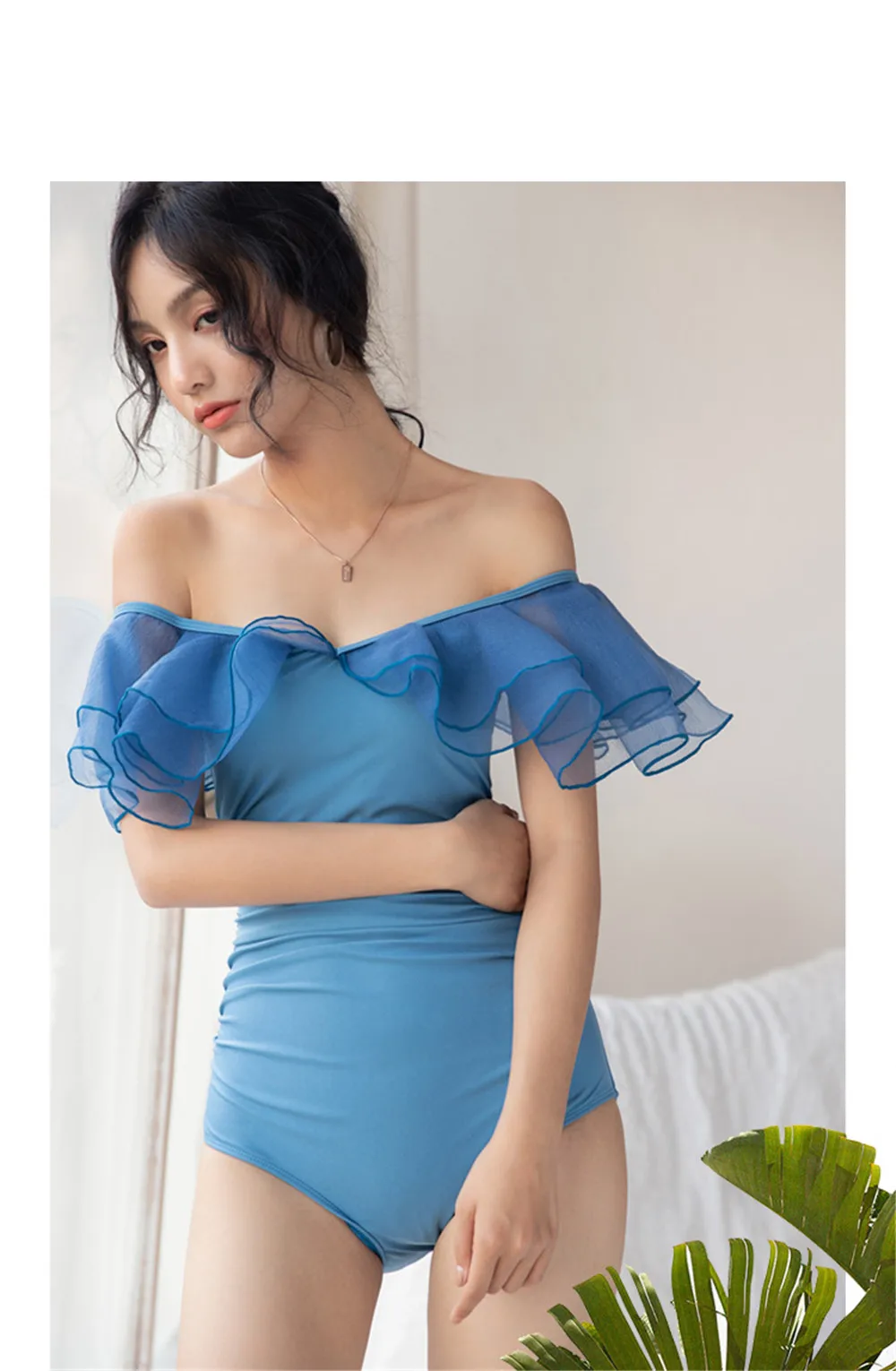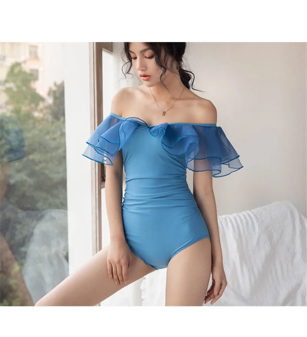 Sexy Off Shoulder One Piece Swimsuit Women Solid Swimwear Ruffle Monokini Lace Swim Bandeau Bathing Suit Push Up Pad Lace Up