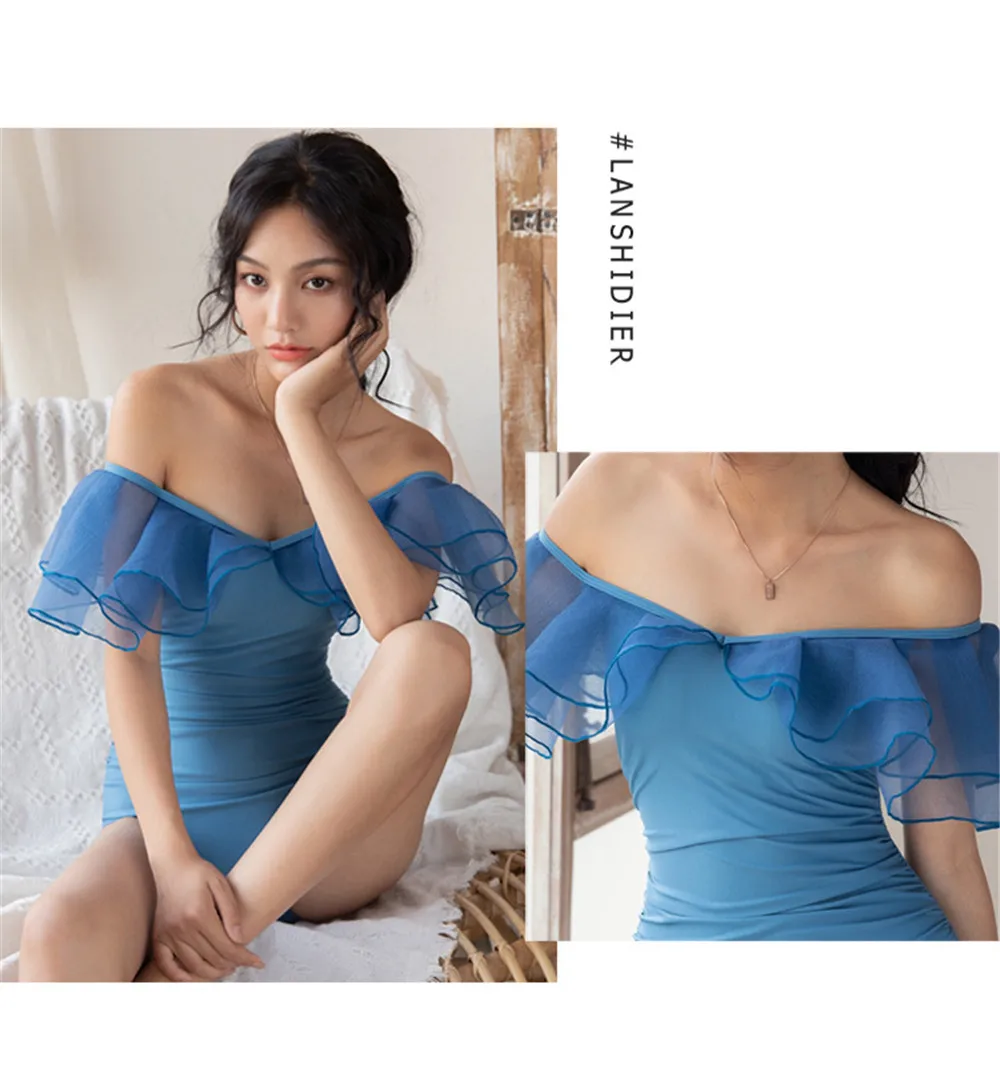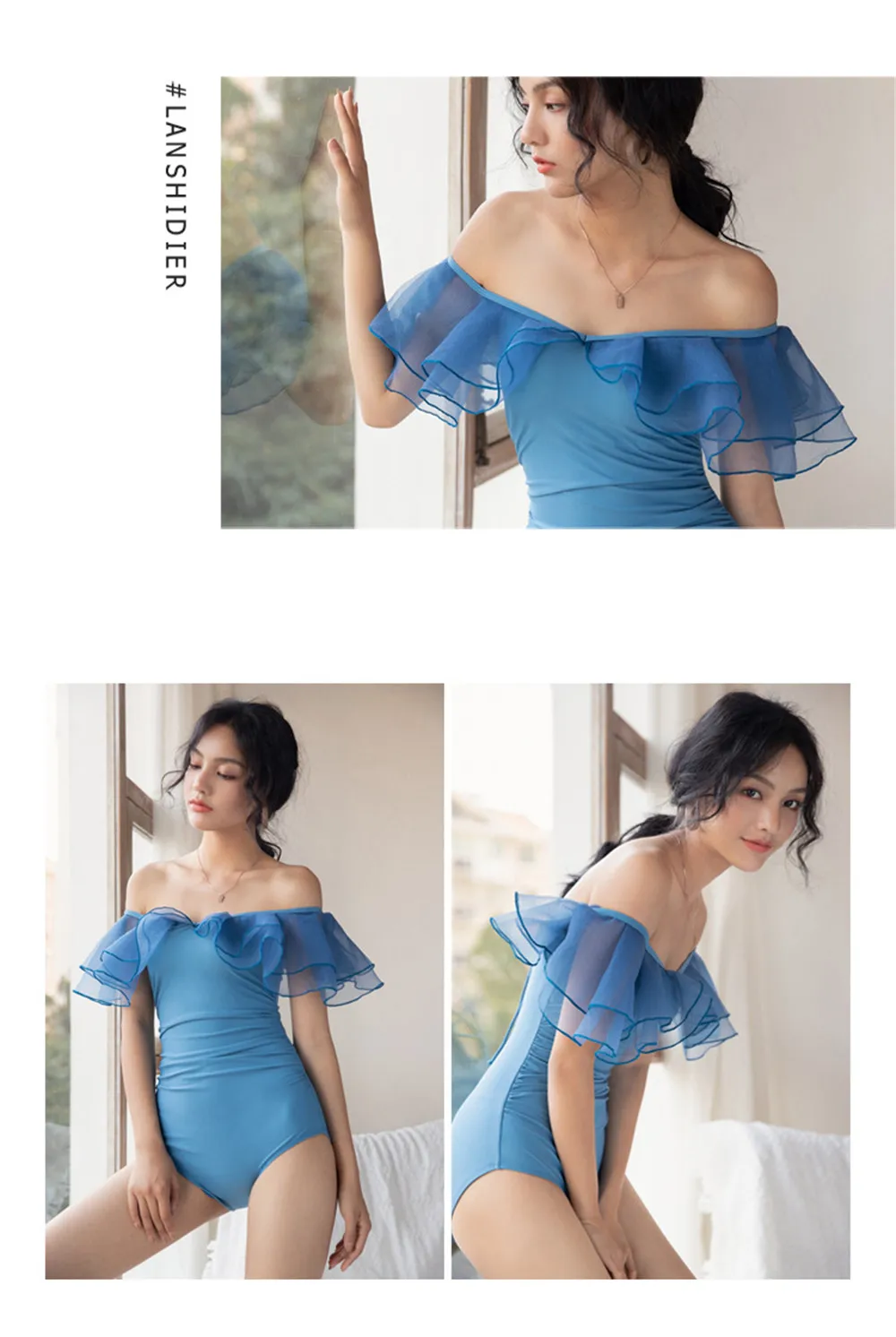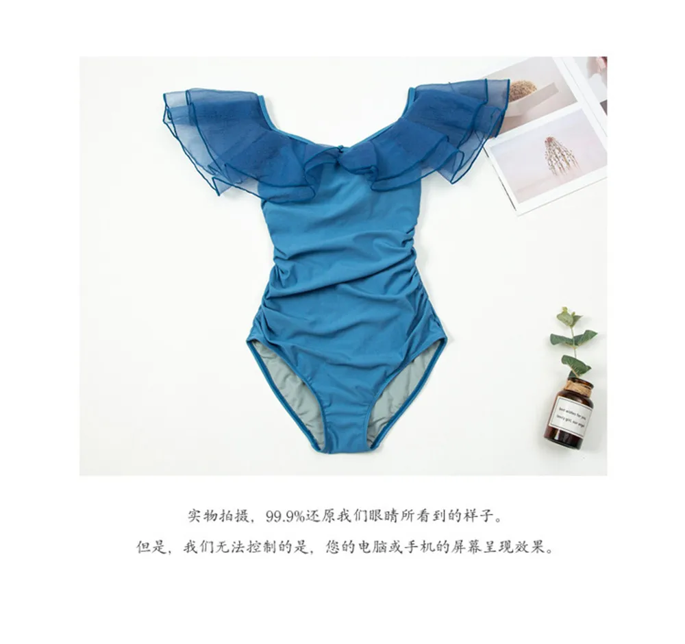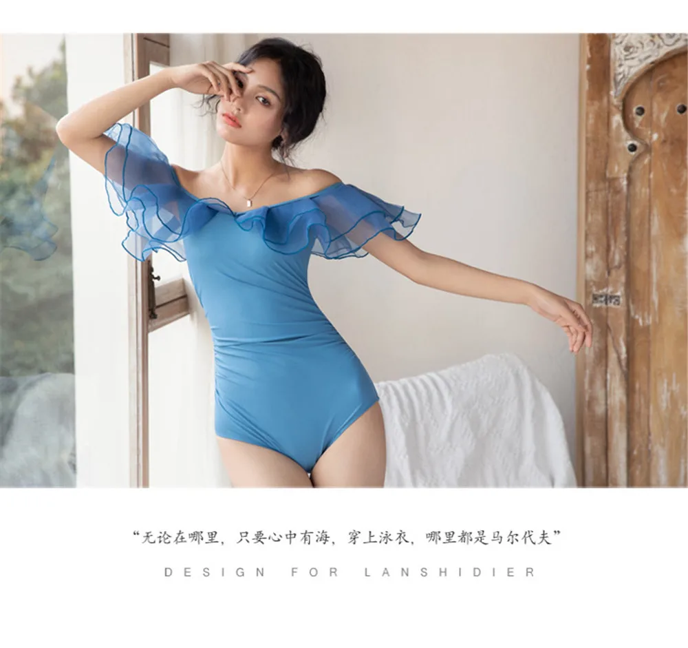 Sexy Off Shoulder One Piece Swimsuit Women Solid Swimwear Ruffle Monokini Lace Swim Bandeau Bathing Suit Push Up Pad Lace Up