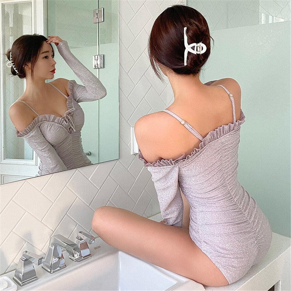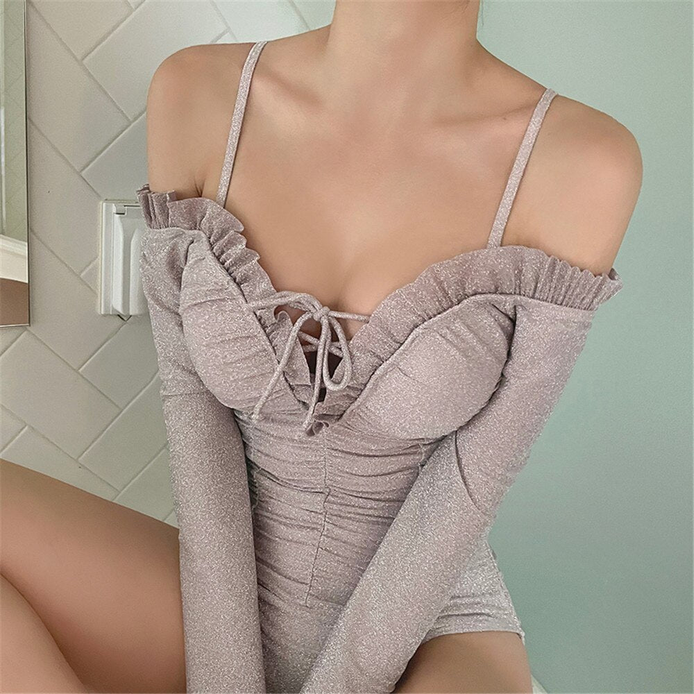 | Sexy Off Shoulder One Piece Swimsuit Women Solid Swimwear Shiny Pleated Monokini Push Up Swim Suit Long Sleeve Trikini Lace Up |