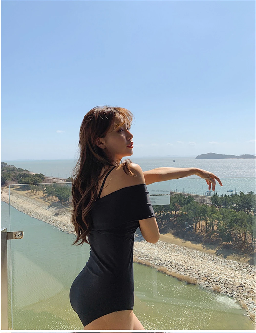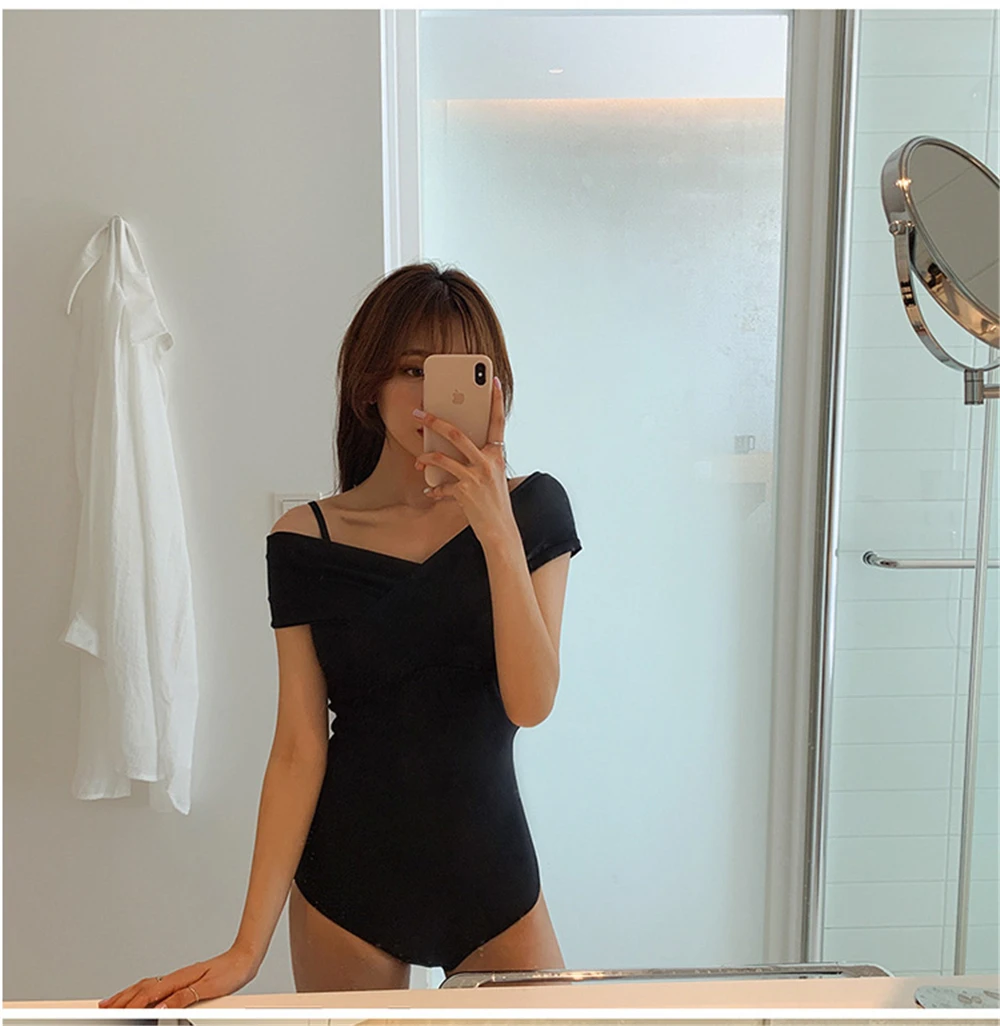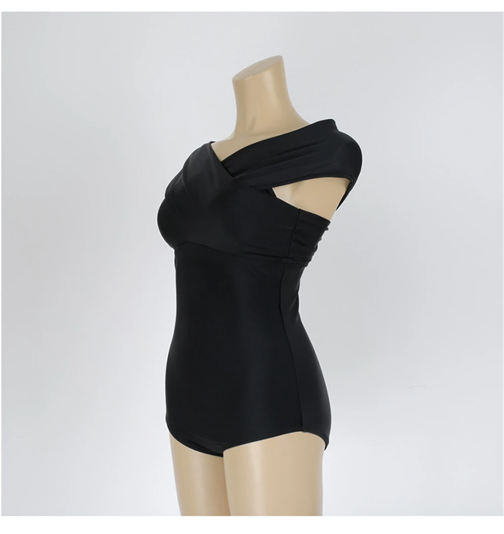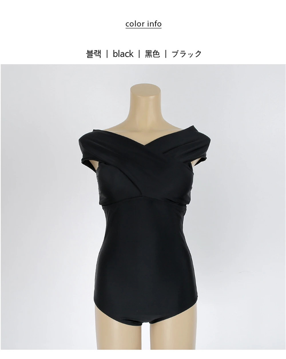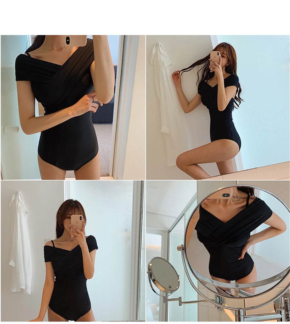 | Sexy Off Shoulder One Piece Swimsuit Women Solid Swimwear Wrap Monokini Pleated Swim Suit Korea Bathing Suit Push Up Black Strap |