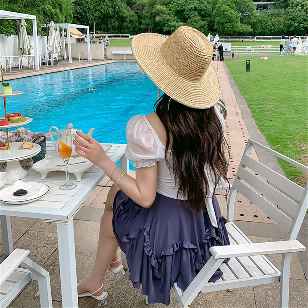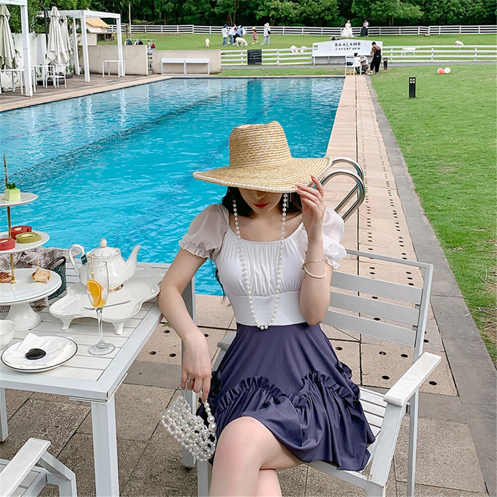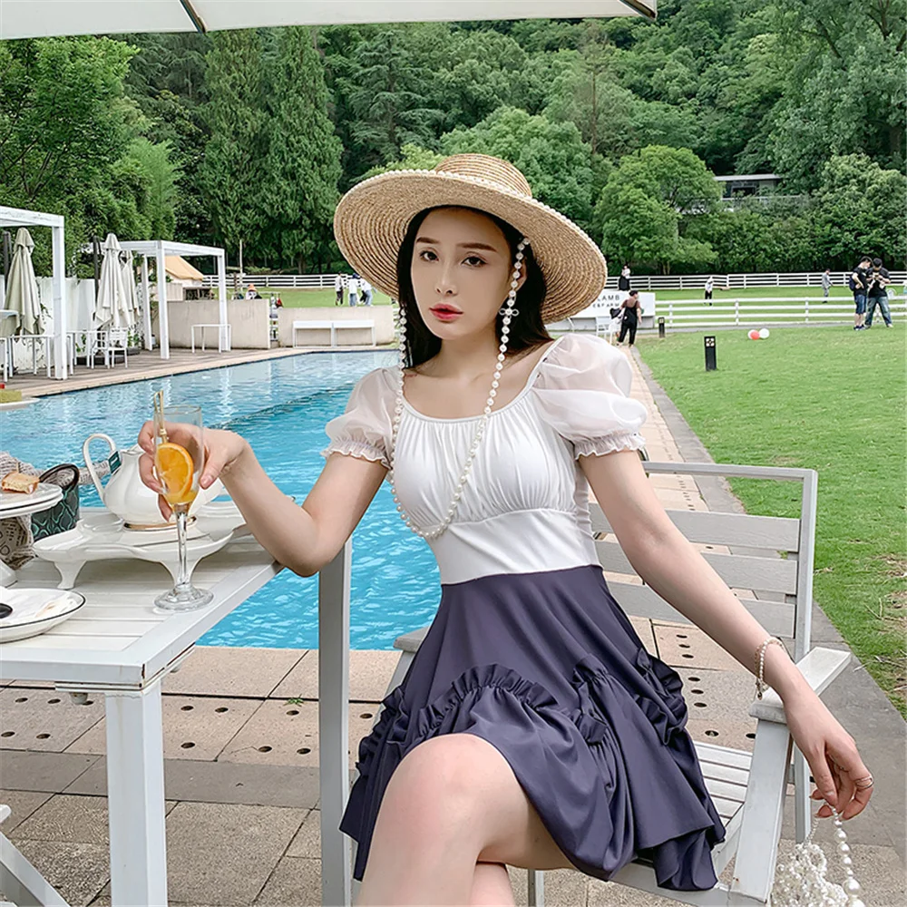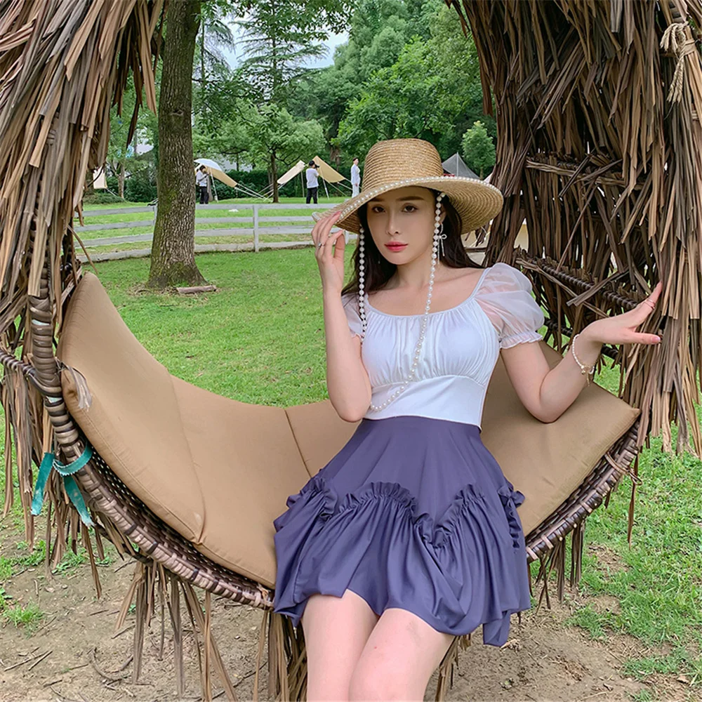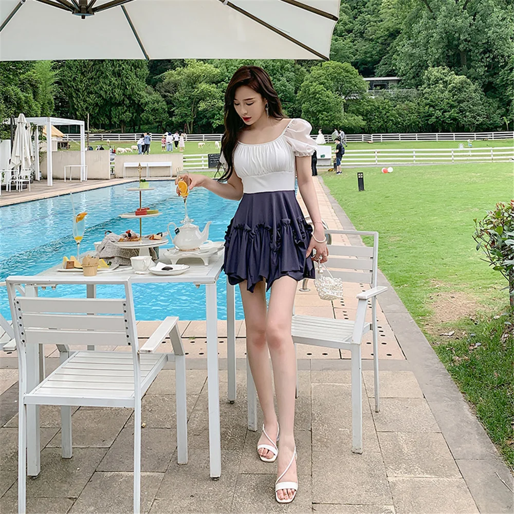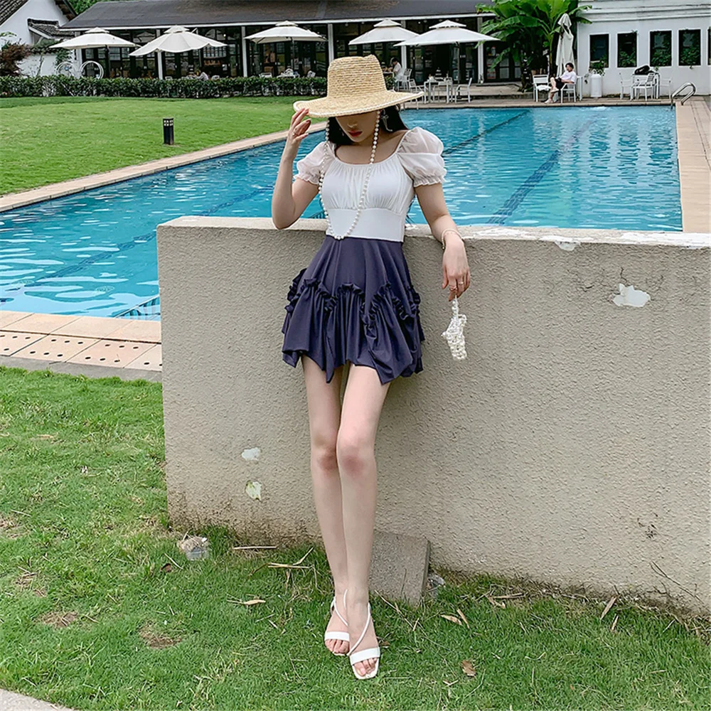 Short Sleeve One Piece Swimsuit Women Patchwork Swimwear Open Back Monokini Skirt Bathing Suit Ruffle Backless Push Up Pad Lace