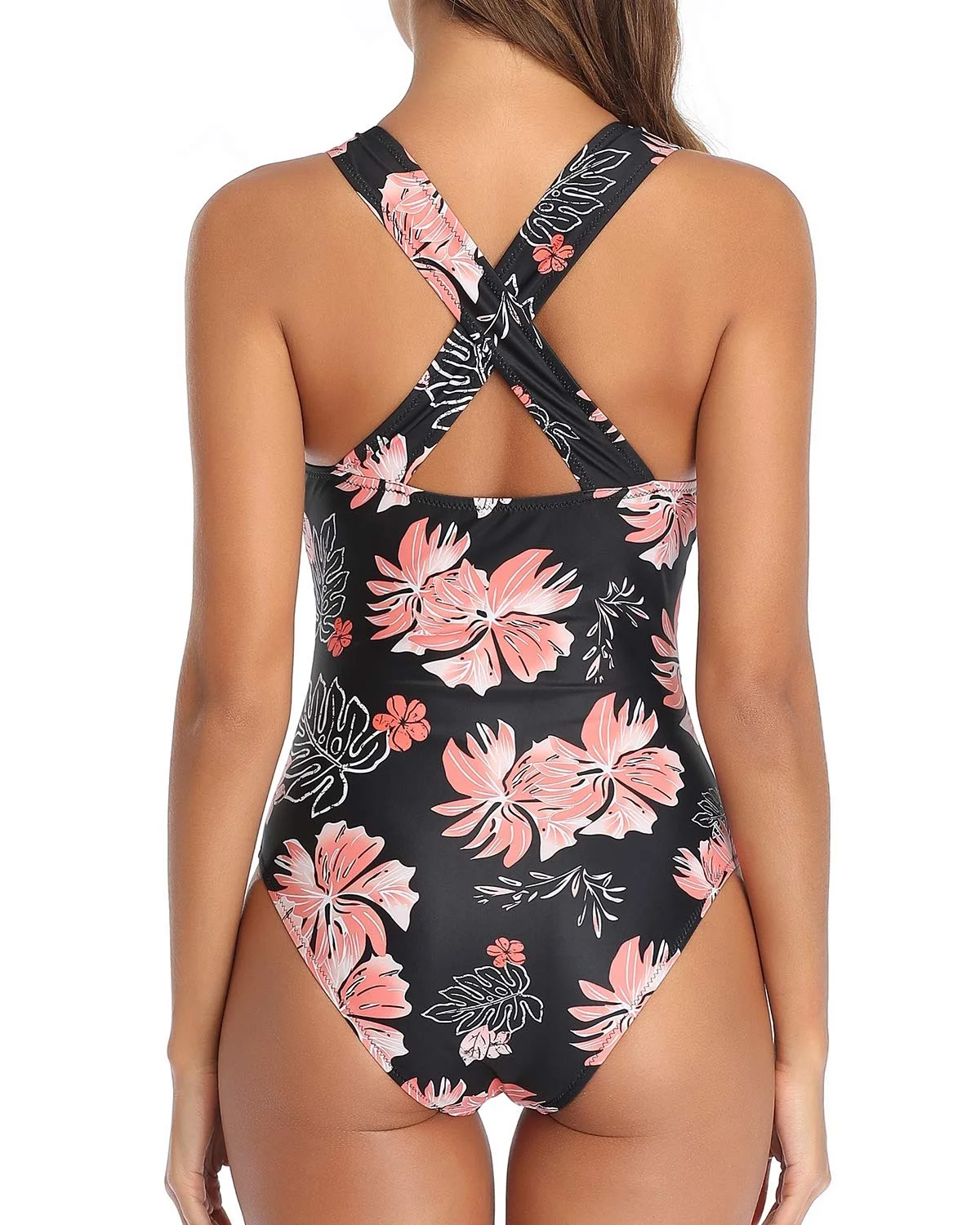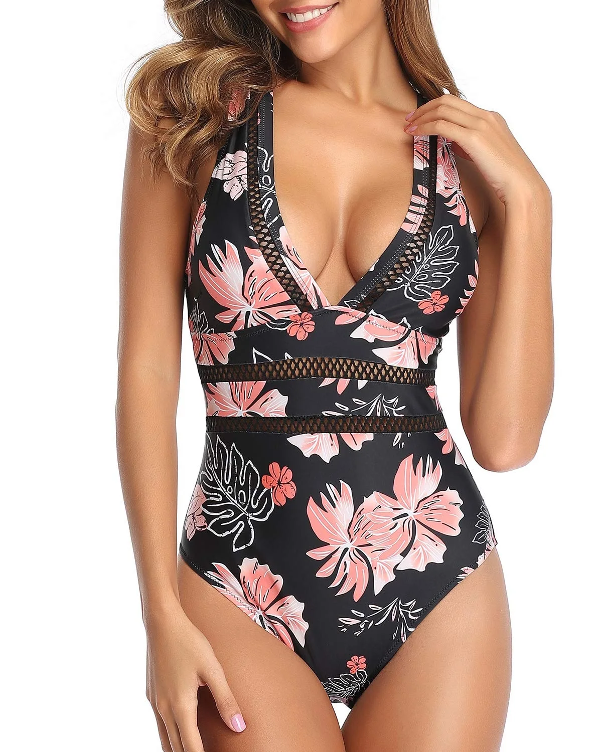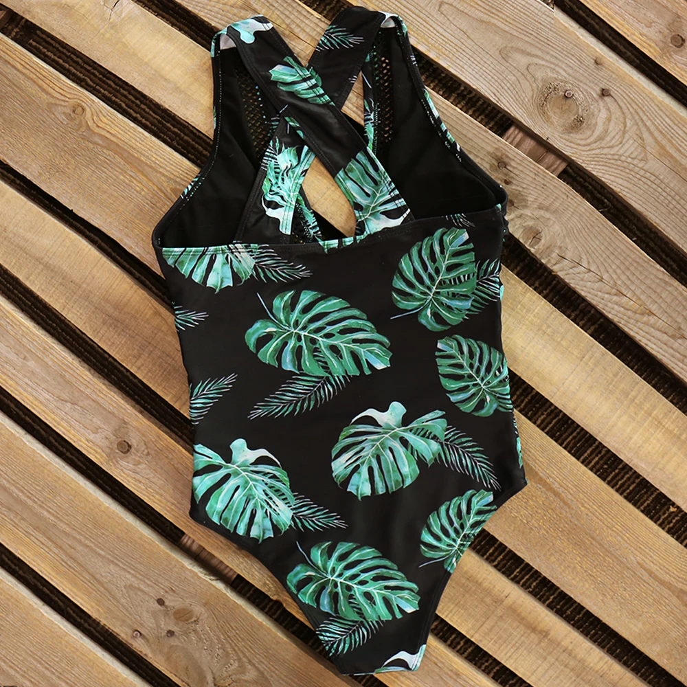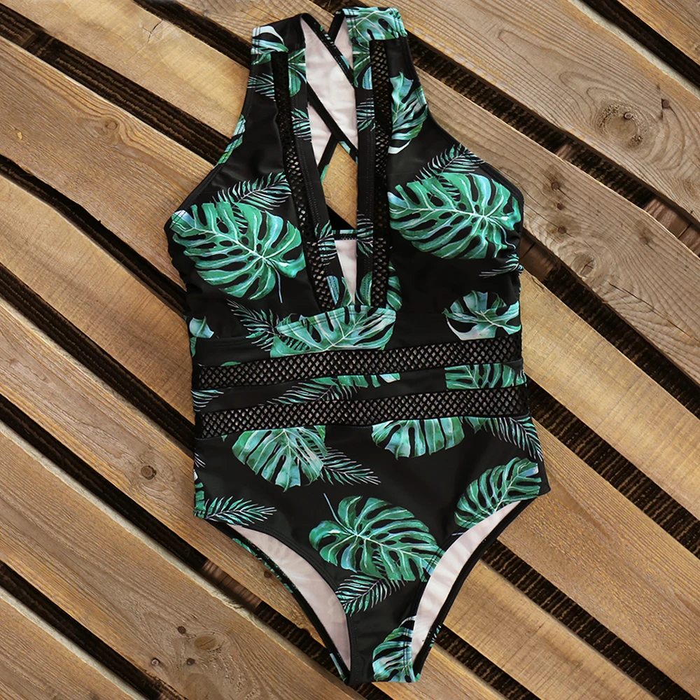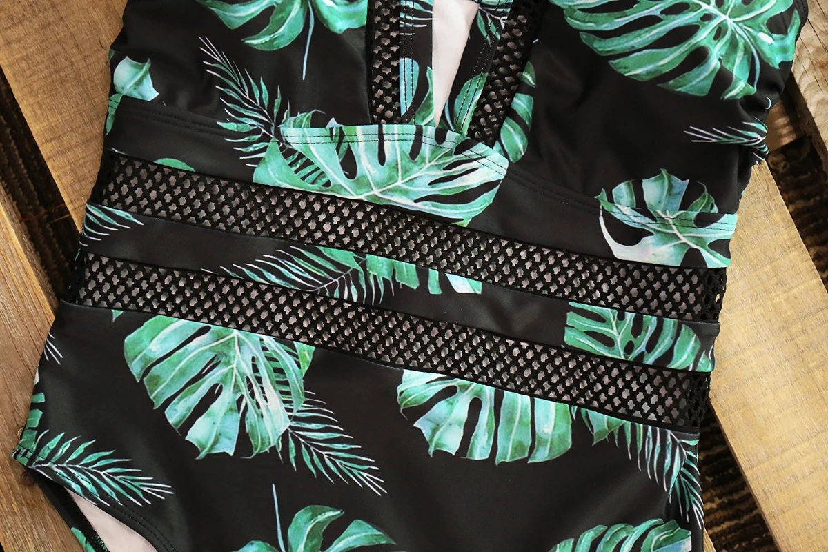 Transparent Women One Piece Swimsuit Printed Leaf Swimwear Black Slimming Monokini Push Up Floral Pattern Bathing Suit Bain