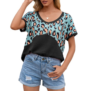 Summer Women Shirt Leopard Splicing Waffle Knit V Neck Tees Back Hollow Out Loose Casual Tunic Mujer Tops Female T-Shirts