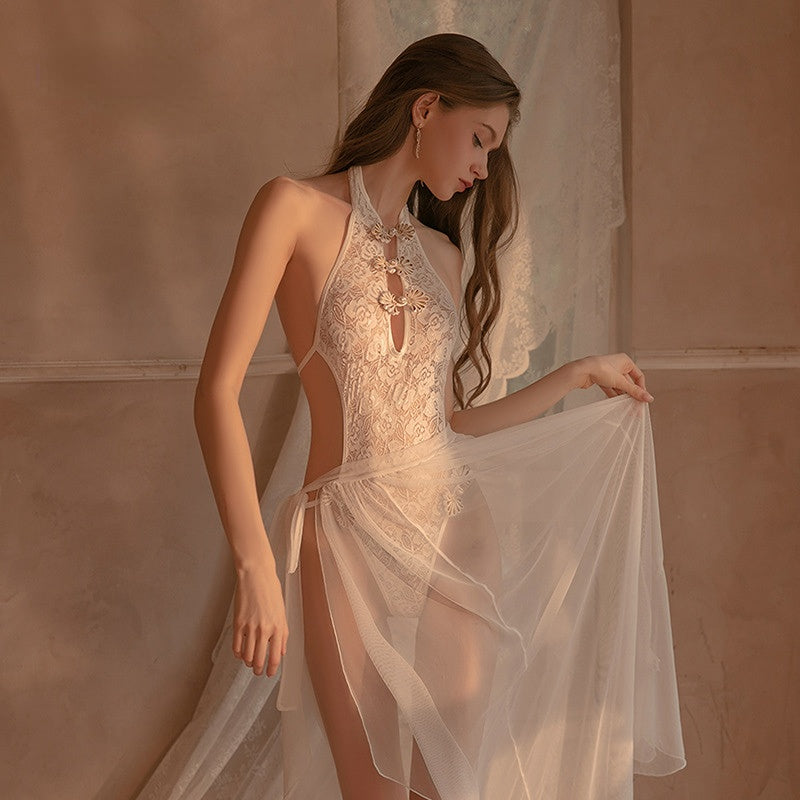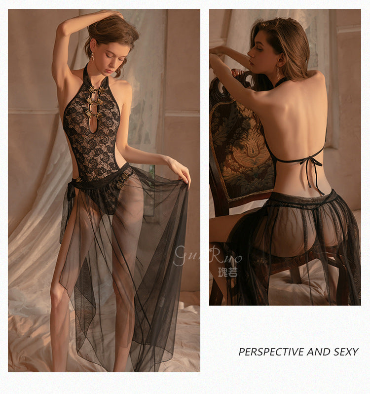 2-piece Set Sexy Slutty Cheongsam Bodysuit Nightdress Women's Exotica Lingerie Porno Sex Adult Perspective Lace-up Gauze Skirt
