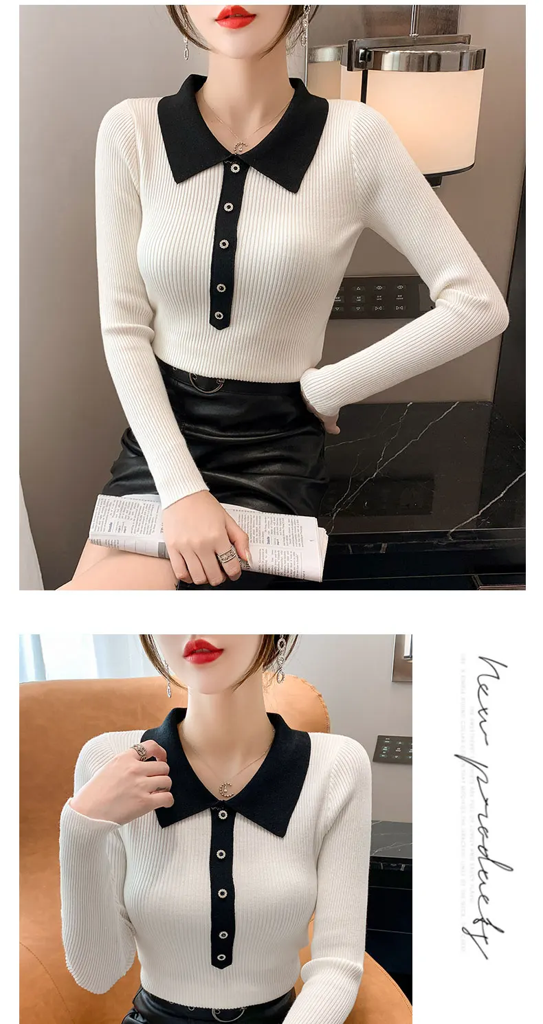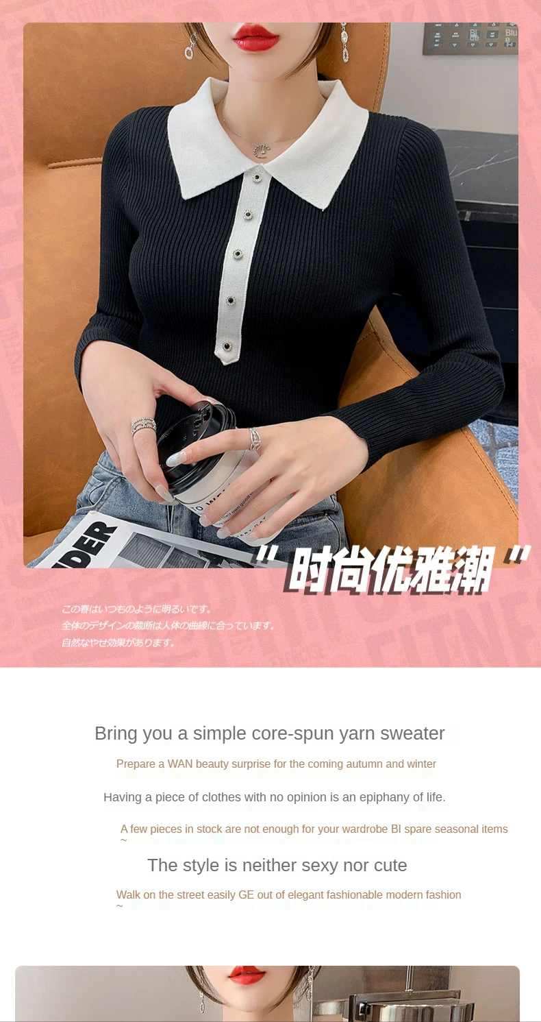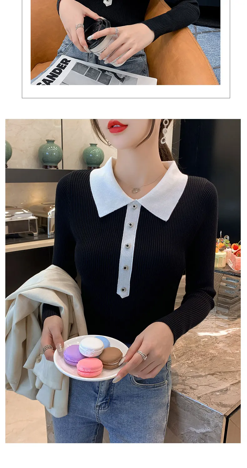 2021 Autumn/winter New Style POLO Collar Long-sleeved Sweater Women's Self-cultivation Western Style Bottoming Shirt