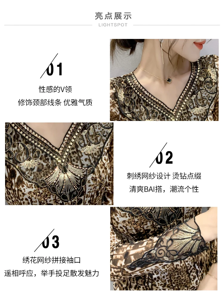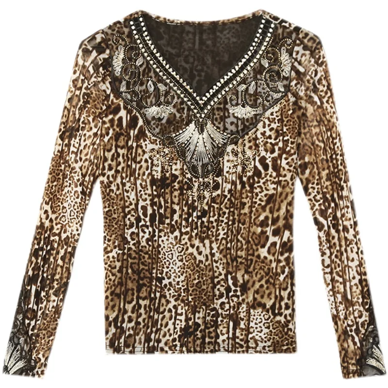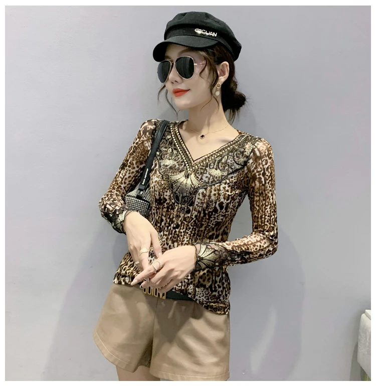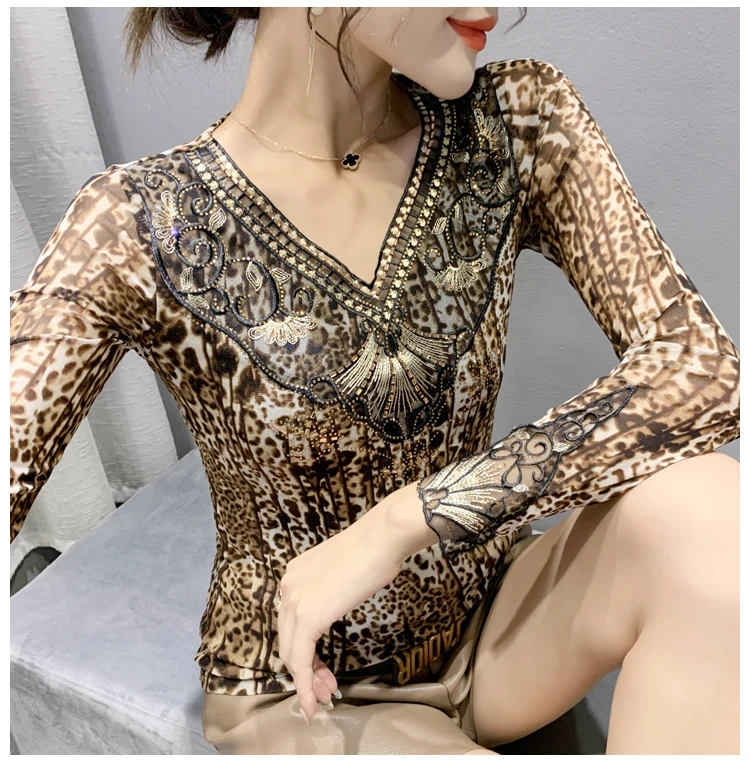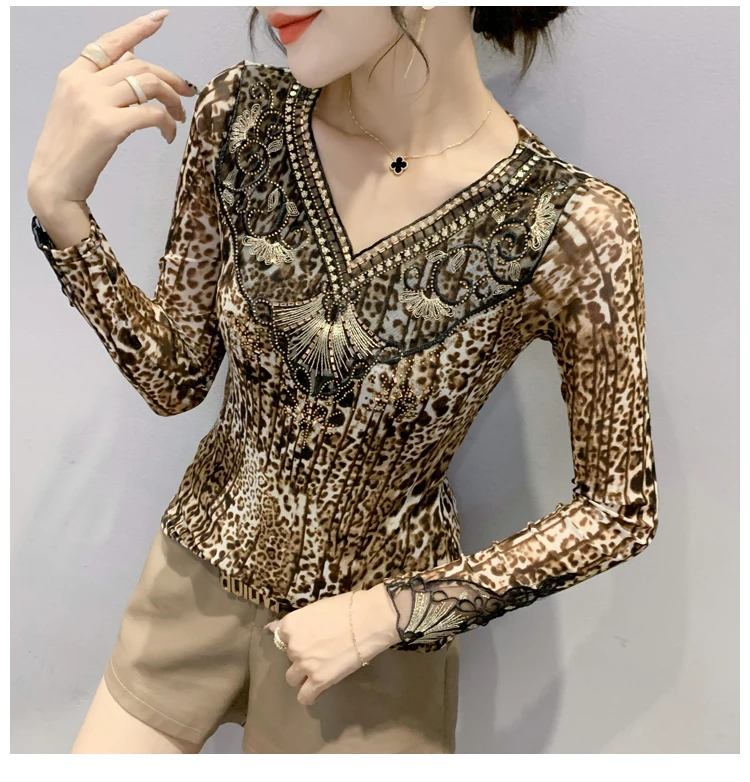 2021 Autumn Winter New Women's T-Shirt Fashion Mesh Stitching Hot Diamond V-Neck Tops Shirt Sexy Hollow Out Leopard tshirt
