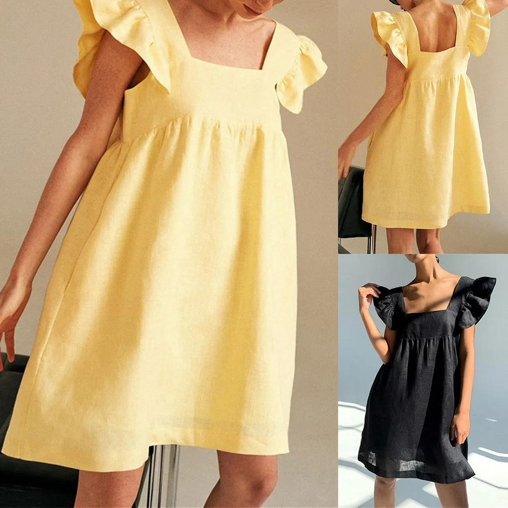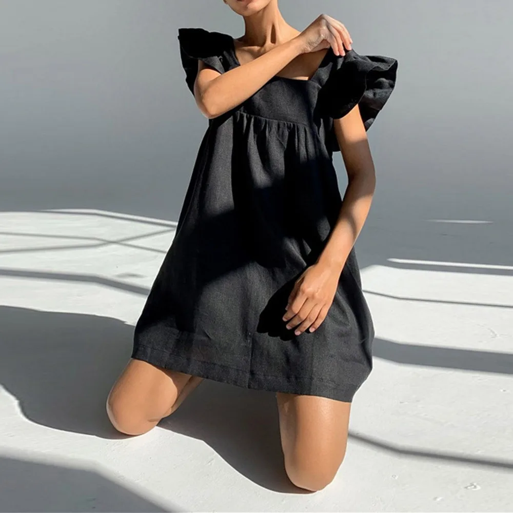 2021 Casual Square Collar Butterfly Sleeve Mini Sweet Dress Summer Woman Backless High Waist Loose Linen Solid Dress