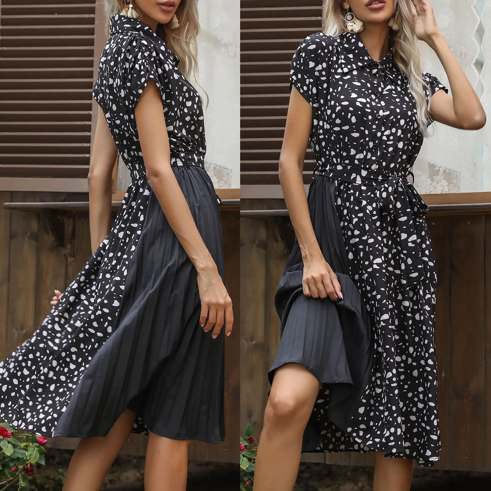 Featuring floral print, turn-down collar, button-down, short sleeves, waist belt, and pleated splicing, this midi dress is elegant and chic for summer. Fit for a date, street, travel, holidays, party, etc.