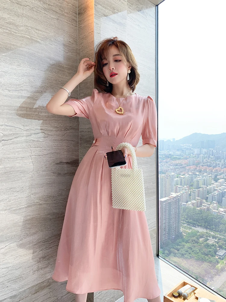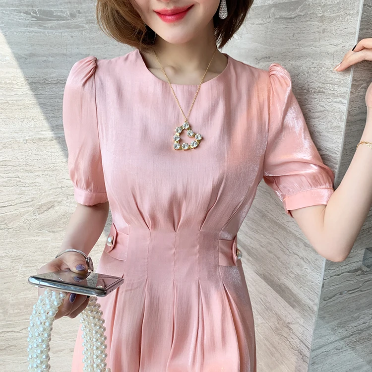 2021 Fashion Elegant Acetate dress Folds High Waist A-Line Dress Women Summer Short Sleeve Round Neck Party Dresses Female