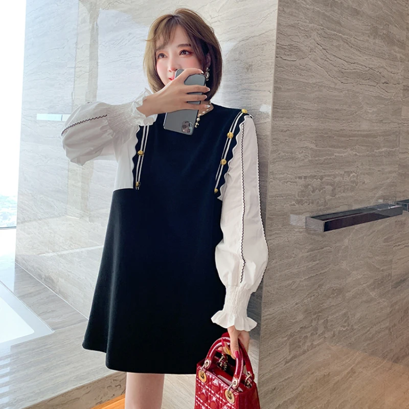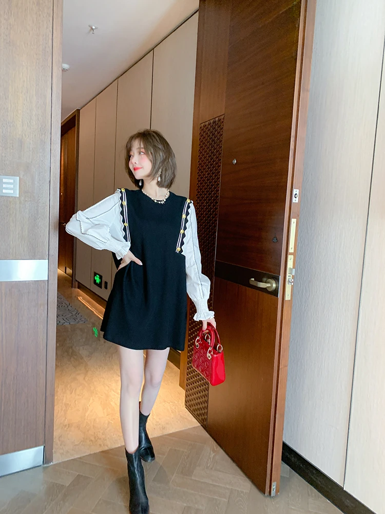 2021 New Fashion Shirt Patchwork Loose Fake Two Casual Straight Dresses Long Sleeve Round Neck Buttons Knitted Autumn Spring Dress