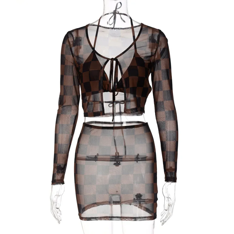 2021 Fashion Trend Personality Sexy Nightclub V-neck Mesh Printed Plaid Jacket Vest See-through Hip Skirt Three-piece Set