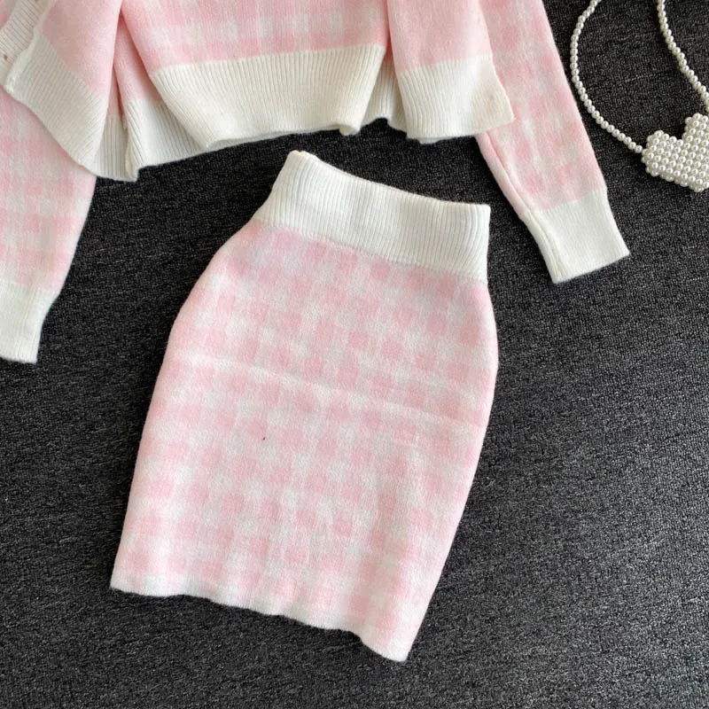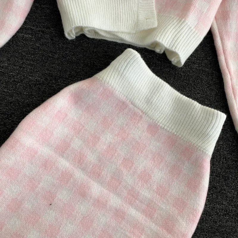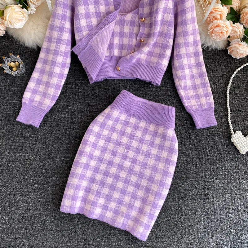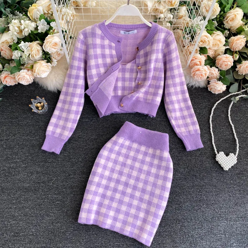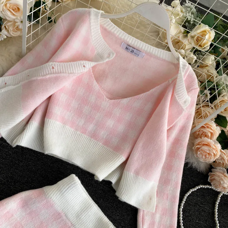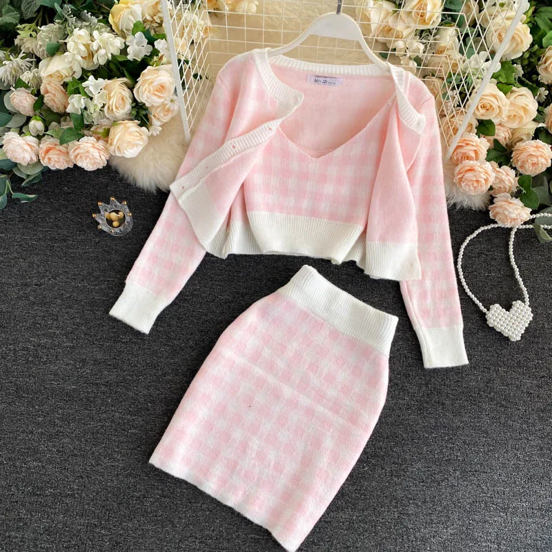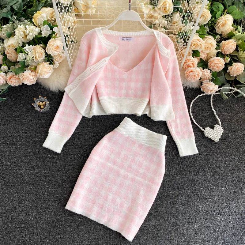 2021 Fashion Women Clothing Suit Long Sleeve Knit Cardigans+V-neck Crop Top Vest+Bodycon Skirt 3 Piece Set Casual Plaid Sweater