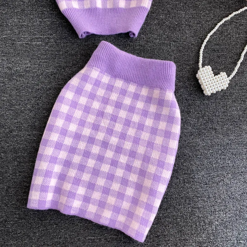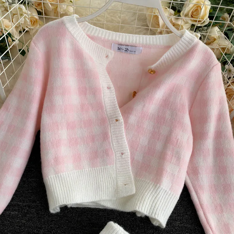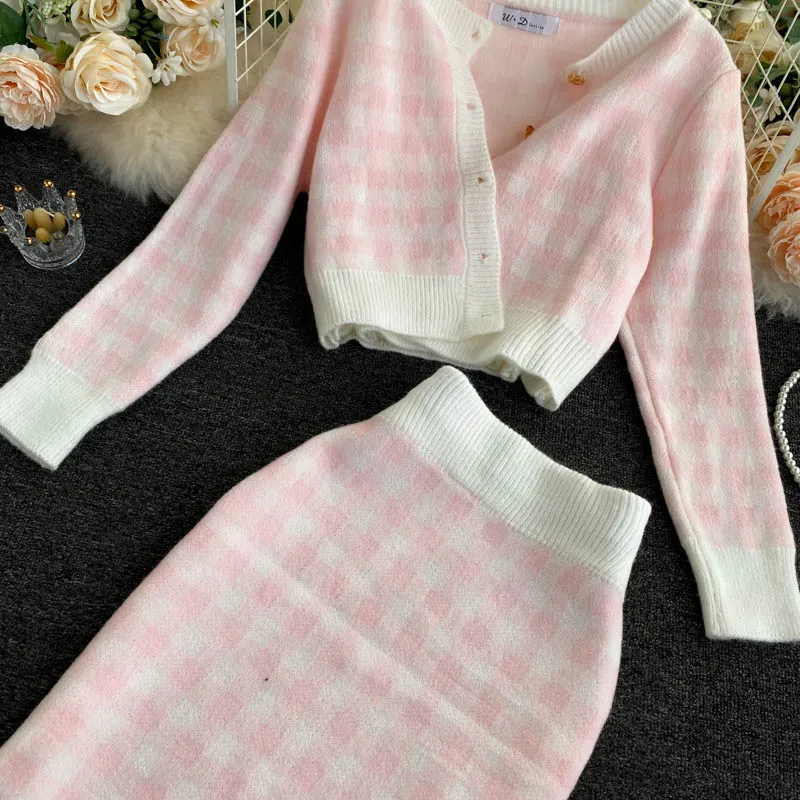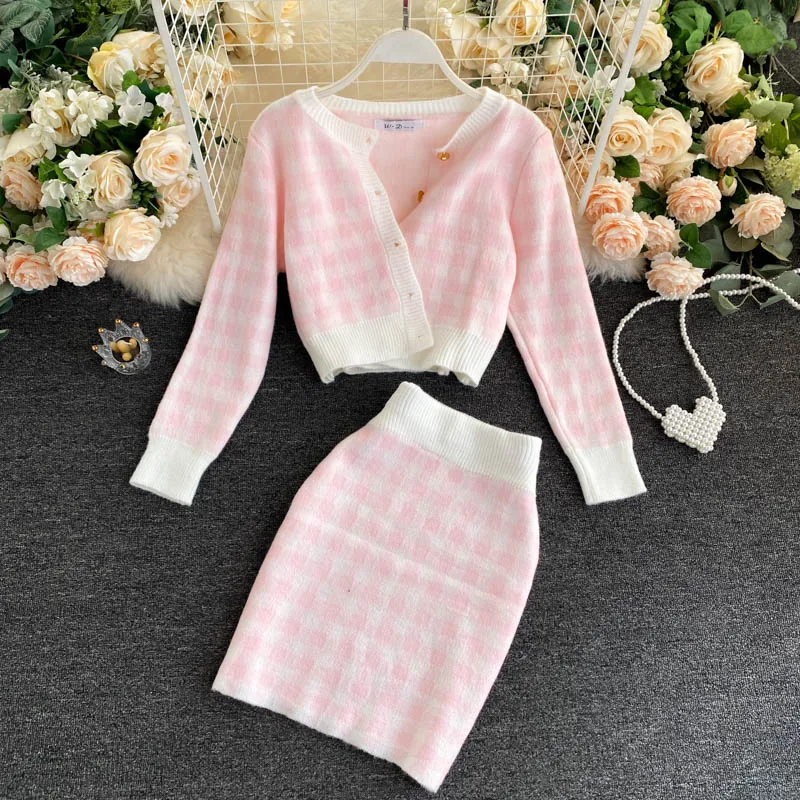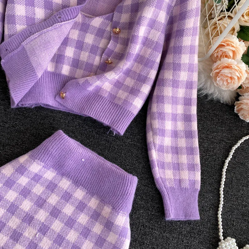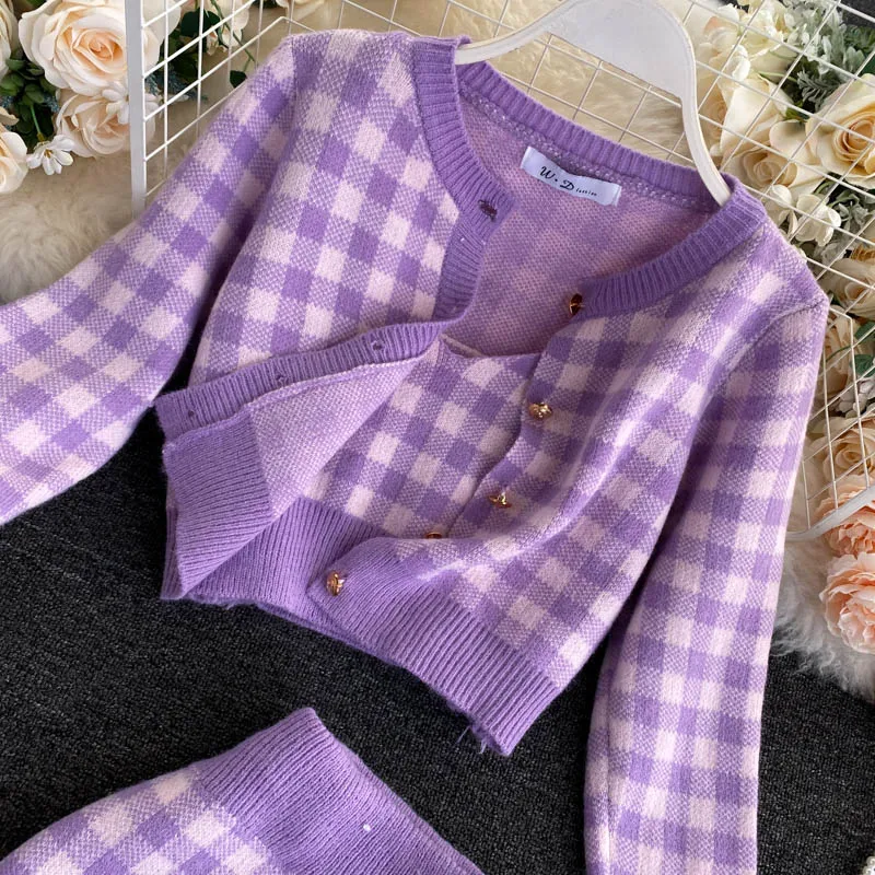 2021 Fashion Women Clothing Suit Long Sleeve Knit Cardigans+V-neck Crop Top Vest+Bodycon Skirt 3 Piece Set Casual Plaid Sweater