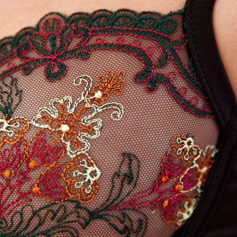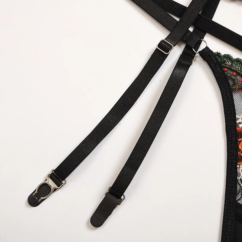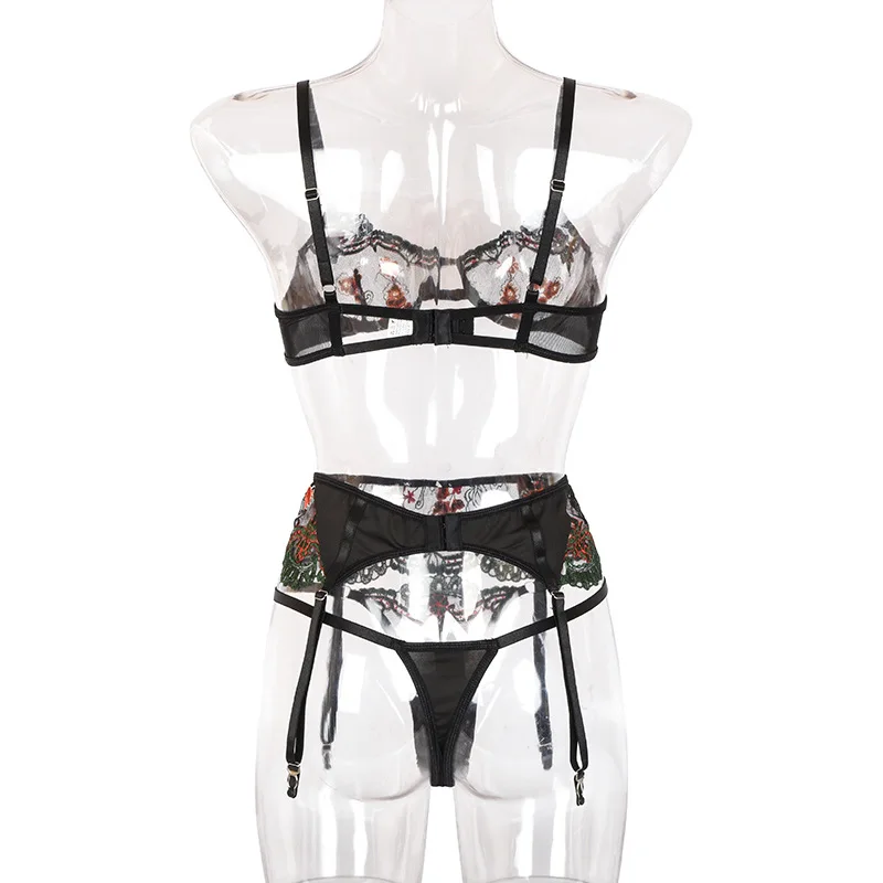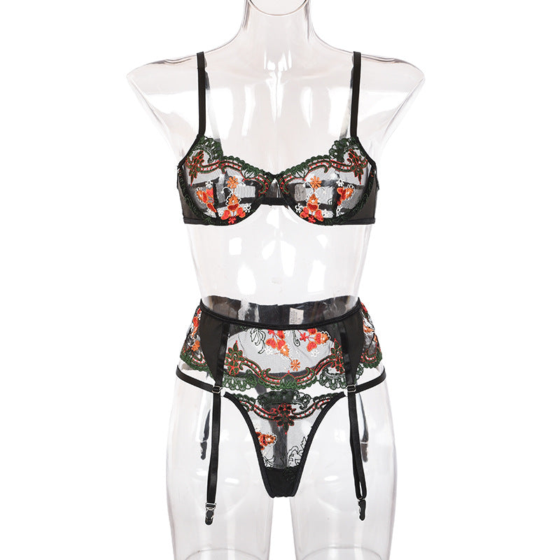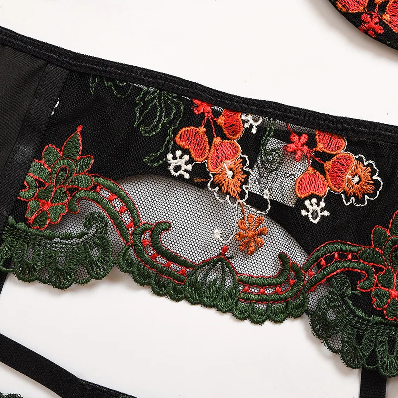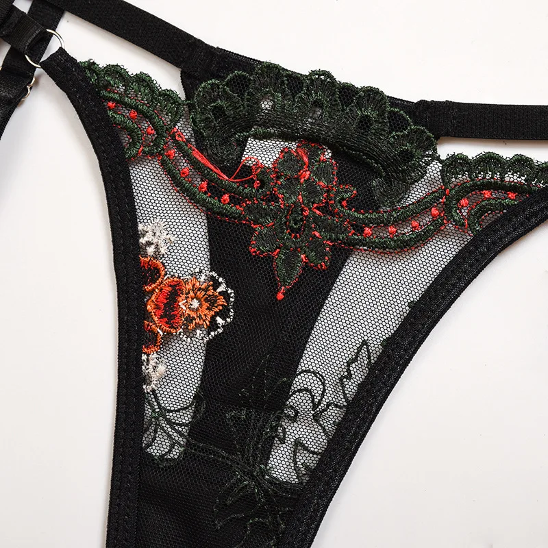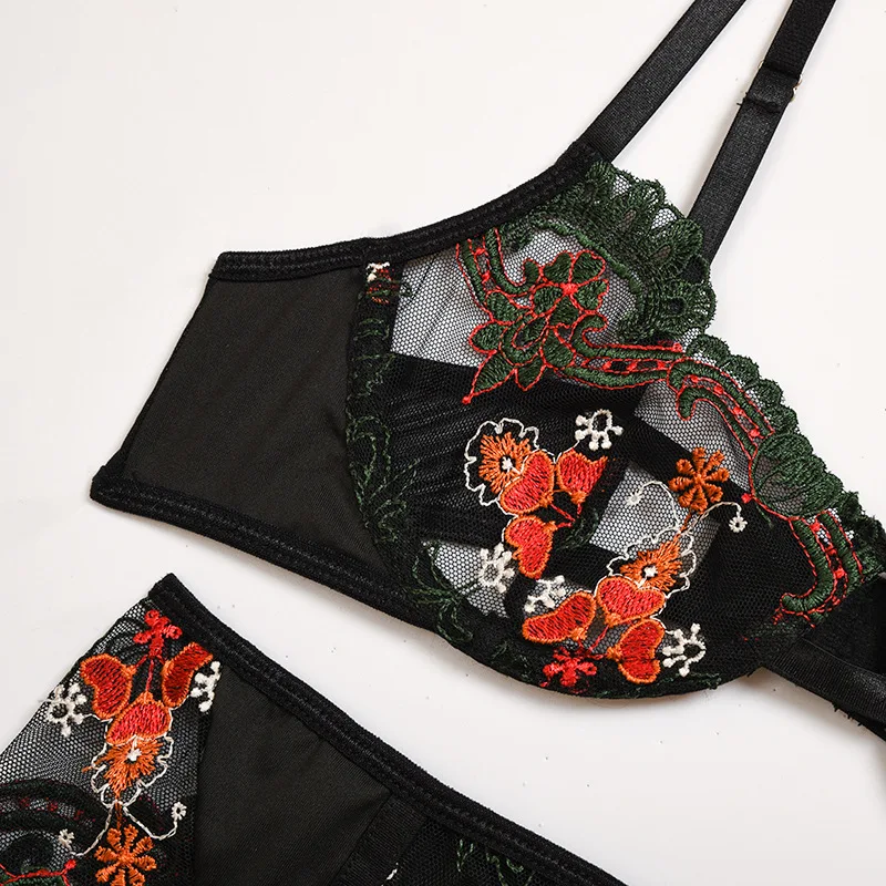 2021 Lace Perspective Flower Embroidered Sexy Lingerie Set Underwire Gathers Bra Panties Garters See-through Erotic Thong Suit