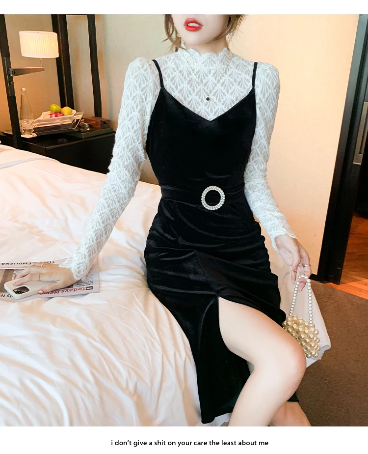 2021 Long Sleeve Lace Stand Collar Top High Waist Split Fork Slim Golden Velvet Sling Dress Women Autumn 2 Piece Clothes Set
