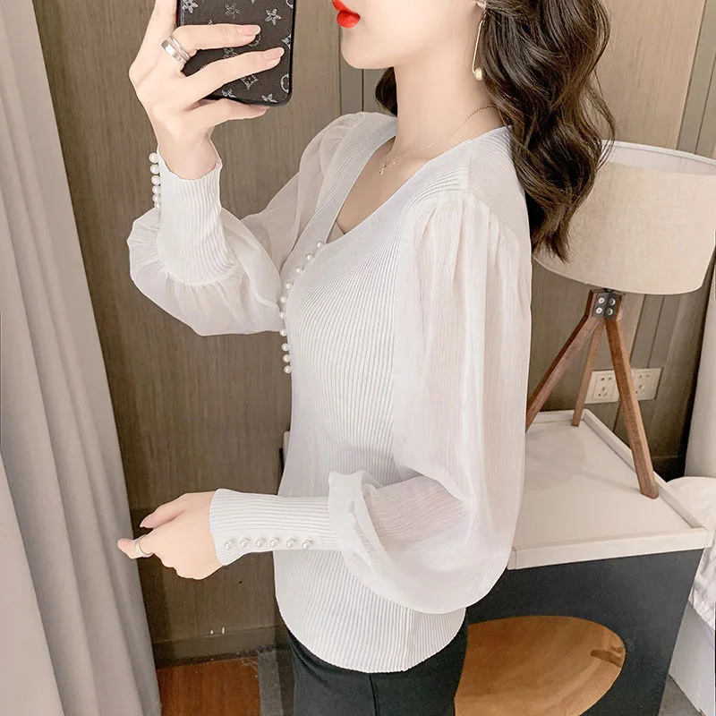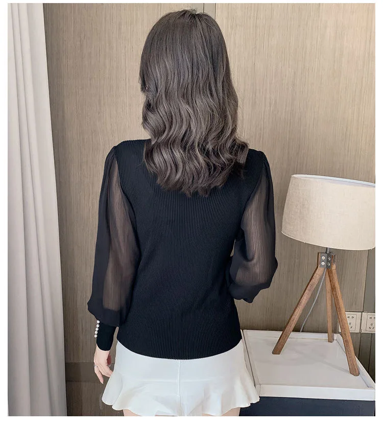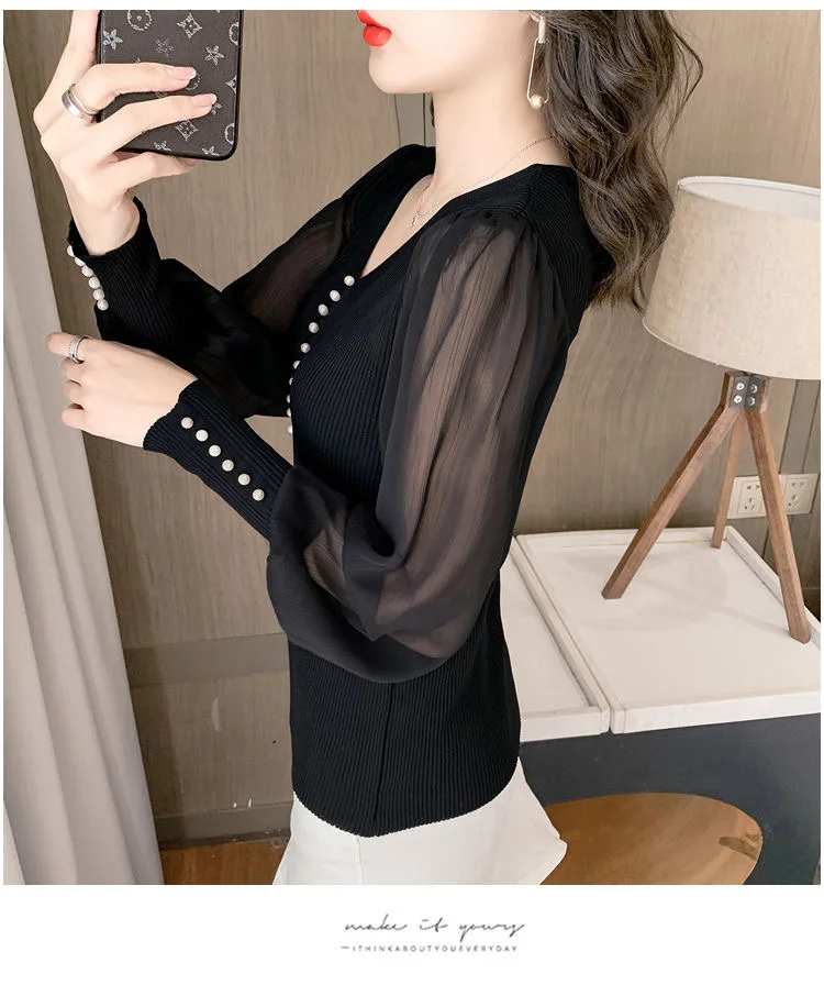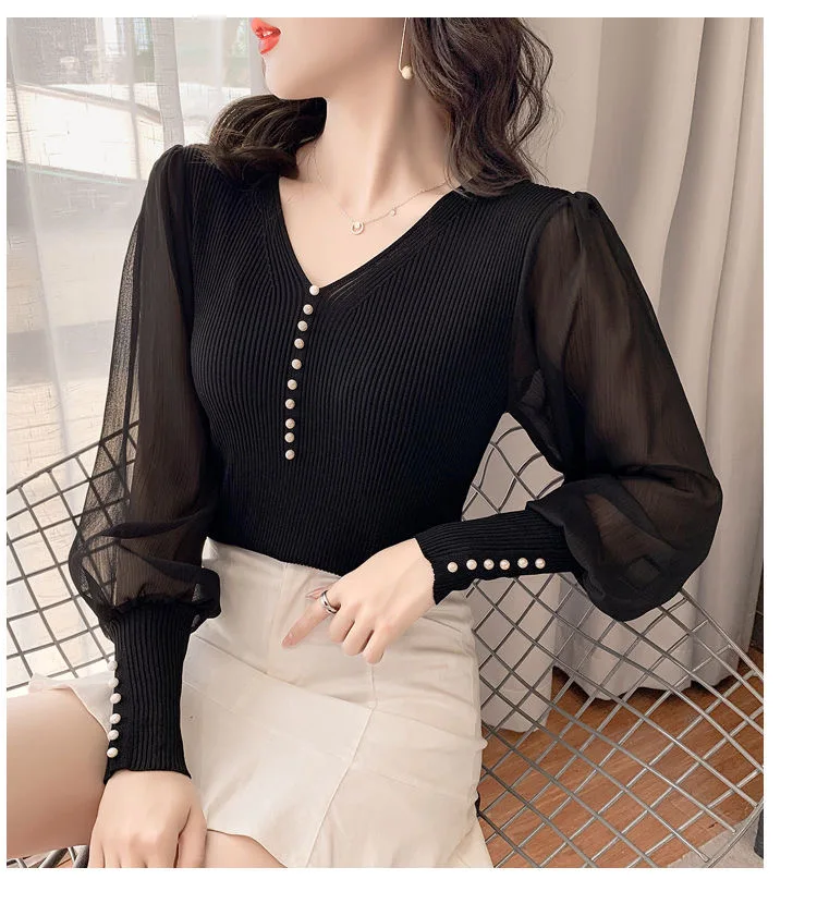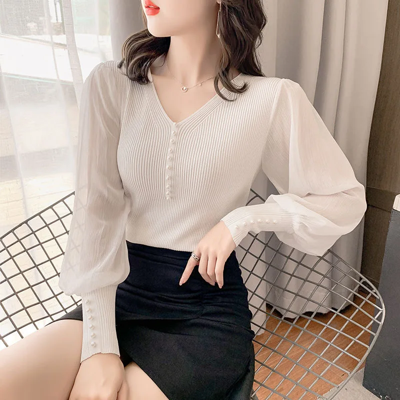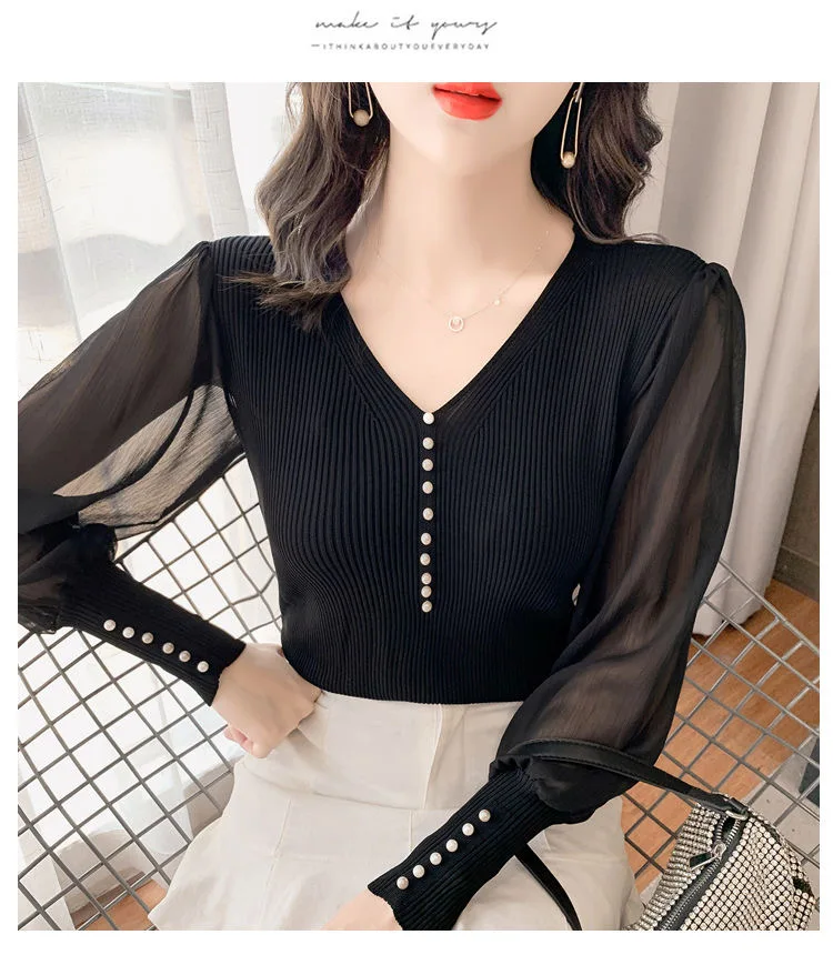 2021 New Black V-neck Elegant Pullover Top Harajuku Bottoming Shirt White Chiffon Bubble Knit Sexy Slim Sweater For Women Autumn