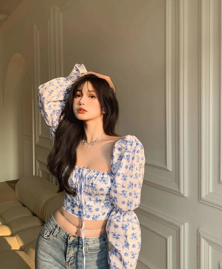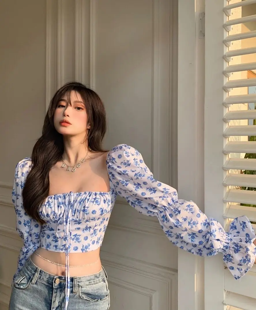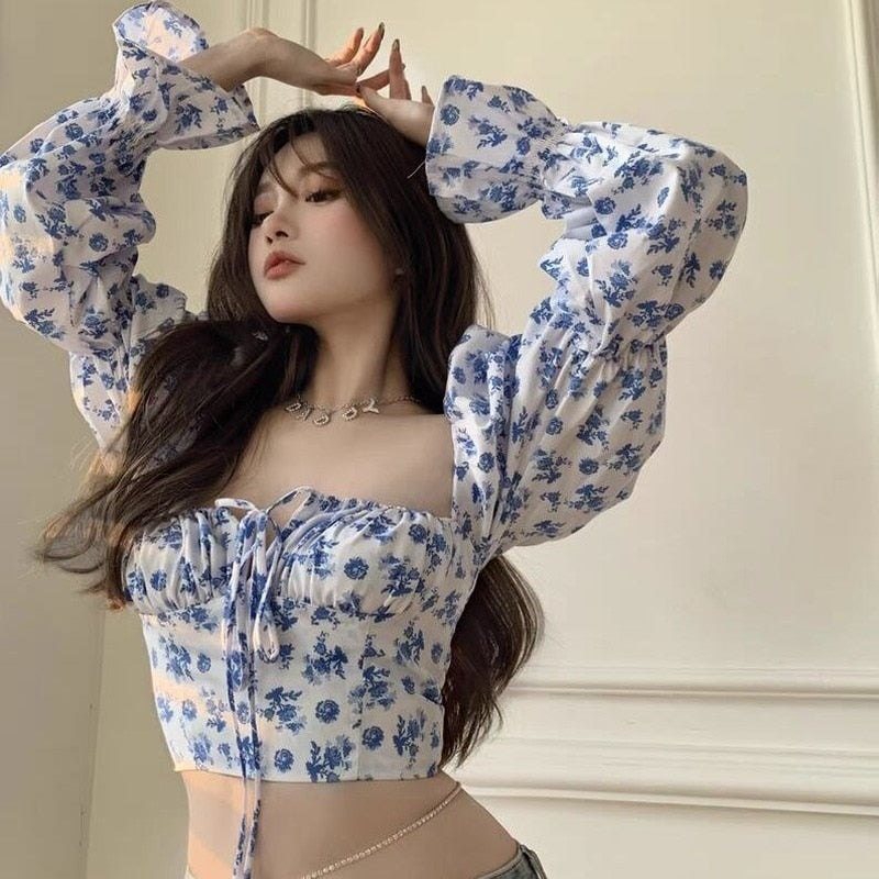 2021 New Floral Top Women White Sweet Square Neck Long Puff Sleeve Ruched Drawstring Crop Top Summer Woman Party Blouse