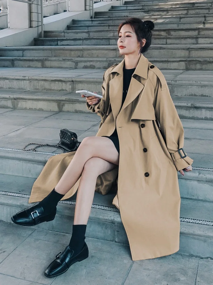 2021 New Women's Fashion Windbreaker Women's Middle Long Khaki Korean Loose Knee Length British Style Coat