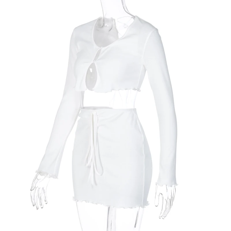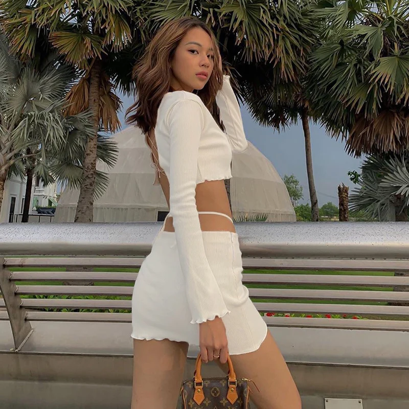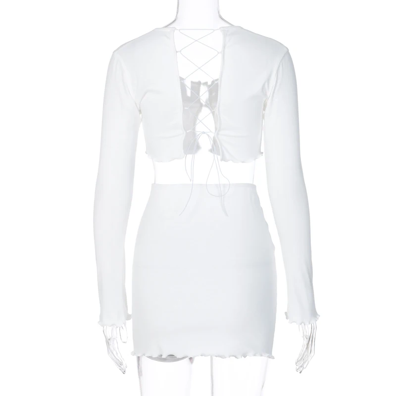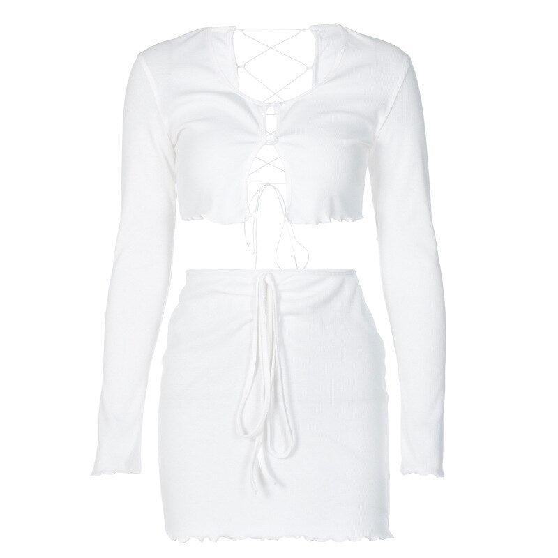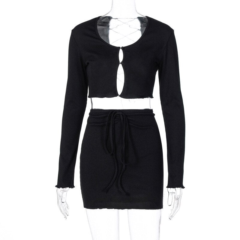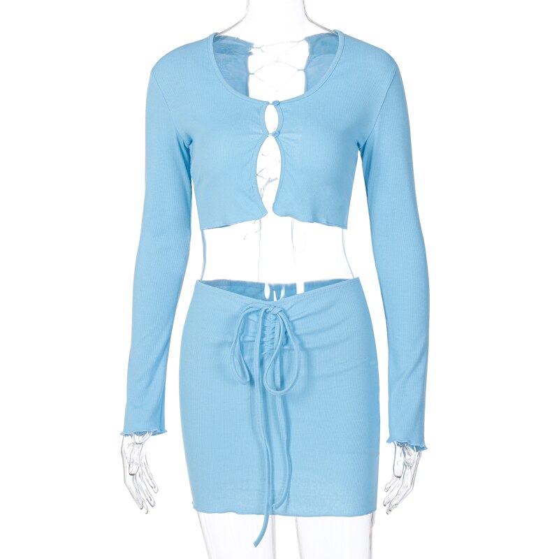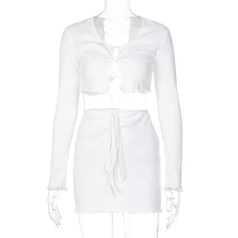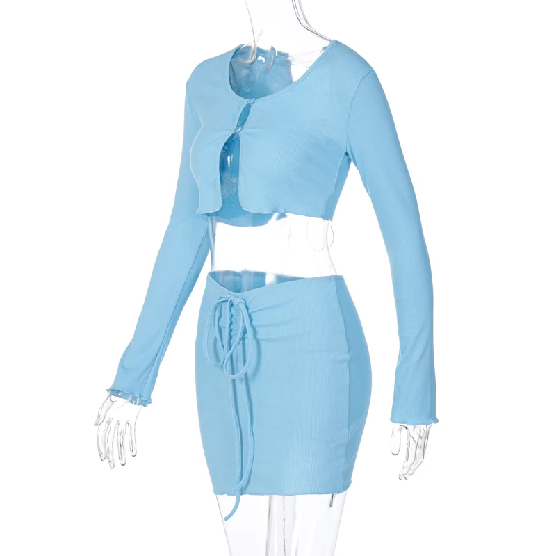 2021 Ribbed Lace Up Hollow Out Women 2 Piece Set Crop Top Cardigan Mini Skirt Bodycon Sexy Streetwear Club Matching Outfit