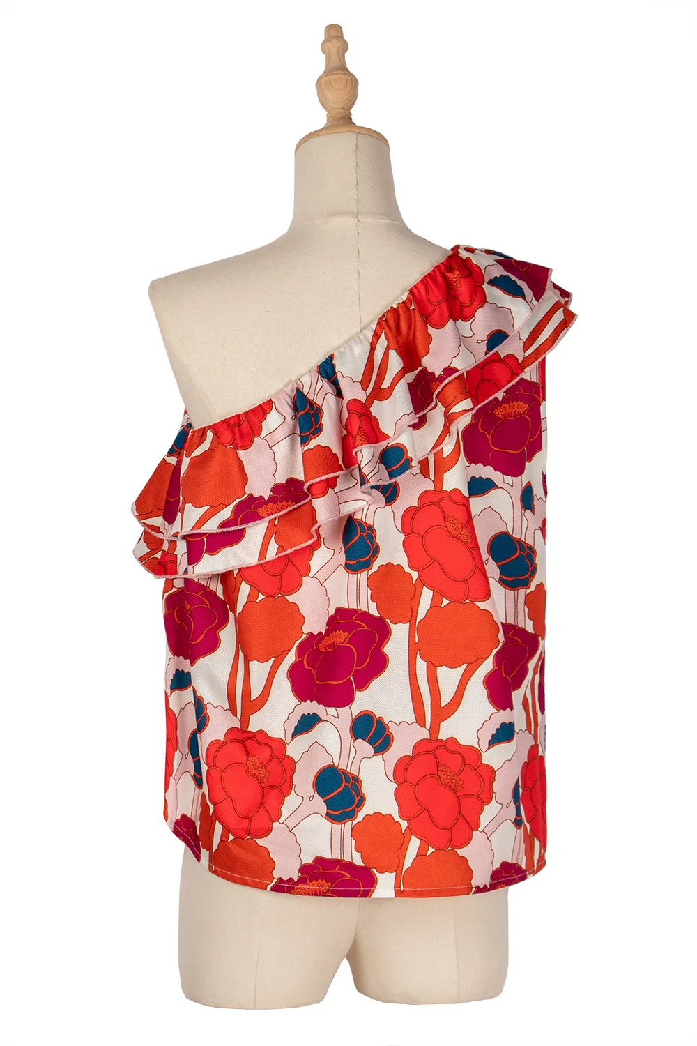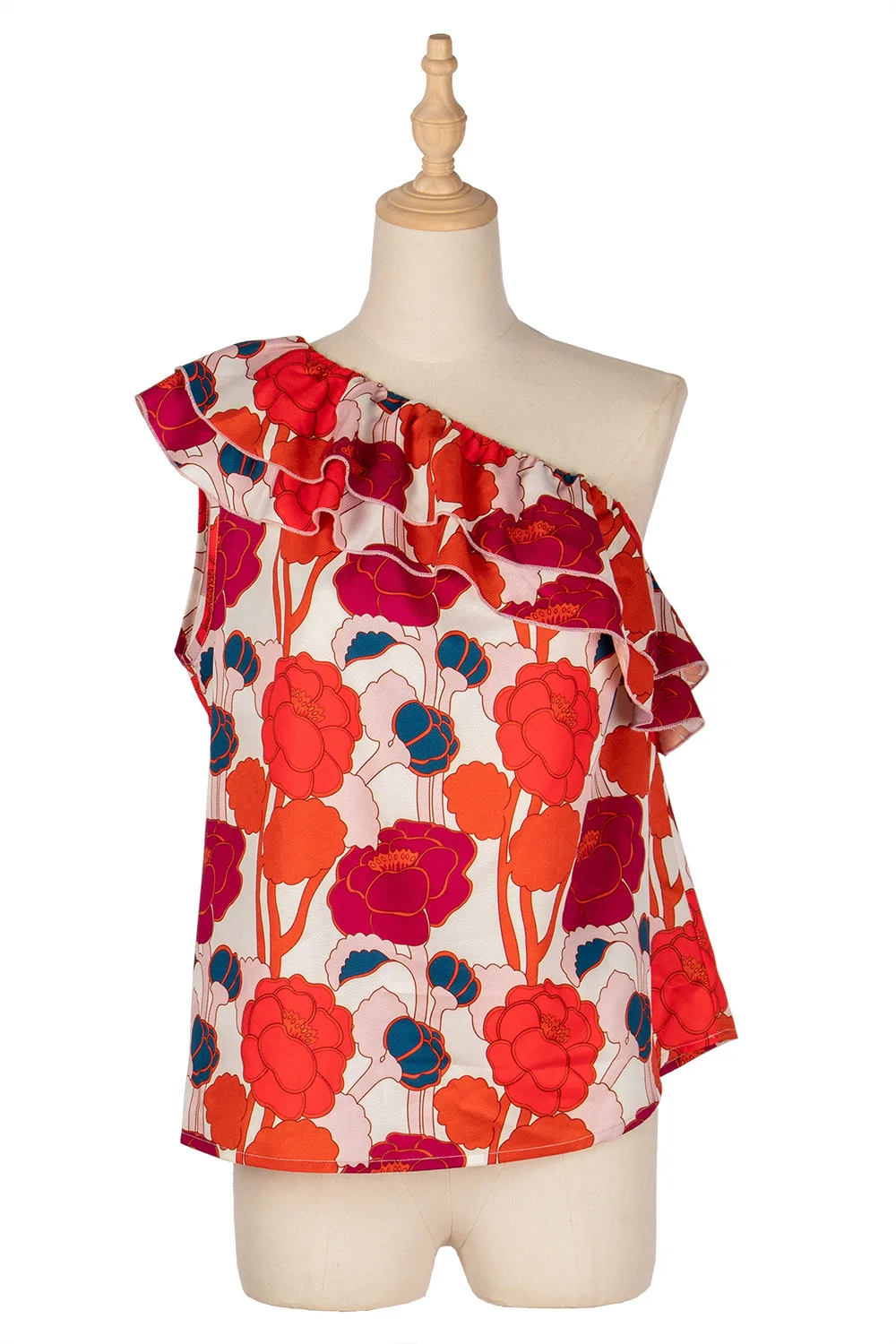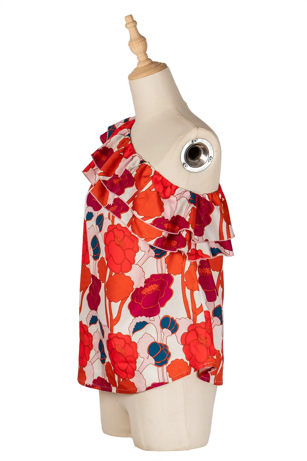2021 Spring Summer Sexy Floral One Shoulder Top For Women Kawaii Ladies Red Tiered Ruffle Open Back Flower Print Blouse