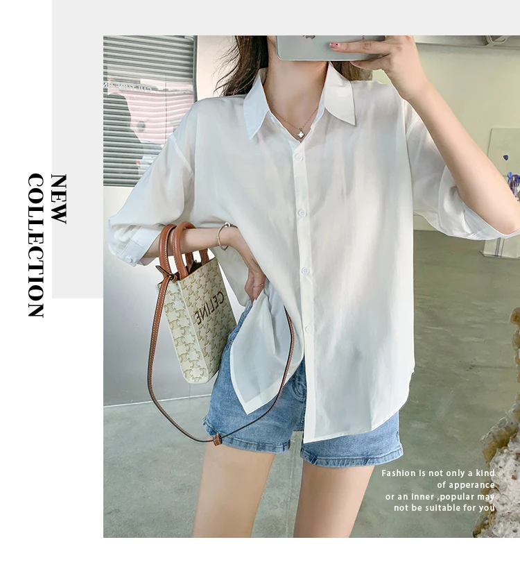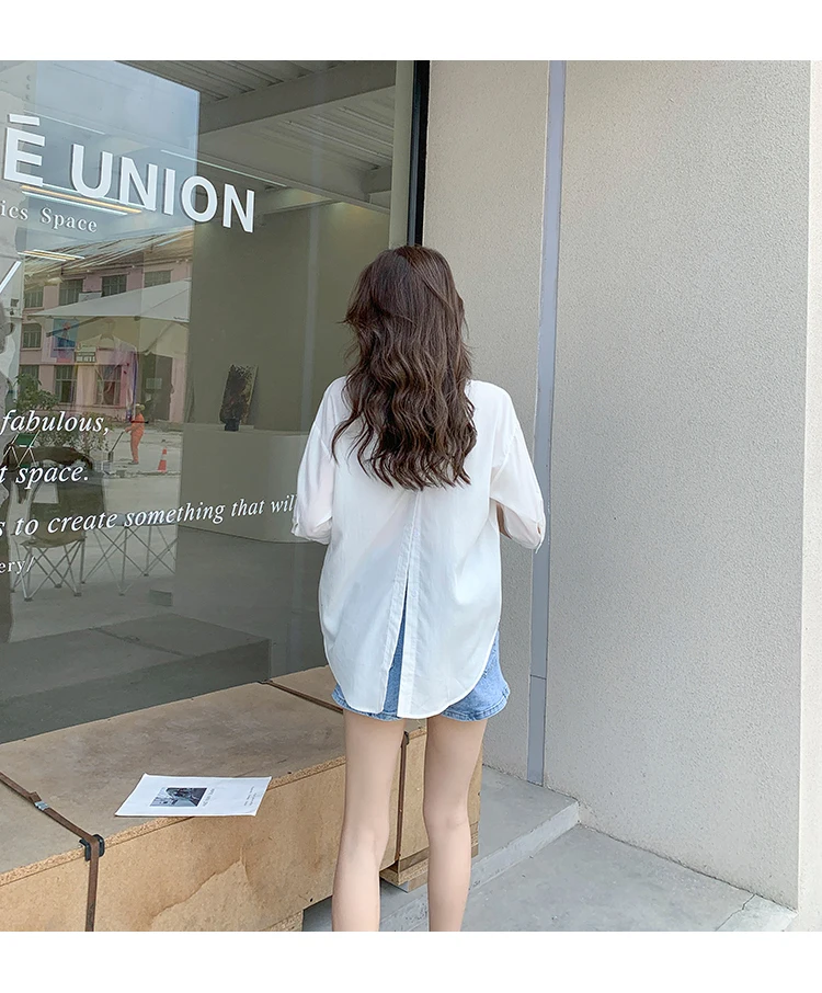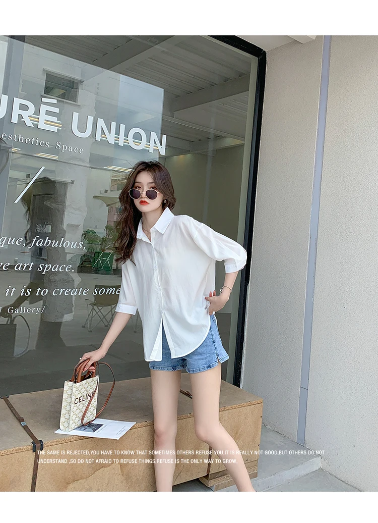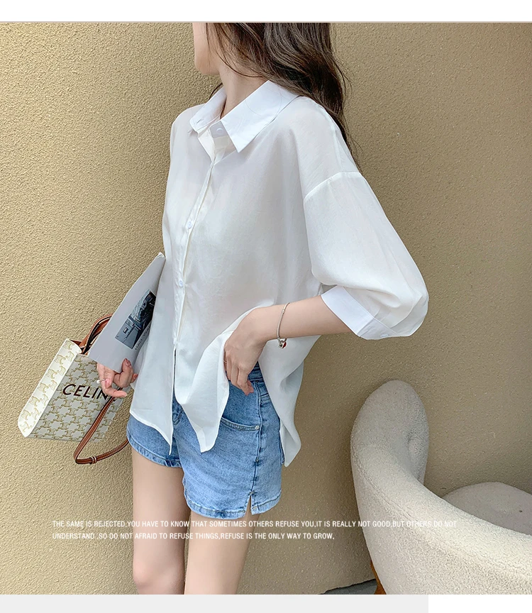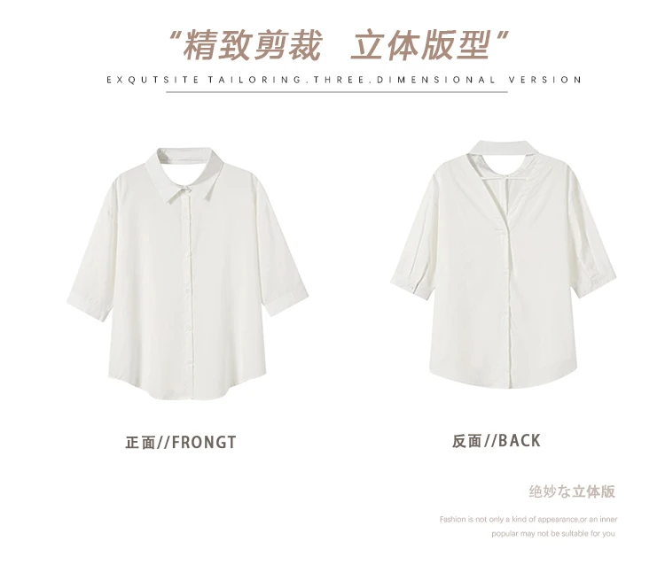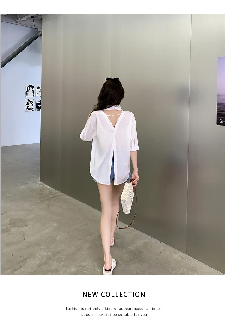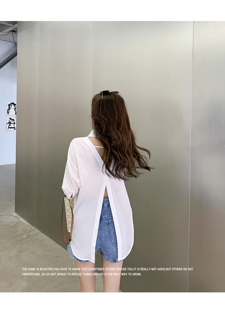 2021 Summer Lapel white medium sleeve temperament fashionable loose shirt workwear versatile sexy backless show thin elegant off