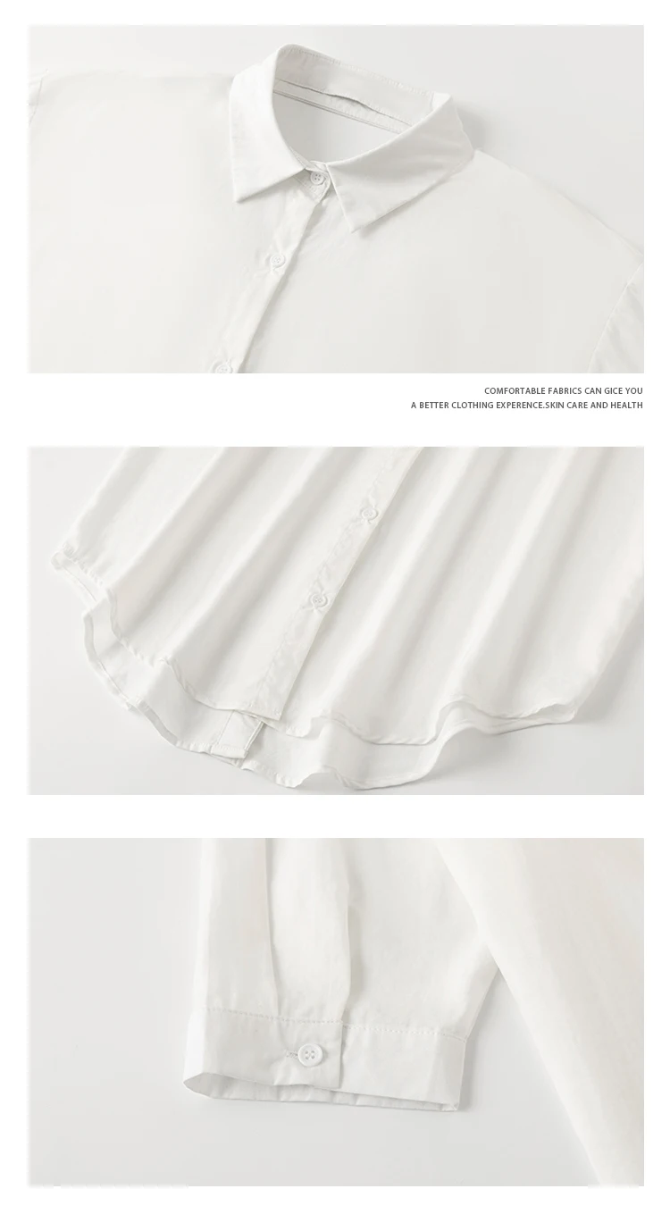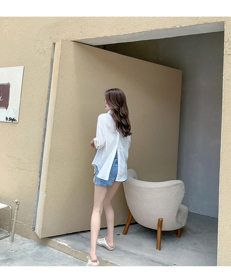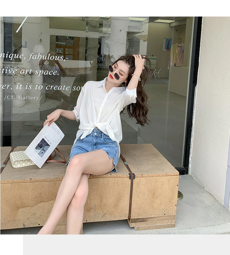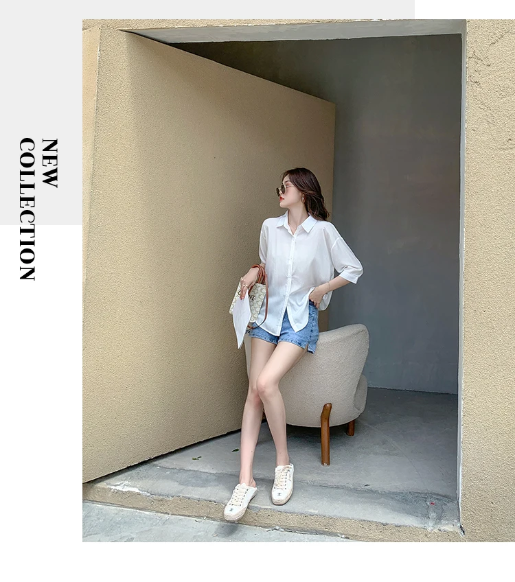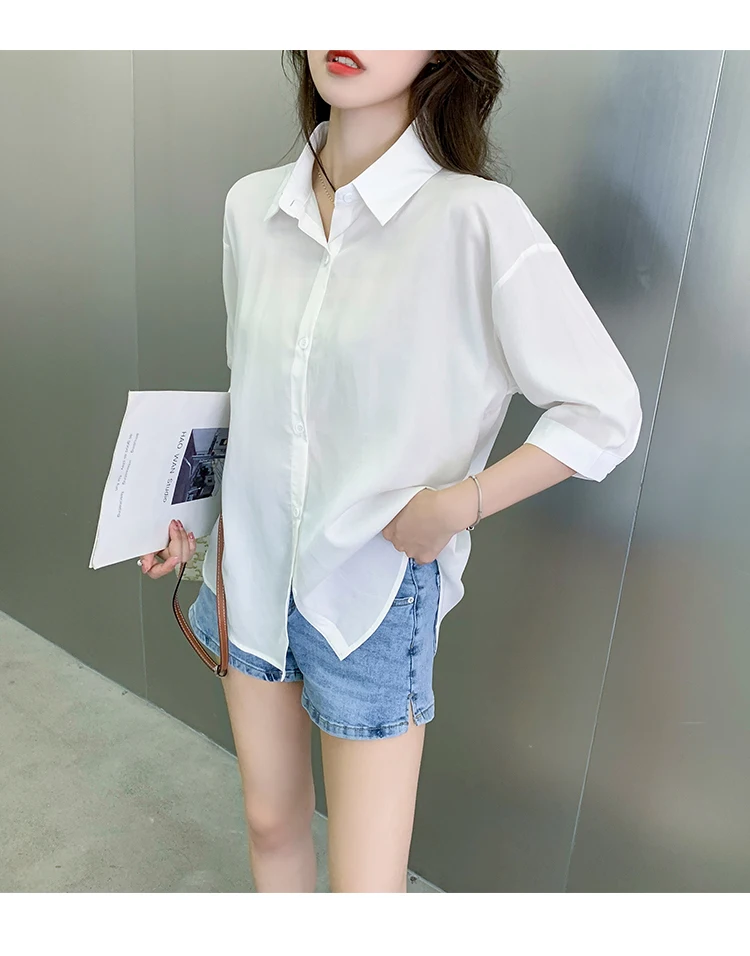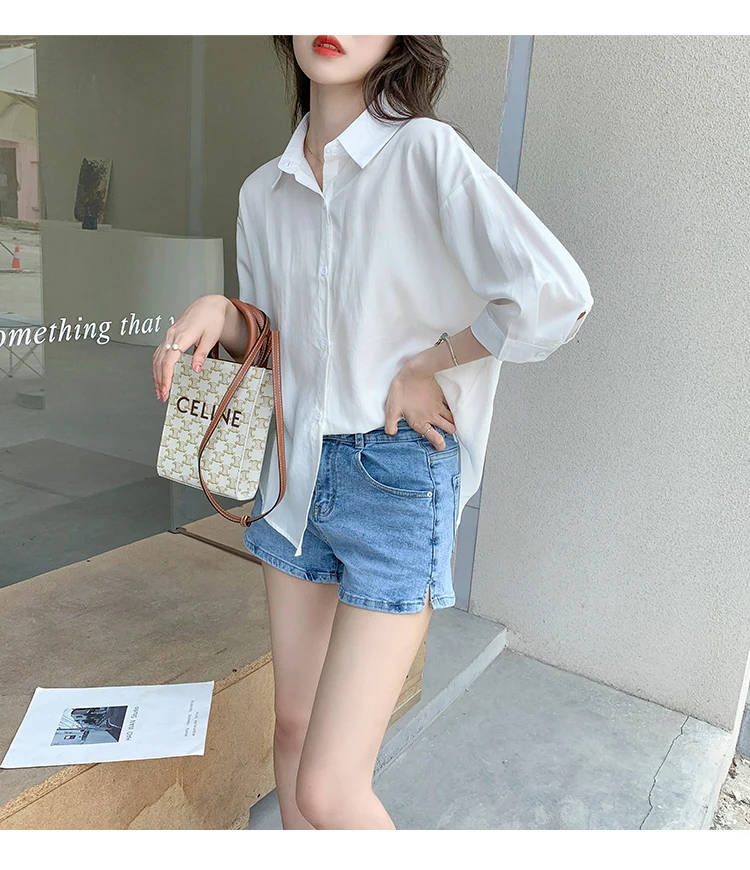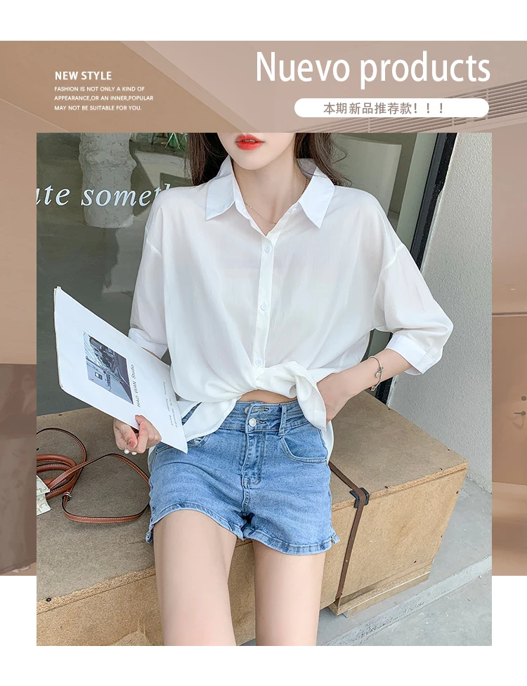 2021 Summer Lapel white medium sleeve temperament fashionable loose shirt workwear versatile sexy backless show thin elegant off