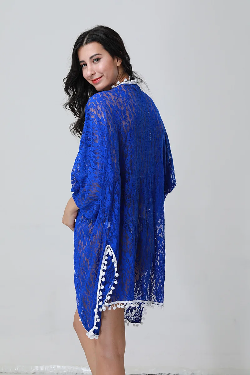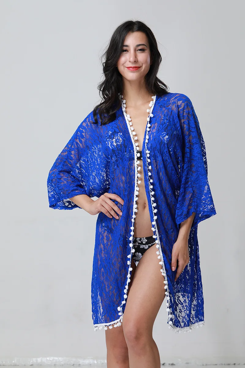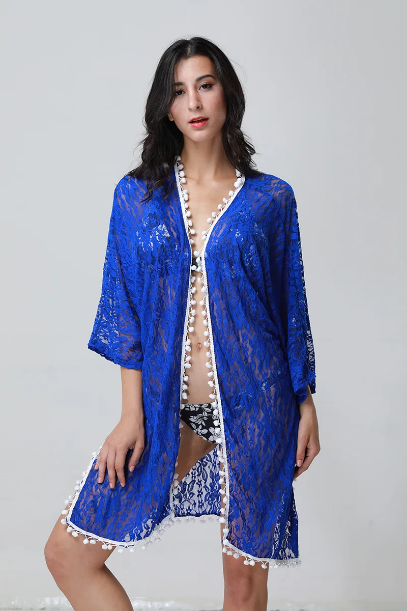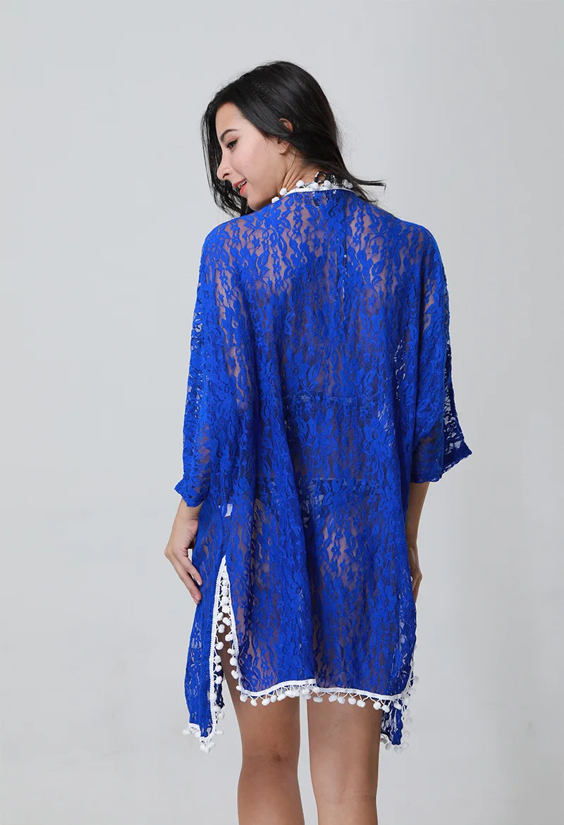 2021 Summer New Blue Camellia Cardigan Blouse Sexy Lace Quarter Sleeve Women