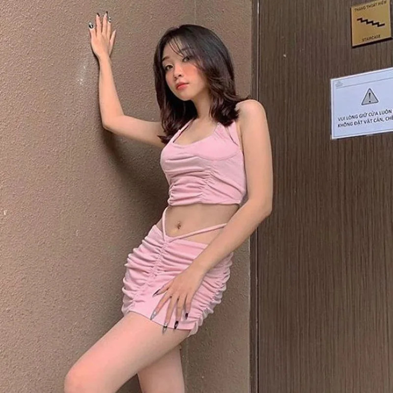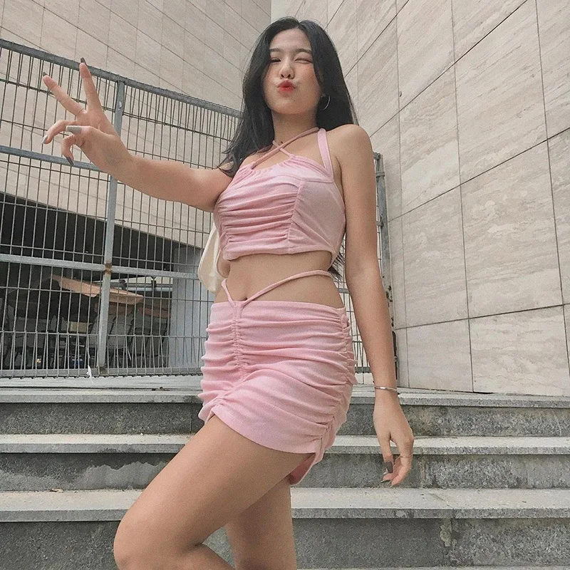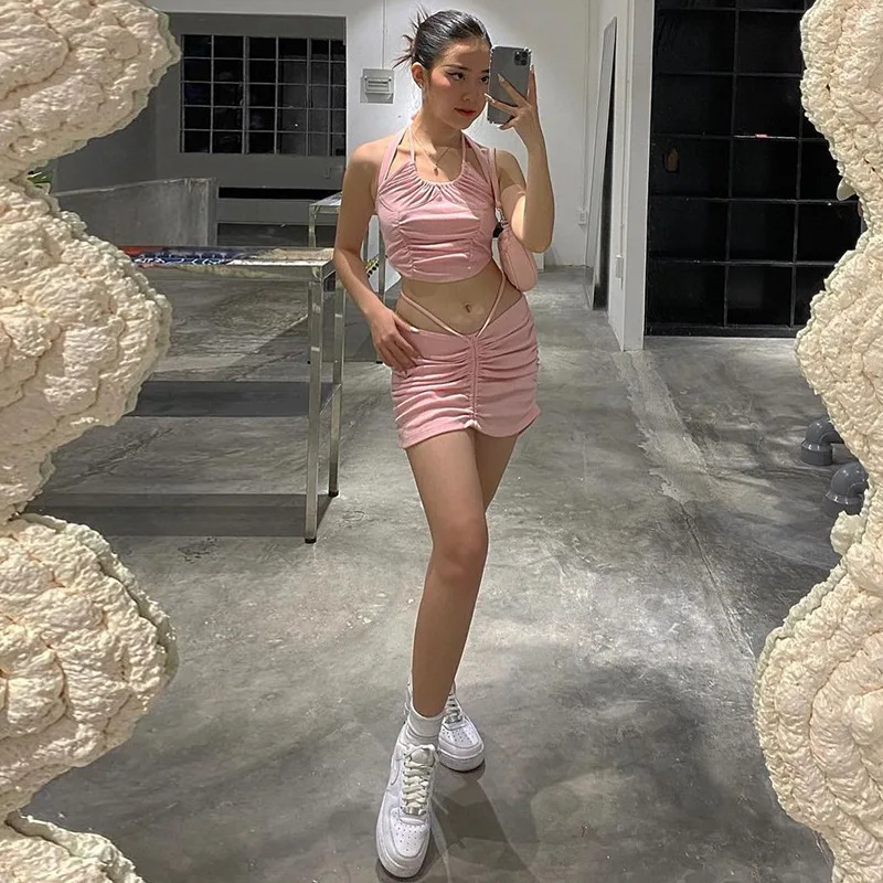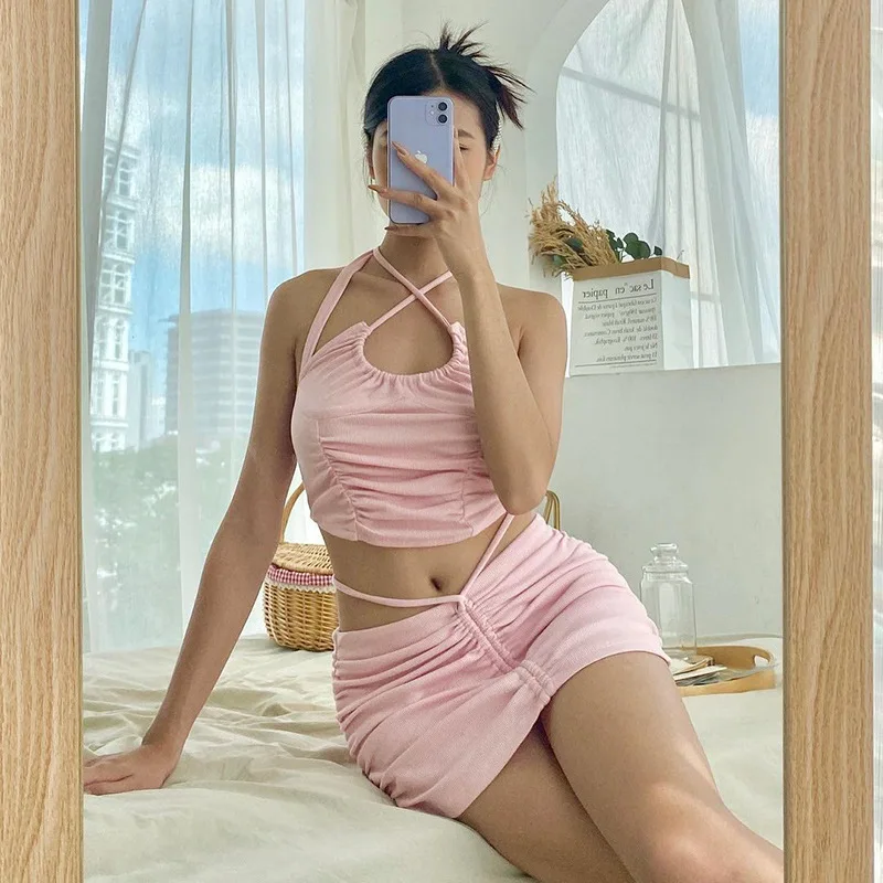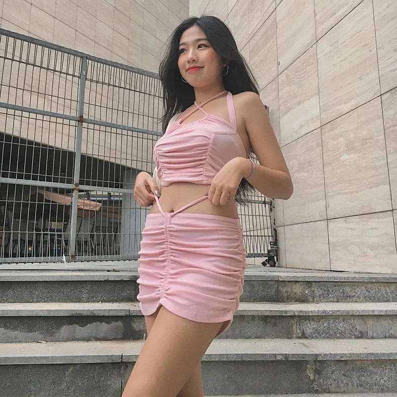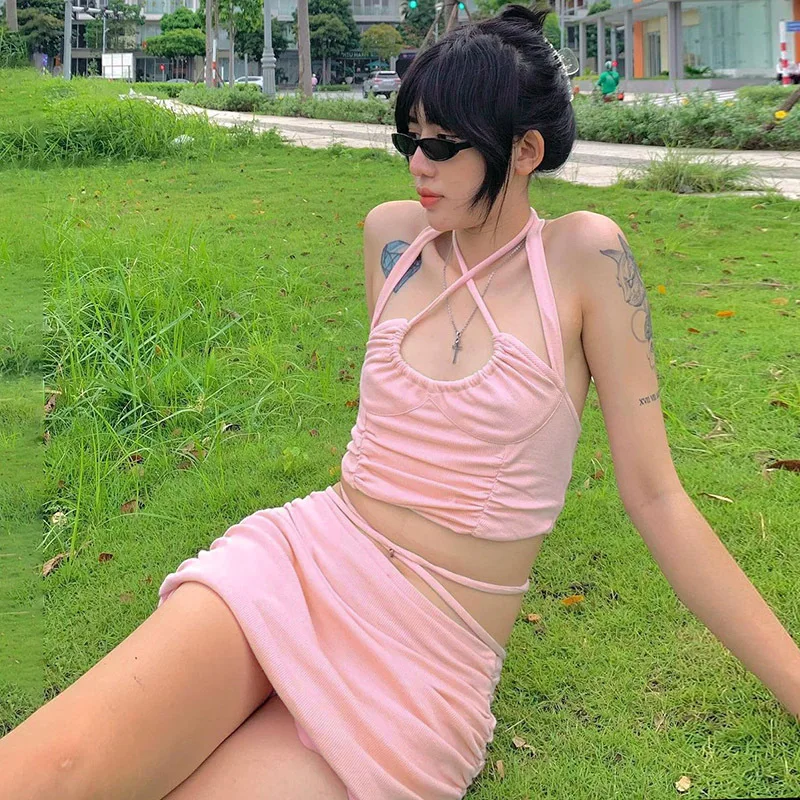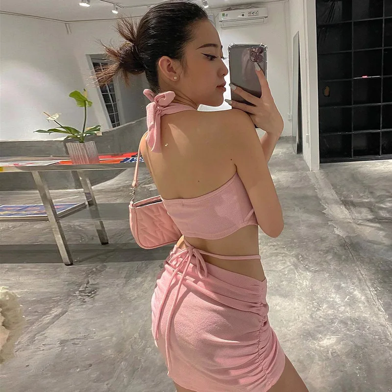 2021 Summer New Fashion Street Style Sexy Lace-Up Crop Top Slim Fit Skirt Set