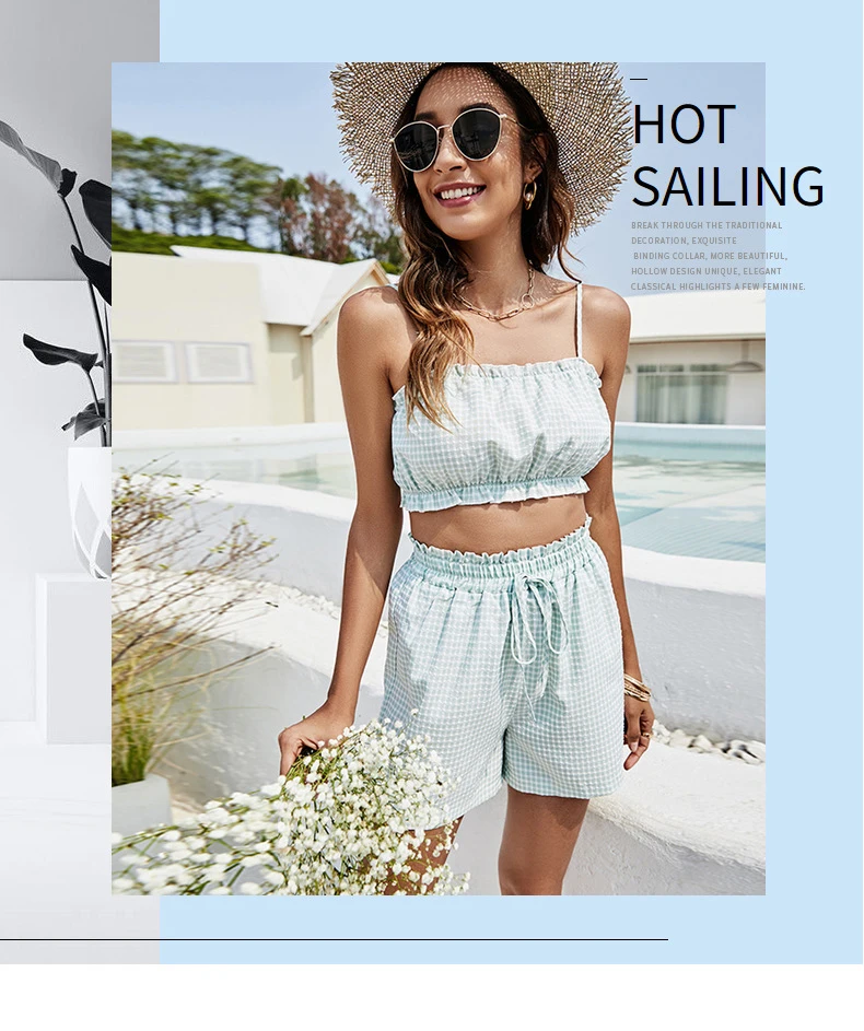 2021 Summer New Fashion Women's Suspender Shorts Exposed Umbilical Sexy Plaid Wrapped Chest Drawstring Two-Piece Suit