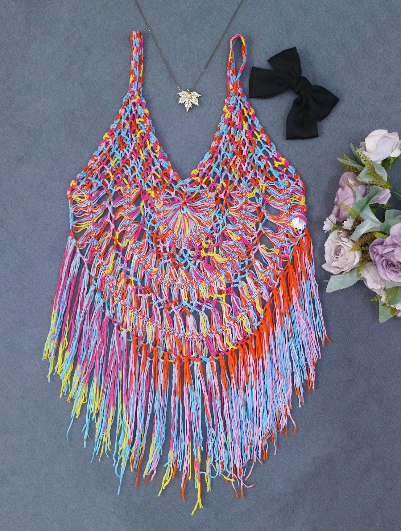 2021 Summer New Sexy Perspective Handmade Crochet Tassel Stitching Beach Bikini Top Suspender Skirt