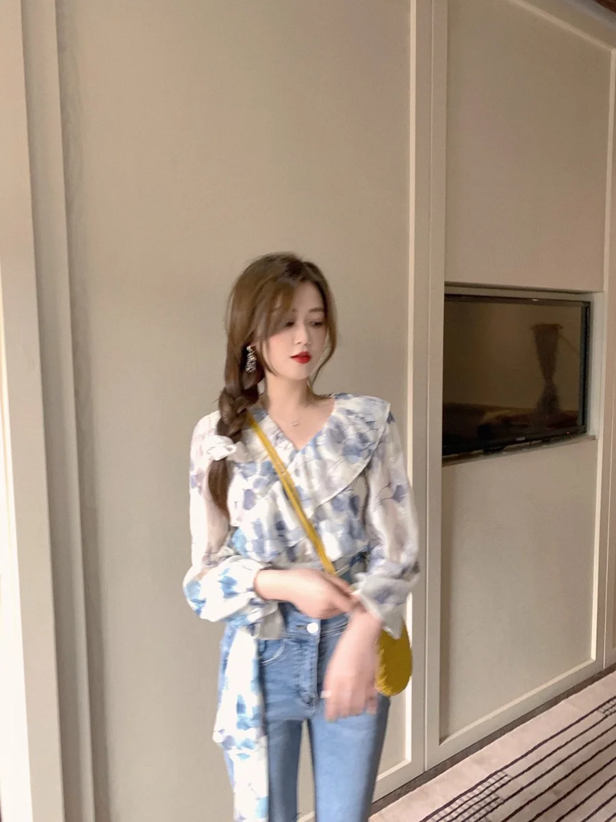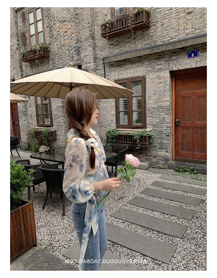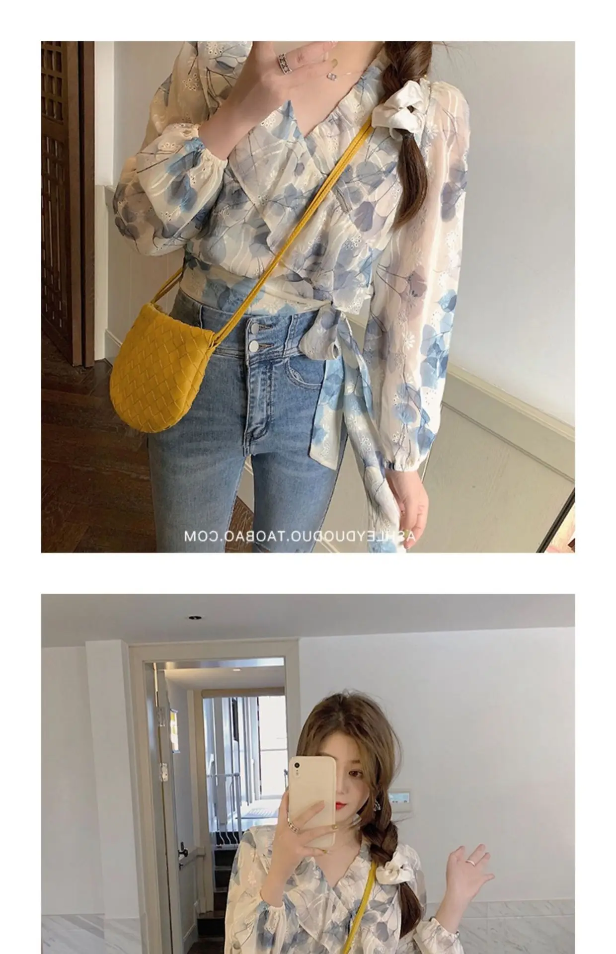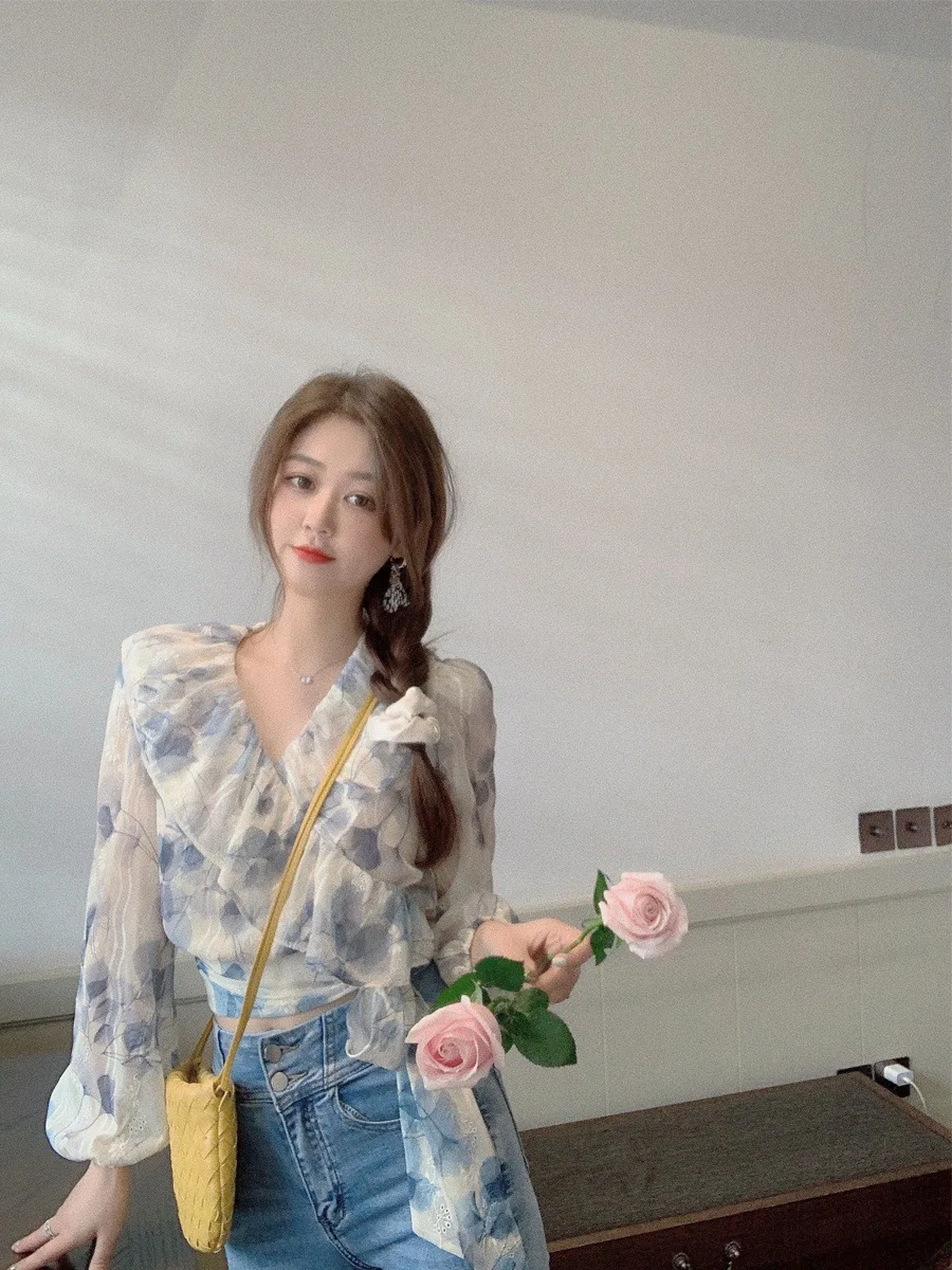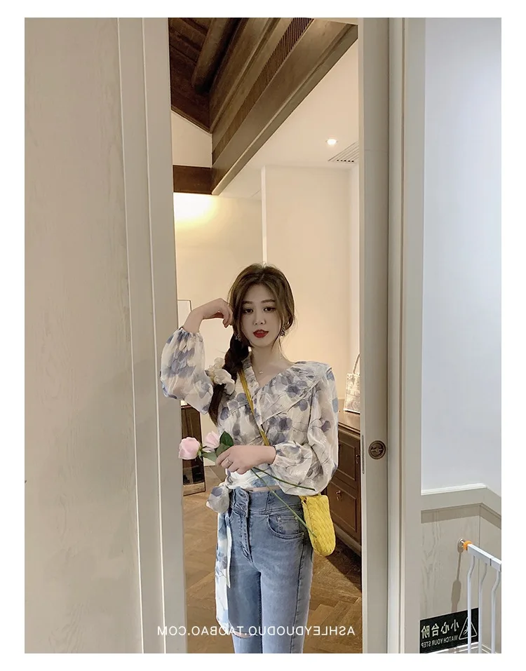 2021 Summer new spring V-neck top temperament chiffon shirt sweet floral shirt women's design